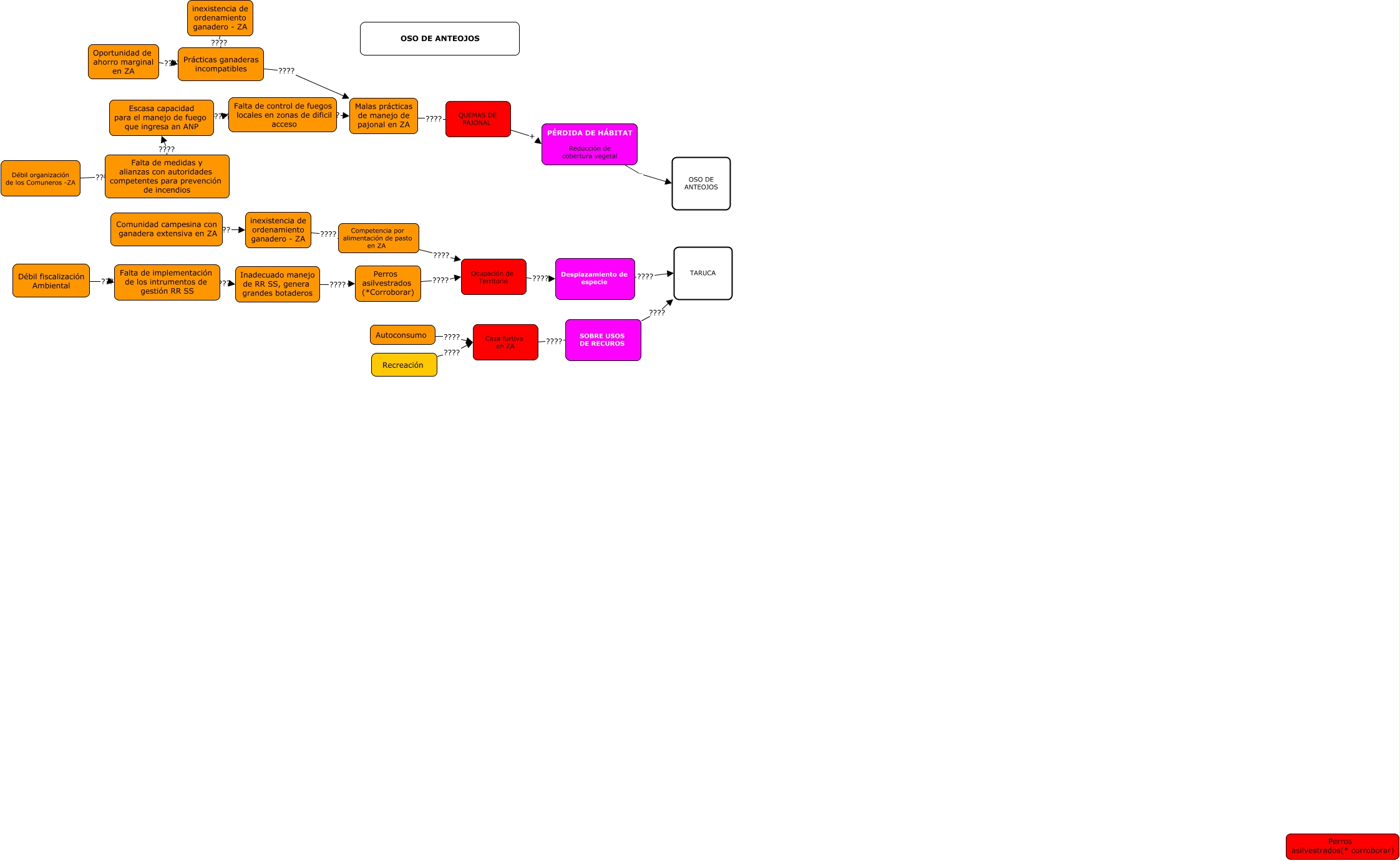 This Concept Map, created with IHMC CmapTools, has information related to: OSO DE ANTEOJOS 02.05.22, SOBRE USOS DE RECUROS ???? TARUCA, inexistencia de ordenamiento ganadero - ZA ???? Prácticas ganaderas incompatibles, Débil fiscalización Ambiental ???? Falta de implementación de los intrumentos de gestión RR SS, Caza furtiva en ZA ???? SOBRE USOS DE RECUROS, Falta de control de fuegos locales en zonas de dificil acceso ???? Malas prácticas de manejo de pajonal en ZA, Falta de medidas y alianzas con autoridades competentes para prevención de incendios ???? Escasa capacidad para el manejo de fuego que ingresa an ANP, Competencia por alimentación de pasto en ZA ???? Ocupación de Territorio, Débil organización de los Comuneros -ZA ???? Falta de medidas y alianzas con autoridades competentes para prevención de incendios, inexistencia de ordenamiento ganadero - ZA ???? Competencia por alimentación de pasto en ZA, PÉRDIDA DE HÁBITAT Reducción de cobertura vegetal - OSO DE ANTEOJOS, Malas prácticas de manejo de pajonal en ZA ???? QUEMAS DE PAJONAL, Inadecuado manejo de RR SS, genera grandes botaderos ???? Perros asilvestrados (*Corroborar), Escasa capacidad para el manejo de fuego que ingresa an ANP ???? Falta de control de fuegos locales en zonas de dificil acceso, Comunidad campesina con ganadera extensiva en ZA ???? inexistencia de ordenamiento ganadero - ZA, Falta de implementación de los intrumentos de gestión RR SS ???? Inadecuado manejo de RR SS, genera grandes botaderos, Prácticas ganaderas incompatibles ???? Malas prácticas de manejo de pajonal en ZA, Desplazamiento de especie ???? TARUCA, Oportunidad de ahorro marginal en ZA ???? Prácticas ganaderas incompatibles, Ocupación de Territorio ???? Desplazamiento de especie, Recreación ???? Caza furtiva en ZA