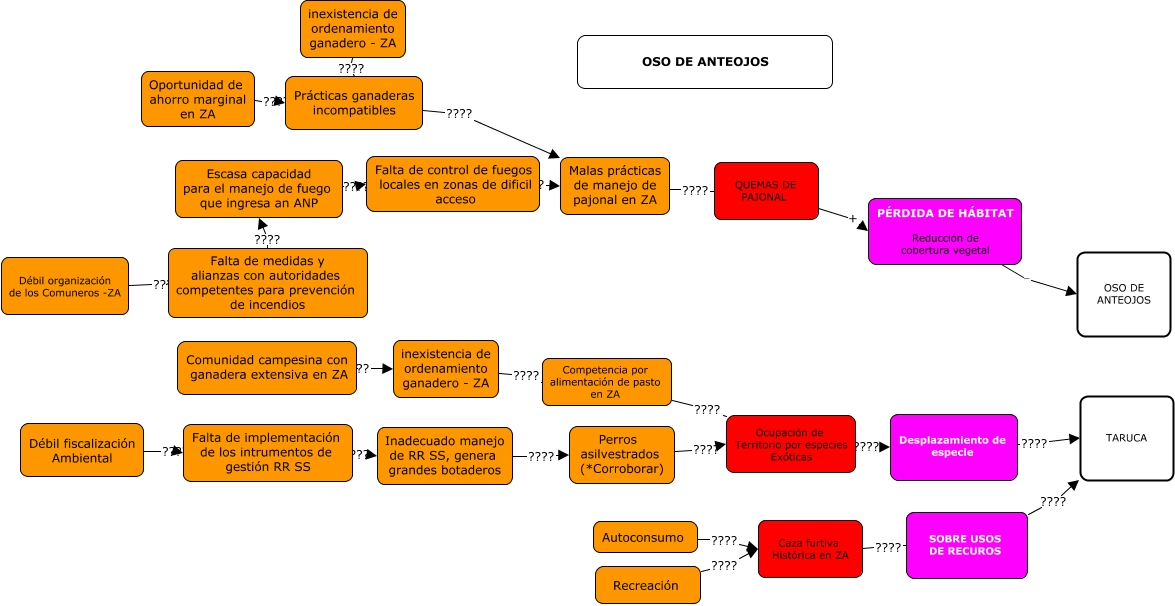 This Concept Map, created with IHMC CmapTools, has information related to: OSO DE ANTEOJOS_Estrategias_04.05.22, SOBRE USOS DE RECUROS ???? TARUCA, inexistencia de ordenamiento ganadero - ZA ???? Prácticas ganaderas incompatibles, Débil fiscalización Ambiental ???? Falta de implementación de los intrumentos de gestión RR SS, Caza furtiva Histórica en ZA ???? SOBRE USOS DE RECUROS, Falta de control de fuegos locales en zonas de dificil acceso ???? Malas prácticas de manejo de pajonal en ZA, Falta de medidas y alianzas con autoridades competentes para prevención de incendios ???? Escasa capacidad para el manejo de fuego que ingresa an ANP, Competencia por alimentación de pasto en ZA ???? Ocupación de Territorio por especies Exóticas, Débil organización de los Comuneros -ZA ???? Falta de medidas y alianzas con autoridades competentes para prevención de incendios, inexistencia de ordenamiento ganadero - ZA ???? Competencia por alimentación de pasto en ZA, PÉRDIDA DE HÁBITAT Reducción de cobertura vegetal - OSO DE ANTEOJOS, Malas prácticas de manejo de pajonal en ZA ???? QUEMAS DE PAJONAL, Inadecuado manejo de RR SS, genera grandes botaderos ???? Perros asilvestrados (*Corroborar), Escasa capacidad para el manejo de fuego que ingresa an ANP ???? Falta de control de fuegos locales en zonas de dificil acceso, Comunidad campesina con ganadera extensiva en ZA ???? inexistencia de ordenamiento ganadero - ZA, Falta de implementación de los intrumentos de gestión RR SS ???? Inadecuado manejo de RR SS, genera grandes botaderos, Prácticas ganaderas incompatibles ???? Malas prácticas de manejo de pajonal en ZA, Desplazamiento de especie ???? TARUCA, Oportunidad de ahorro marginal en ZA ???? Prácticas ganaderas incompatibles, Ocupación de Territorio por especies Exóticas ???? Desplazamiento de especie, Recreación ???? Caza furtiva Histórica en ZA