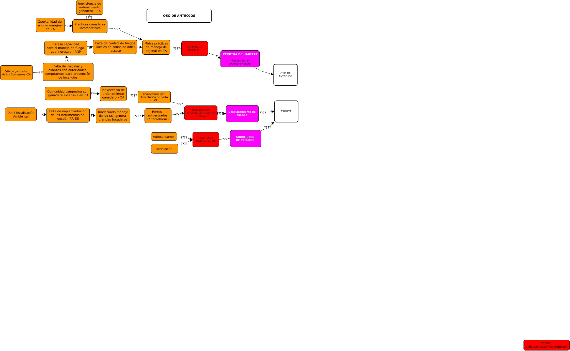 This Concept Map, created with IHMC CmapTools, has information related to: OSO DE ANTEOJOS_Taruca_04.05.22, SOBRE USOS DE RECUROS ???? TARUCA, inexistencia de ordenamiento ganadero - ZA ???? Prácticas ganaderas incompatibles, Débil fiscalización Ambiental ???? Falta de implementación de los intrumentos de gestión RR SS, Caza furtiva Histórica en ZA ???? SOBRE USOS DE RECUROS, Falta de control de fuegos locales en zonas de dificil acceso ???? Malas prácticas de manejo de pajonal en ZA, Falta de medidas y alianzas con autoridades competentes para prevención de incendios ???? Escasa capacidad para el manejo de fuego que ingresa an ANP, Competencia por alimentación de pasto en ZA ???? Ocupación de Territorio por especies Exóticas, Débil organización de los Comuneros -ZA ???? Falta de medidas y alianzas con autoridades competentes para prevención de incendios, inexistencia de ordenamiento ganadero - ZA ???? Competencia por alimentación de pasto en ZA, PÉRDIDA DE HÁBITAT Reducción de cobertura vegetal - OSO DE ANTEOJOS, Malas prácticas de manejo de pajonal en ZA ???? QUEMAS DE PAJONAL, Inadecuado manejo de RR SS, genera grandes botaderos ???? Perros asilvestrados (*Corroborar), Escasa capacidad para el manejo de fuego que ingresa an ANP ???? Falta de control de fuegos locales en zonas de dificil acceso, Comunidad campesina con ganadera extensiva en ZA ???? inexistencia de ordenamiento ganadero - ZA, Falta de implementación de los intrumentos de gestión RR SS ???? Inadecuado manejo de RR SS, genera grandes botaderos, Prácticas ganaderas incompatibles ???? Malas prácticas de manejo de pajonal en ZA, Desplazamiento de especie ???? TARUCA, Oportunidad de ahorro marginal en ZA ???? Prácticas ganaderas incompatibles, Ocupación de Territorio por especies Exóticas ???? Desplazamiento de especie, Recreación ???? Caza furtiva Histórica en ZA
