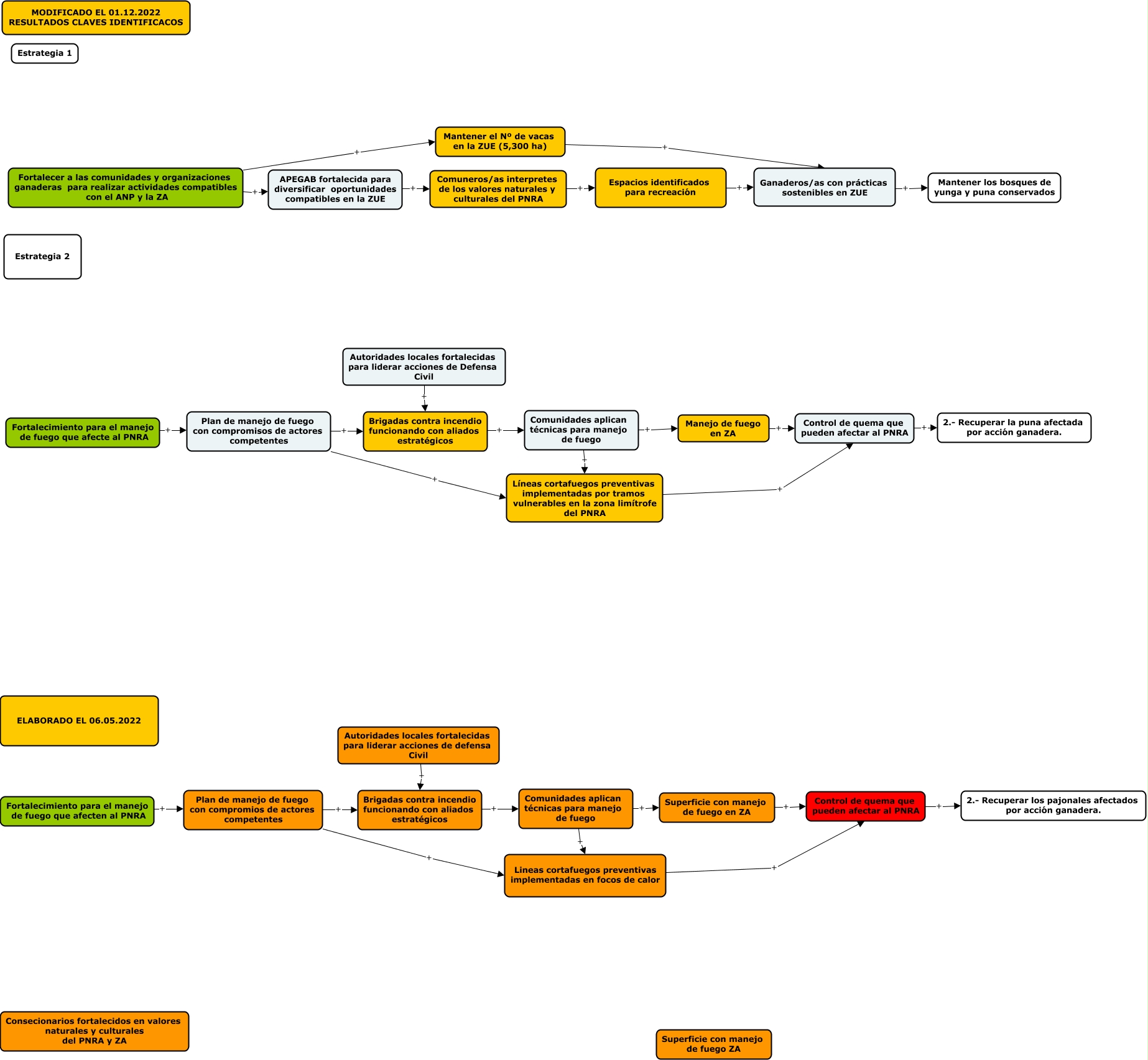 Este Cmap, tiene información relacionada con: Estrategias 1 y 2, Comunidades aplican técnicas para manejo de fuego + Manejo de fuego en ZA, Mantener el Nº de vacas en la ZUE (5,300 ha) + Ganaderos/as con prácticas sostenibles en ZUE, Control de quema que pueden afectar al PNRA + 2.- Recuperar la puna afectada por acción ganadera., Fortalecimiento para el manejo de fuego que afecten al PNRA + Plan de manejo de fuego con compromios de actores competentes, Comunidades aplican técnicas para manejo de fuego + Lineas cortafuegos preventivas implementadas en focos de calor, Lineas cortafuegos preventivas implementadas en focos de calor + Control de quema que pueden afectar al PNRA, Manejo de fuego en ZA + Control de quema que pueden afectar al PNRA, Autoridades locales fortalecidas para liderar acciones de Defensa Civil + Brigadas contra incendio funcionando con aliados estratégicos, Plan de manejo de fuego con compromisos de actores competentes + Líneas cortafuegos preventivas implementadas por tramos vulnerables en la zona limítrofe del PNRA, Control de quema que pueden afectar al PNRA + 2.- Recuperar los pajonales afectados por acción ganadera., Autoridades locales fortalecidas para liderar acciones de defensa Civil + Brigadas contra incendio funcionando con aliados estratégicos, Superficie con manejo de fuego en ZA + Control de quema que pueden afectar al PNRA, Fortalecimiento para el manejo de fuego que afecte al PNRA + Plan de manejo de fuego con compromisos de actores competentes, Comuneros/as interpretes de los valores naturales y culturales del PNRA + Espacios identificados para recreación, Brigadas contra incendio funcionando con aliados estratégicos + Comunidades aplican técnicas para manejo de fuego, Fortalecer a las comunidades y organizaciones ganaderas para realizar actividades compatibles con el ANP y la ZA + APEGAB fortalecida para diversificar oportunidades compatibles en la ZUE, Comunidades aplican técnicas para manejo de fuego + Líneas cortafuegos preventivas implementadas por tramos vulnerables en la zona limítrofe del PNRA, Plan de manejo de fuego con compromios de actores competentes + Brigadas contra incendio funcionando con aliados estratégicos, Ganaderos/as con prácticas sostenibles en ZUE + Mantener los bosques de yunga y puna conservados, Líneas cortafuegos preventivas implementadas por tramos vulnerables en la zona limítrofe del PNRA + Control de quema que pueden afectar al PNRA