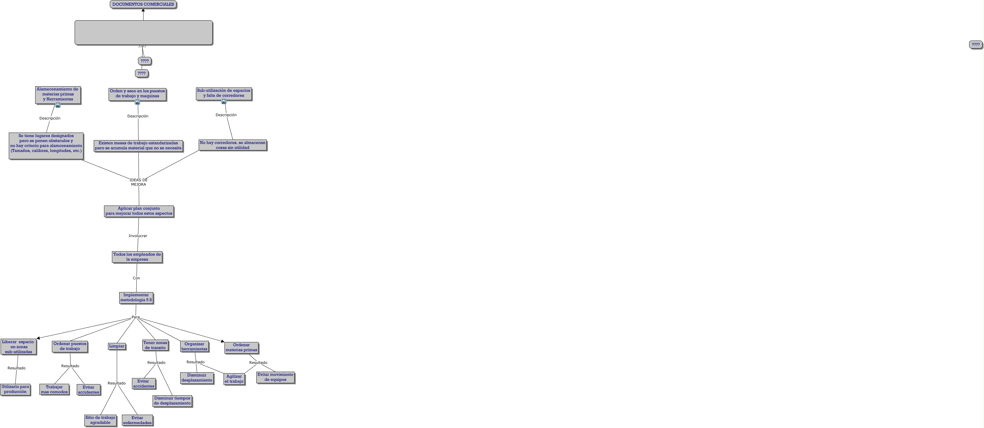 Este Cmap, tiene información relacionada con: Gina Barrera, Alamecenamiento de materias primas y Herramientas Descripción Se tiene lugares designados pero se ponen obstaculos y no hay criterio para alamcenamiento (Tamaños, calibres, longitudes, etc.), Implementar metodologia 5 S Para Limpiar, Implementar metodologia 5 S Para Ordenar materias primas, Tener zonas de transito Resultado Disminuir tiempos de desplazamiento, Limpiar Resultado Sitio de trabajo agradable, Ordenar puestos de trabajo Resultado Trabajar mas comodos, Ordenar materias primas Resultado Evitar movimiento de equipos, Tener zonas de transito Resultado Evitar accidentes, ???? ???? DOCUMENTOS COMERCIALES, No hay corredores, se almacenan cosas sin utilidad IDEAS DE MEJORA Aplicar plan conjunto para mejorar todos estos aspectos, Implementar metodologia 5 S Para Liberar espacio en zonas sub-utilizadas, Liberar espacio en zonas sub-utilizadas Resultado Utilizarlo para producción, Implementar metodologia 5 S Para Tener zonas de transito, Implementar metodologia 5 S Para Organizar herramientas, Aplicar plan conjunto para mejorar todos estos aspectos Involucrar Todos los empleados de la empresa, Existen mesas de trabajo estandarizadas pero se acumula material que no se necesita IDEAS DE MEJORA Aplicar plan conjunto para mejorar todos estos aspectos, ???? ????, Organizar herramientas Resultado Disminuir desplazamiento, ???? ????, Se tiene lugares designados pero se ponen obstaculos y no hay criterio para alamcenamiento (Tamaños, calibres, longitudes, etc.) IDEAS DE MEJORA Aplicar plan conjunto para mejorar todos estos aspectos