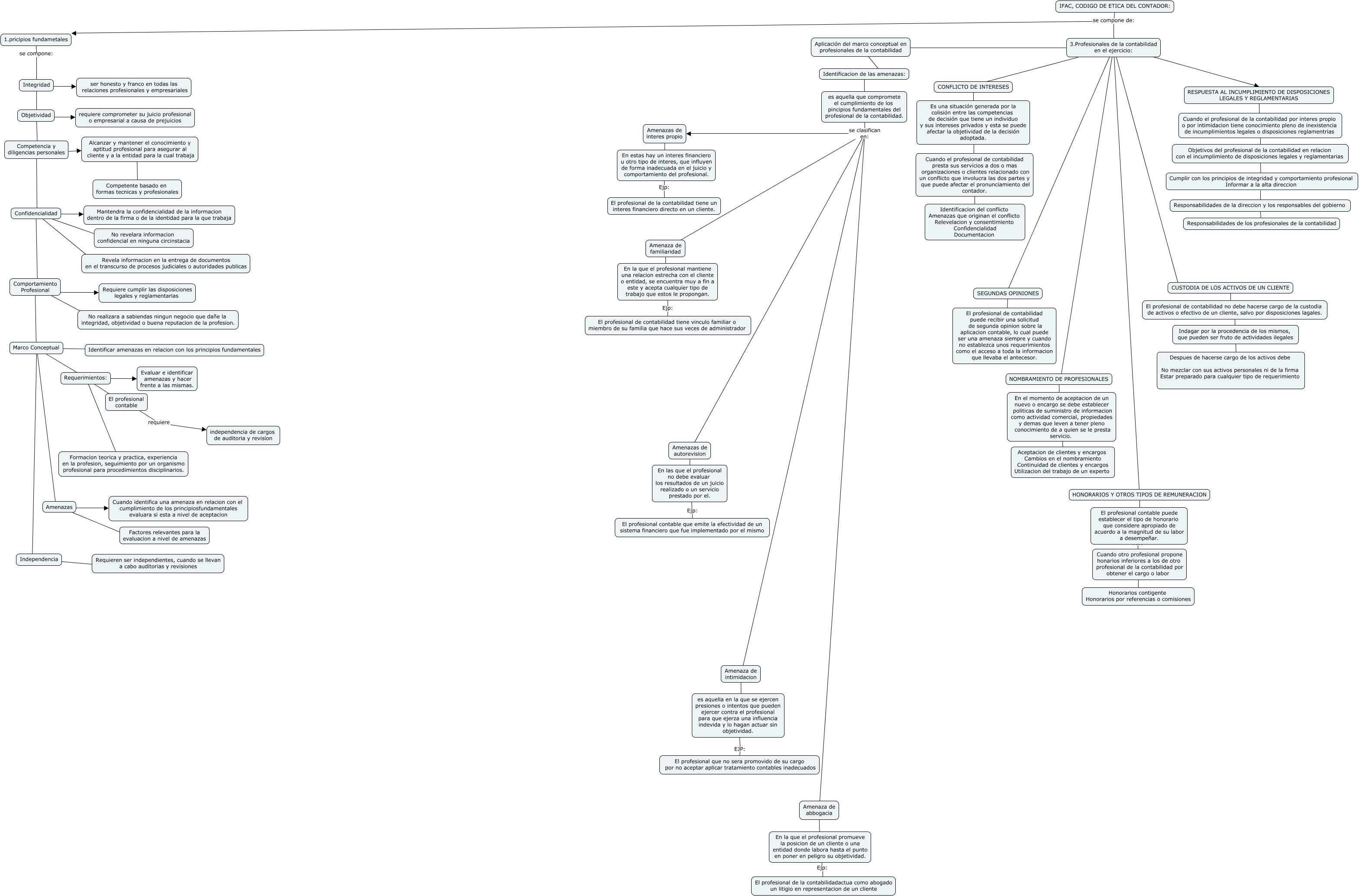 Este Cmap, tiene información relacionada con: IFAC etica del contador, Amenaza de intimidacion ???? es aquella en la que se ejercen presiones o intentos que pueden ejercer contra el profesional para que ejerza una influencia indevida y lo hagan actuar sin objetividad., NOMBRAMIENTO DE PROFESIONALES ???? En el momento de aceptacion de un nuevo o encargo se debe establecer politicas de suministro de informacion como actividad comercial, propiedades y demas que leven a tener pleno conocimiento de a quien se le presta servicio., Confidencialidad ???? Mantendra la confidencialidad de la informacion dentro de la firma o de la identidad para la que trabaja, Objetividad ???? Competencia y diligencias personales, Cumplir con los principios de integridad y comportamiento profesional Informar a la alta direccion ???? Responsabilidades de la direccion y los responsables del gobierno, 3.Profesionales de la contabilidad en el ejercicio: ???? SEGUNDAS OPINIONES, Competencia y diligencias personales ???? Alcanzar y mantener el conocimiento y aptitud profesional para asegurar al cliente y a la entidad para la cual trabaja, 3.Profesionales de la contabilidad en el ejercicio: ???? Aplicación del marco conceptual en profesionales de la contabilidad, Confidencialidad ???? Comportamiento Profesional, Cuando el profesional de la contabilidad por interes propio o por intimidacion tiene conocimiento pleno de inexistencia de incumplimientos legales o disposiciones reglamentrias ???? Objetivos del profesional de la contabilidad en relacion con el incumplimiento de disposiciones legales y reglamentarias, Identificacion de las amenazas: se clasifican en: Amenaza de intimidacion, En el momento de aceptacion de un nuevo o encargo se debe establecer politicas de suministro de informacion como actividad comercial, propiedades y demas que leven a tener pleno conocimiento de a quien se le presta servicio. ???? Aceptacion de clientes y encargos Cambios en el nombramiento Continuidad de clientes y encargos Utilizacion del trabajo de un experto, Identificacion de las amenazas: se clasifican en: Amenaza de abbogacia, SEGUNDAS OPINIONES ???? El profesional de contabilidad puede recibir una solicitud de segunda opinion sobre la aplicacion contable, lo cual puede ser una amenaza siempre y cuando no establezca unos requerimientos como el acceso a toda la informacion que llevaba el antecesor., Identificacion de las amenazas: se clasifican en: Amenazas de interes propio, Alcanzar y mantener el conocimiento y aptitud profesional para asegurar al cliente y a la entidad para la cual trabaja ???? Competente basado en formas tecnicas y profesionales, Responsabilidades de la direccion y los responsables del gobierno ???? Responsabilidades de los profesionales de la contabilidad, Amenazas de interes propio Ejp: El profesional de la contabilidad tiene un interes financiero directo en un cliente., 3.Profesionales de la contabilidad en el ejercicio: ???? CUSTODIA DE LOS ACTIVOS DE UN CLIENTE, Amenaza de familiaridad ???? En la que el profesional mantiene una relacion estrecha con el cliente o entidad, se encuentra muy a fin a este y acepta cualquier tipo de trabajo que estos le propongan.