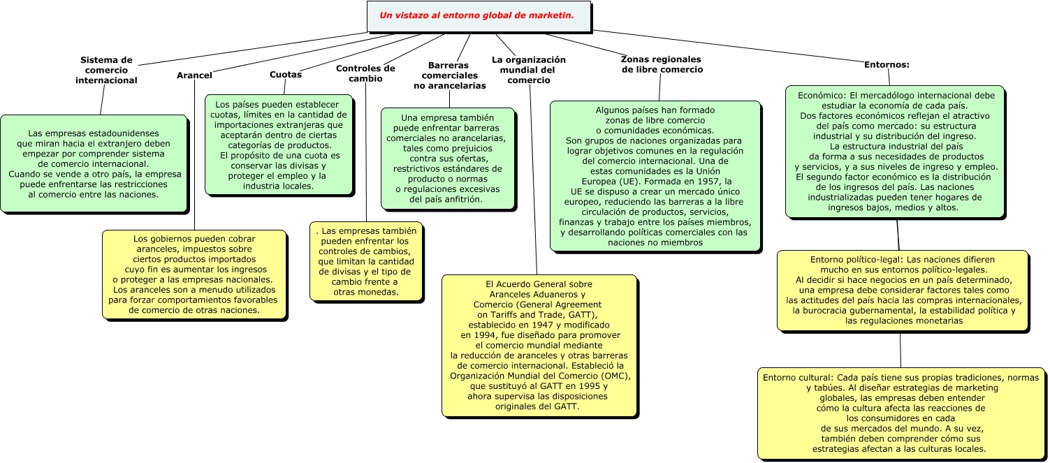 Este Cmap, tiene información relacionada con: merca, Un vistazo al entorno global de marketin. Sistema de comercio internacional Las empresas estadounidenses que miran hacia el extranjero deben empezar por comprender sistema de comercio internacional. Cuando se vende a otro país, la empresa puede enfrentarse las restricciones al comercio entre las naciones., Un vistazo al entorno global de marketin. Barreras comerciales no arancelarias Una empresa también puede enfrentar barreras comerciales no arancelarias, tales como prejuicios contra sus ofertas, restrictivos estándares de producto o normas o regulaciones excesivas del país anfitrión., Económico: El mercadólogo internacional debe estudiar la economía de cada país. Dos factores económicos reflejan el atractivo del país como mercado: su estructura industrial y su distribución del ingreso. La estructura industrial del país da forma a sus necesidades de productos y servicios, y a sus niveles de ingreso y empleo. El segundo factor económico es la distribución de los ingresos del país. Las naciones industrializadas pueden tener hogares de ingresos bajos, medios y altos. ???? Entorno político-legal: Las naciones difieren mucho en sus entornos político-legales. Al decidir si hace negocios en un país determinado, una empresa debe considerar factores tales como las actitudes del país hacia las compras internacionales, la burocracia gubernamental, la estabilidad política y las regulaciones monetarias, Un vistazo al entorno global de marketin. Zonas regionales de libre comercio Algunos países han formado zonas de libre comercio o comunidades económicas. Son grupos de naciones organizadas para lograr objetivos comunes en la regulación del comercio internacional. Una de estas comunidades es la Unión Europea (UE). Formada en 1957, la UE se dispuso a crear un mercado único europeo, reduciendo las barreras a la libre circulación de productos, servicios, finanzas y trabajo entre los países miembros, y desarrollando políticas comerciales con las naciones no miembros, Económico: El mercadólogo internacional debe estudiar la economía de cada país. Dos factores económicos reflejan el atractivo del país como mercado: su estructura industrial y su distribución del ingreso. La estructura industrial del país da forma a sus necesidades de productos y servicios, y a sus niveles de ingreso y empleo. El segundo factor económico es la distribución de los ingresos del país. Las naciones industrializadas pueden tener hogares de ingresos bajos, medios y altos. ???? Entorno cultural: Cada país tiene sus propias tradiciones, normas y tabúes. Al diseñar estrategias de marketing globales, las empresas deben entender cómo la cultura afecta las reacciones de los consumidores en cada de sus mercados del mundo. A su vez, también deben comprender cómo sus estrategias afectan a las culturas locales., Un vistazo al entorno global de marketin. Entornos: Económico: El mercadólogo internacional debe estudiar la economía de cada país. Dos factores económicos reflejan el atractivo del país como mercado: su estructura industrial y su distribución del ingreso. La estructura industrial del país da forma a sus necesidades de productos y servicios, y a sus niveles de ingreso y empleo. El segundo factor económico es la distribución de los ingresos del país. Las naciones industrializadas pueden tener hogares de ingresos bajos, medios y altos., Un vistazo al entorno global de marketin. Arancel Los gobiernos pueden cobrar aranceles, impuestos sobre ciertos productos importados cuyo fin es aumentar los ingresos o proteger a las empresas nacionales. Los aranceles son a menudo utilizados para forzar comportamientos favorables de comercio de otras naciones., Un vistazo al entorno global de marketin. Controles de cambio . Las empresas también pueden enfrentar los controles de cambios, que limitan la cantidad de divisas y el tipo de cambio frente a otras monedas., Un vistazo al entorno global de marketin. La organización mundial del comercio El Acuerdo General sobre Aranceles Aduaneros y Comercio (General Agreement on Tariffs and Trade, GATT), establecido en 1947 y modificado en 1994, fue diseñado para promover el comercio mundial mediante la reducción de aranceles y otras barreras de comercio internacional. Estableció la Organización Mundial del Comercio (OMC), que sustituyó al GATT en 1995 y ahora supervisa las disposiciones originales del GATT., Un vistazo al entorno global de marketin. Cuotas Los países pueden establecer cuotas, límites en la cantidad de importaciones extranjeras que aceptarán dentro de ciertas categorías de productos. El propósito de una cuota es conservar las divisas y proteger el empleo y la industria locales.