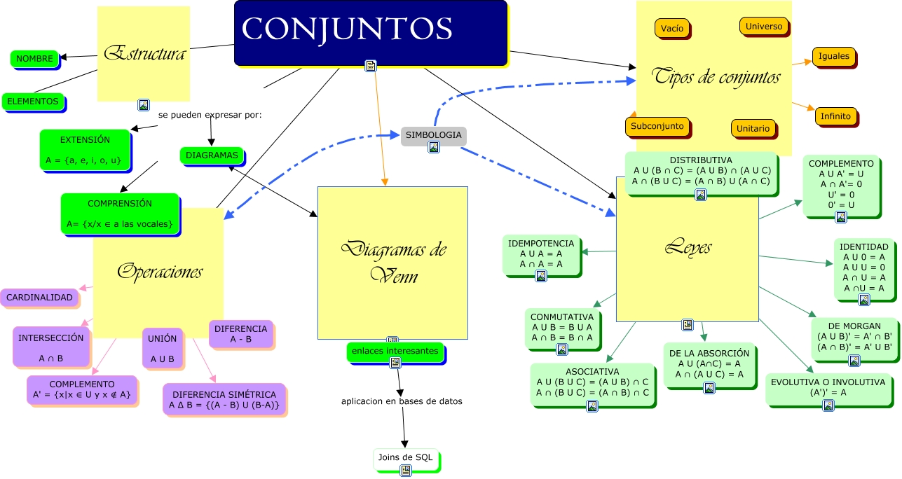 Este Cmap, tiene información relacionada con: CONJUNTOS, SIMBOLOGIA Operaciones COMPLEMENTO A' = {x|x ∈ U y x ∉ A}, SIMBOLOGIA Leyes DE MORGAN (A U B)' = A' ∩ B' (A ∩ B)' = A' U B', CONJUNTOS se pueden expresar por: EXTENSIÓN A = {a, e, i, o, u}, SIMBOLOGIA Tipos de conjuntos Universo, SIMBOLOGIA Tipos de conjuntos Unitario, CONJUNTOS Operaciones UNIÓN A U B, SIMBOLOGIA Tipos de conjuntos Iguales, CONJUNTOS Operaciones DIFERENCIA A - B, enlaces interesantes aplicacion en bases de datos Joins de SQL, CONJUNTOS Leyes EVOLUTIVA O INVOLUTIVA (A')' = A, CONJUNTOS Leyes DE LA ABSORCIÓN A U (A∩C) = A A ∩ (A U C) = A, CONJUNTOS se pueden expresar por: DIAGRAMAS, SIMBOLOGIA Operaciones UNIÓN A U B, CONJUNTOS Leyes ASOCIATIVA A U (B U C) = (A U B) ∩ C A ∩ (B U C) = (A ∩ B) ∩ C, CONJUNTOS Diagramas de Venn DIAGRAMAS, SIMBOLOGIA Leyes COMPLEMENTO A U A' = U A ∩ A'= 0 U' = 0 0' = U, SIMBOLOGIA Tipos de conjuntos Vacío, CONJUNTOS Estructura ELEMENTOS, CONJUNTOS Tipos de conjuntos Vacío, CONJUNTOS Operaciones COMPLEMENTO A' = {x|x ∈ U y x ∉ A}