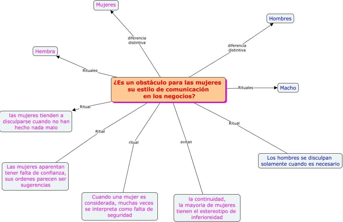 Este Cmap, tiene información relacionada con: Estilo de comunicación de las mujeres, ¿Es un obstáculo para las mujeres su estilo de comunicación en los negocios? diferencia distintiva Mujeres, ¿Es un obstáculo para las mujeres su estilo de comunicación en los negocios? Ritial Las mujeres aparentan tener falta de confianza, sus ordenes parecen ser sugerencias, ¿Es un obstáculo para las mujeres su estilo de comunicación en los negocios? Ritual las mujeres tienden a disculparse cuando no han hecho nada malo, ¿Es un obstáculo para las mujeres su estilo de comunicación en los negocios? evitan la continuidad, la mayoria de mujeres tienen el estereotipo de inferioreidad, ¿Es un obstáculo para las mujeres su estilo de comunicación en los negocios? ritual Cuando una mujer es considerada, muchas veces se interpreta como falta de seguridad, ¿Es un obstáculo para las mujeres su estilo de comunicación en los negocios? Rituales Hembra, ¿Es un obstáculo para las mujeres su estilo de comunicación en los negocios? Ritual Los hombres se disculpan solamente cuando es necesario, ¿Es un obstáculo para las mujeres su estilo de comunicación en los negocios? Rituales Macho, ¿Es un obstáculo para las mujeres su estilo de comunicación en los negocios? diferencia distintiva Hombres