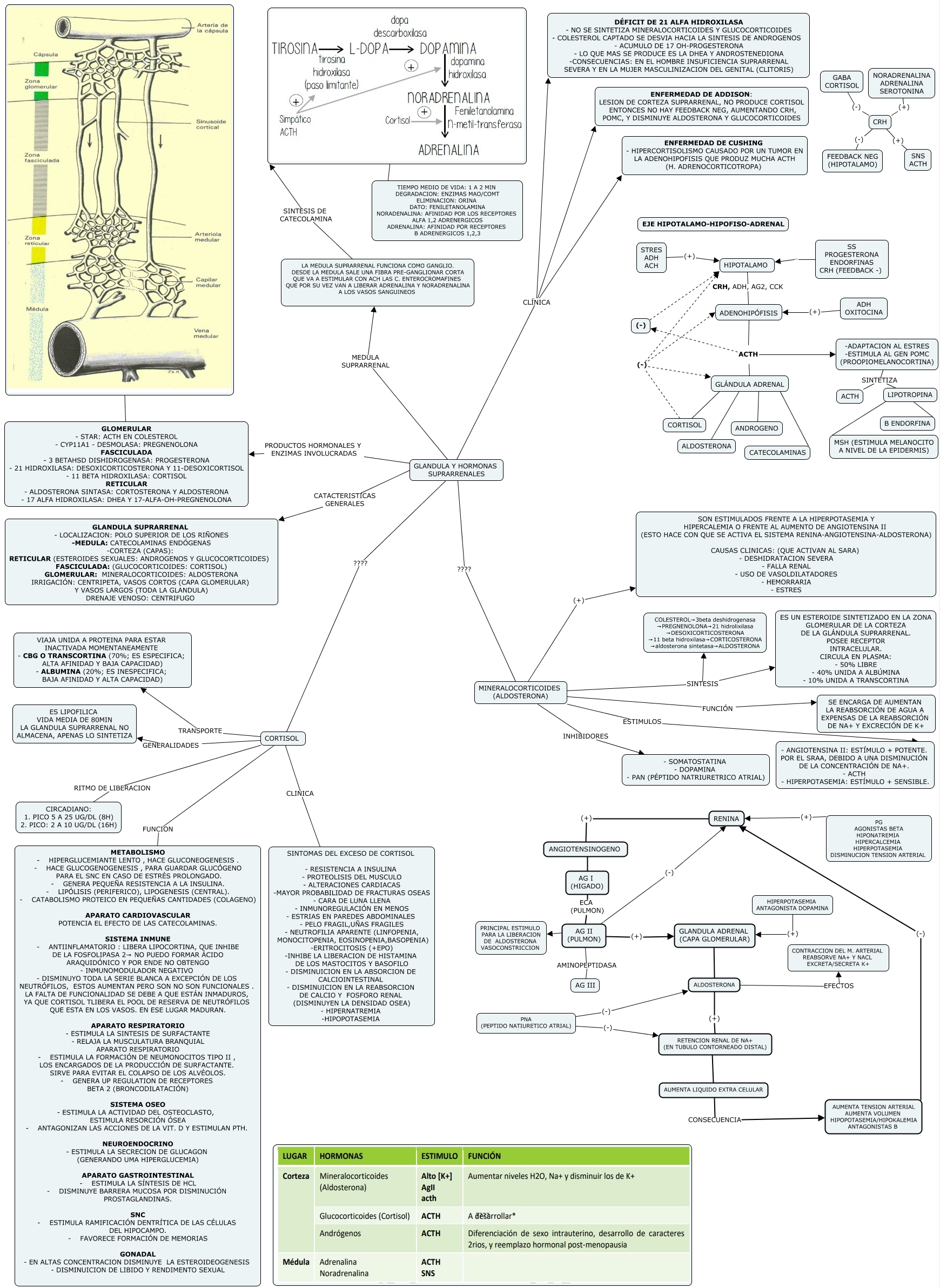 Este Cmap, tiene información relacionada con: E5, CRH (-) FEEDBACK NEG (HIPOTALAMO), ANGIOTENSINOGENO ???? AG I (HIGADO), GLANDULA Y HORMONAS SUPRARRENALES CLÍNICA ENFERMEDAD DE CUSHING - HIPERCORTISOLISMO CAUSADO POR UN TUMOR EN LA ADENOHIPOFISIS QUE PRODUZ MUCHA ACTH (H. ADRENOCORTICOTROPA), (-) ???? HIPOTALAMO, CORTISOL RITMO DE LIBERACION CIRCADIANO: 1. PICO 5 A 25 UG/DL (8H) 2. PICO: 2 A 10 UG/DL (16H), GLÁNDULA ADRENAL ???? ALDOSTERONA, PNA (PEPTIDO NATIURETICO ATRIAL) (-) ALDOSTERONA, MINERALOCORTICOIDES (ALDOSTERONA) FUNCIÓN SE ENCARGA DE AUMENTAN LA REABSORCIÓN DE AGUA A EXPENSAS DE LA REABSORCIÓN DE NA+ Y EXCRECIÓN DE K+, MINERALOCORTICOIDES (ALDOSTERONA) SINTESIS ES UN ESTEROIDE SINTETIZADO EN LA ZONA GLOMERULAR DE LA CORTEZA DE LA GLÁNDULA SUPRARRENAL. POSEE RECEPTOR INTRACELULAR. CIRCULA EN PLASMA: - 50% LIBRE - 40% UNIDA A ALBÚMINA - 10% UNIDA A TRANSCORTINA, NORADRENALINA ADRENALINA SEROTONINA (+) CRH, CORTISOL (-) ADENOHIPÓFISIS, PG AGONISTAS BETA HIPONATREMIA HIPERCALCEMIA HIPERPOTASEMIA DISMINUCION TENSION ARTERIAL (+) RENINA, GABA CORTISOL (-) CRH, LIPOTROPINA ???? MSH (ESTIMULA MELANOCITO A NIVEL DE LA EPIDERMIS), HIPOTALAMO CRH, ADH, AG2, CCK ADENOHIPÓFISIS, GLOMERULAR - STAR: ACTH EN COLESTEROL - CYP11A1 - DESMOLASA: PREGNENOLONA FASCICULADA - 3 BETAHSD DISHIDROGENASA: PROGESTERONA - 21 HIDROXILASA: DESOXICORTICOSTERONA Y 11-DESOXICORTISOL - 11 BETA HIDROXILASA: CORTISOL RETICULAR - ALDOSTERONA SINTASA: CORTOSTERONA Y ALDOSTERONA - 17 ALFA HIDROXILASA: DHEA Y 17-ALFA-OH-PREGNENOLONA ????, ADENOHIPÓFISIS ACTH -ADAPTACION AL ESTRES -ESTIMULA AL GEN POMC (PROOPIOMELANOCORTINA), MINERALOCORTICOIDES (ALDOSTERONA) INHIBIDORES - SOMATOSTATINA - DOPAMINA - PAN (PÉPTIDO NATRIURETRICO ATRIAL), RETENCION RENAL DE NA+ (EN TUBULO CONTORNEADO DISTAL) ???? AUMENTA LIQUIDO EXTRA CELULAR, ADENOHIPÓFISIS ACTH GLÁNDULA ADRENAL