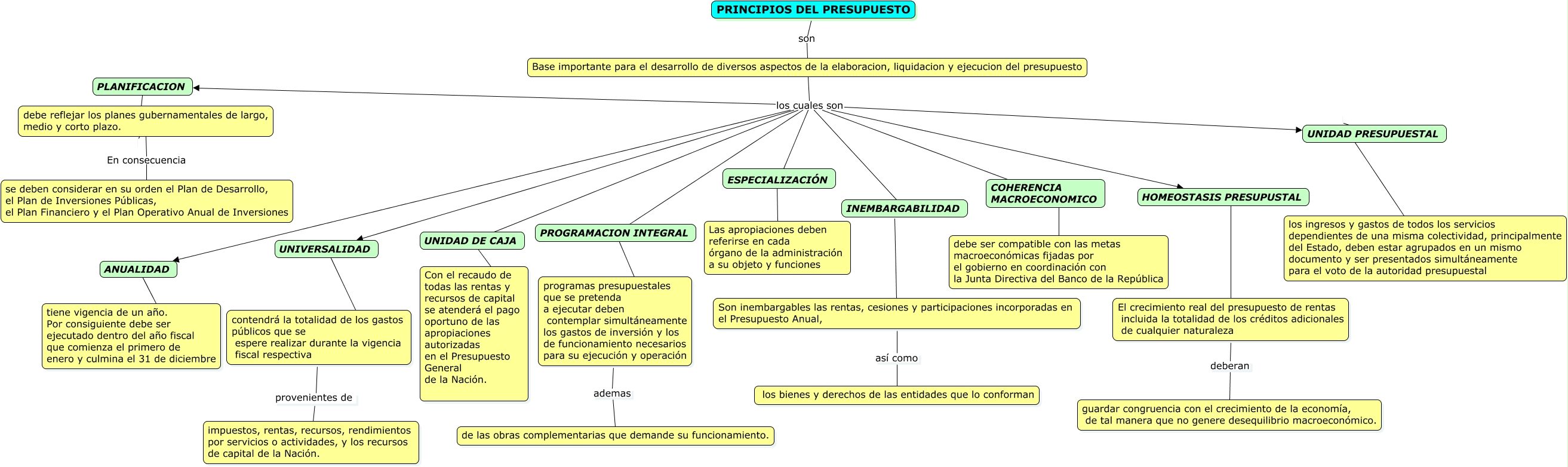 Este Cmap, tiene información relacionada con: PRINCIPIOS DEL PRESUPUESTO, Base importante para el desarrollo de diversos aspectos de la elaboracion, liquidacion y ejecucion del presupuesto los cuales son PROGRAMACION INTEGRAL, UNIDAD PRESUPUESTAL los ingresos y gastos de todos los servicios dependientes de una misma colectividad, principalmente del Estado, deben estar agrupados en un mismo documento y ser presentados simultáneamente para el voto de la autoridad presupuestal, El crecimiento real del presupuesto de rentas incluida la totalidad de los créditos adicionales de cualquier naturaleza deberan guardar congruencia con el crecimiento de la economía, de tal manera que no genere desequilibrio macroeconómico., ESPECIALIZACIÓN Las apropiaciones deben referirse en cada órgano de la administración a su objeto y funciones, Base importante para el desarrollo de diversos aspectos de la elaboracion, liquidacion y ejecucion del presupuesto los cuales son COHERENCIA MACROECONOMICO, debe reflejar los planes gubernamentales de largo, medio y corto plazo. En consecuencia se deben considerar en su orden el Plan de Desarrollo, el Plan de Inversiones Públicas, el Plan Financiero y el Plan Operativo Anual de Inversiones, contendrá la totalidad de los gastos públicos que se espere realizar durante la vigencia fiscal respectiva provenientes de impuestos, rentas, recursos, rendimientos por servicios o actividades, y los recursos de capital de la Nación., Base importante para el desarrollo de diversos aspectos de la elaboracion, liquidacion y ejecucion del presupuesto los cuales son UNIDAD DE CAJA, Base importante para el desarrollo de diversos aspectos de la elaboracion, liquidacion y ejecucion del presupuesto los cuales son UNIVERSALIDAD, Base importante para el desarrollo de diversos aspectos de la elaboracion, liquidacion y ejecucion del presupuesto los cuales son PLANIFICACION, PLANIFICACION debe reflejar los planes gubernamentales de largo, medio y corto plazo., ANUALIDAD tiene vigencia de un año. Por consiguiente debe ser ejecutado dentro del año fiscal que comienza el primero de enero y culmina el 31 de diciembre, Base importante para el desarrollo de diversos aspectos de la elaboracion, liquidacion y ejecucion del presupuesto los cuales son UNIDAD PRESUPUESTAL, Base importante para el desarrollo de diversos aspectos de la elaboracion, liquidacion y ejecucion del presupuesto los cuales son HOMEOSTASIS PRESUPUSTAL, INEMBARGABILIDAD Son inembargables las rentas, cesiones y participaciones incorporadas en el Presupuesto Anual,, PROGRAMACION INTEGRAL programas presupuestales que se pretenda a ejecutar deben contemplar simultáneamente los gastos de inversión y los de funcionamiento necesarios para su ejecución y operación, COHERENCIA MACROECONOMICO debe ser compatible con las metas macroeconómicas fijadas por el gobierno en coordinación con la Junta Directiva del Banco de la República, programas presupuestales que se pretenda a ejecutar deben contemplar simultáneamente los gastos de inversión y los de funcionamiento necesarios para su ejecución y operación ademas de las obras complementarias que demande su funcionamiento., PRINCIPIOS DEL PRESUPUESTO son Base importante para el desarrollo de diversos aspectos de la elaboracion, liquidacion y ejecucion del presupuesto, Base importante para el desarrollo de diversos aspectos de la elaboracion, liquidacion y ejecucion del presupuesto los cuales son ANUALIDAD