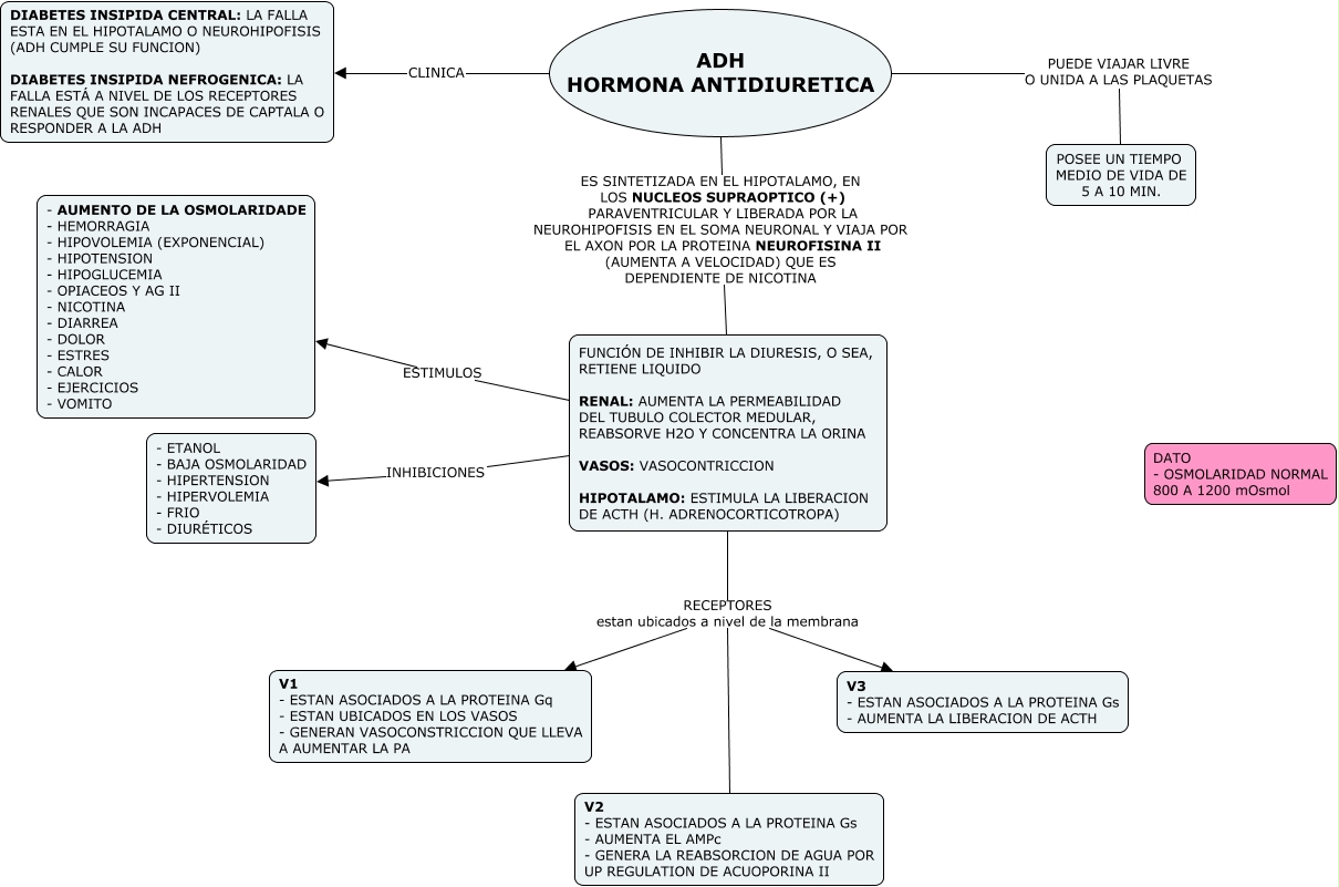 Esse mapa conceitual, produzido no IHMC CmapTools, tem a informação relacionada a: ADH, FUNCIÓN DE INHIBIR LA DIURESIS, O SEA, RETIENE LIQUIDO RENAL: AUMENTA LA PERMEABILIDAD DEL TUBULO COLECTOR MEDULAR, REABSORVE H2O Y CONCENTRA LA ORINA VASOS: VASOCONTRICCION HIPOTALAMO: ESTIMULA LA LIBERACION DE ACTH (H. ADRENOCORTICOTROPA) ESTIMULOS - AUMENTO DE LA OSMOLARIDADE - HEMORRAGIA - HIPOVOLEMIA (EXPONENCIAL) - HIPOTENSION - HIPOGLUCEMIA - OPIACEOS Y AG II - NICOTINA - DIARREA - DOLOR - ESTRES - CALOR - EJERCICIOS - VOMITO, FUNCIÓN DE INHIBIR LA DIURESIS, O SEA, RETIENE LIQUIDO RENAL: AUMENTA LA PERMEABILIDAD DEL TUBULO COLECTOR MEDULAR, REABSORVE H2O Y CONCENTRA LA ORINA VASOS: VASOCONTRICCION HIPOTALAMO: ESTIMULA LA LIBERACION DE ACTH (H. ADRENOCORTICOTROPA) RECEPTORES estan ubicados a nivel de la membrana V1 - ESTAN ASOCIADOS A LA PROTEINA Gq - ESTAN UBICADOS EN LOS VASOS - GENERAN VASOCONSTRICCION QUE LLEVA A AUMENTAR LA PA, FUNCIÓN DE INHIBIR LA DIURESIS, O SEA, RETIENE LIQUIDO RENAL: AUMENTA LA PERMEABILIDAD DEL TUBULO COLECTOR MEDULAR, REABSORVE H2O Y CONCENTRA LA ORINA VASOS: VASOCONTRICCION HIPOTALAMO: ESTIMULA LA LIBERACION DE ACTH (H. ADRENOCORTICOTROPA) INHIBICIONES - ETANOL - BAJA OSMOLARIDAD - HIPERTENSION - HIPERVOLEMIA - FRIO - DIURÉTICOS, FUNCIÓN DE INHIBIR LA DIURESIS, O SEA, RETIENE LIQUIDO RENAL: AUMENTA LA PERMEABILIDAD DEL TUBULO COLECTOR MEDULAR, REABSORVE H2O Y CONCENTRA LA ORINA VASOS: VASOCONTRICCION HIPOTALAMO: ESTIMULA LA LIBERACION DE ACTH (H. ADRENOCORTICOTROPA) RECEPTORES estan ubicados a nivel de la membrana V2 - ESTAN ASOCIADOS A LA PROTEINA Gs - AUMENTA EL AMPc - GENERA LA REABSORCION DE AGUA POR UP REGULATION DE ACUOPORINA II, ADH HORMONA ANTIDIURETICA ES SINTETIZADA EN EL HIPOTALAMO, EN LOS NUCLEOS SUPRAOPTICO (+) PARAVENTRICULAR Y LIBERADA POR LA NEUROHIPOFISIS EN EL SOMA NEURONAL Y VIAJA POR EL AXON POR LA PROTEINA NEUROFISINA II (AUMENTA A VELOCIDAD) QUE ES DEPENDIENTE DE NICOTINA FUNCIÓN DE INHIBIR LA DIURESIS, O SEA, RETIENE LIQUIDO RENAL: AUMENTA LA PERMEABILIDAD DEL TUBULO COLECTOR MEDULAR, REABSORVE H2O Y CONCENTRA LA ORINA VASOS: VASOCONTRICCION HIPOTALAMO: ESTIMULA LA LIBERACION DE ACTH (H. ADRENOCORTICOTROPA), ADH HORMONA ANTIDIURETICA CLINICA DIABETES INSIPIDA CENTRAL: LA FALLA ESTA EN EL HIPOTALAMO O NEUROHIPOFISIS (ADH CUMPLE SU FUNCION) DIABETES INSIPIDA NEFROGENICA: LA FALLA ESTÁ A NIVEL DE LOS RECEPTORES RENALES QUE SON INCAPACES DE CAPTALA O RESPONDER A LA ADH, FUNCIÓN DE INHIBIR LA DIURESIS, O SEA, RETIENE LIQUIDO RENAL: AUMENTA LA PERMEABILIDAD DEL TUBULO COLECTOR MEDULAR, REABSORVE H2O Y CONCENTRA LA ORINA VASOS: VASOCONTRICCION HIPOTALAMO: ESTIMULA LA LIBERACION DE ACTH (H. ADRENOCORTICOTROPA) RECEPTORES estan ubicados a nivel de la membrana V3 - ESTAN ASOCIADOS A LA PROTEINA Gs - AUMENTA LA LIBERACION DE ACTH, ADH HORMONA ANTIDIURETICA PUEDE VIAJAR LIVRE O UNIDA A LAS PLAQUETAS POSEE UN TIEMPO MEDIO DE VIDA DE 5 A 10 MIN.