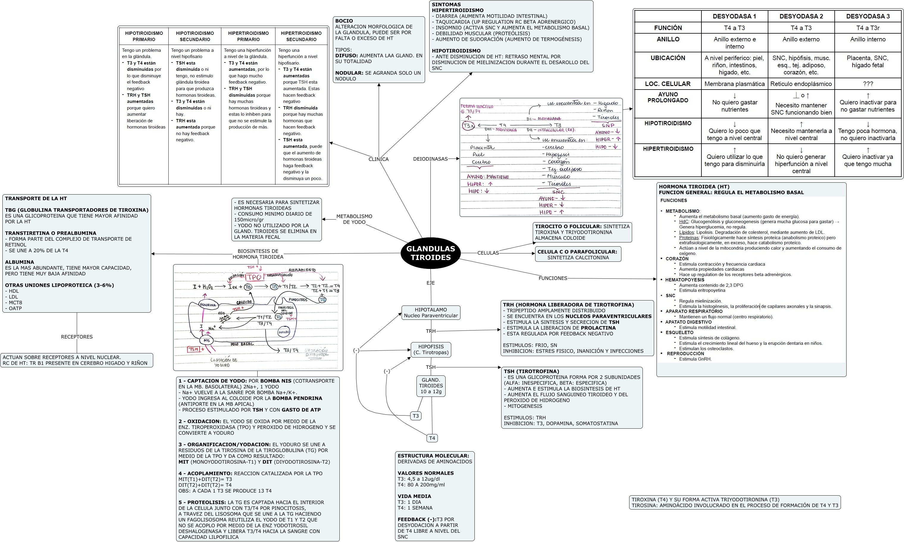 Esse mapa conceitual, produzido no IHMC CmapTools, tem a informação relacionada a: E4, GLANDULAS TIROIDES BIOSINTESIS DE HORMONA TIROIDEA TRANSPORTE DE LA HT TBG (GLOBULINA TRANSPORTADORES DE TIROXINA) ES UNA GLICOPROTEINA QUE TIENE MAYOR AFINIDAD POR LA HT TRANSTIRETINA O PREALBUMINA - FORMA PARTE DEL COMPLEJO DE TRANSPORTE DE RETINOL - SE UNE A 20% DE LA T4 ALBUMINA ES LA MAS ABUNDANTE, TIENE MAYOR CAPACIDAD, PERO TIENE MUY BAJA AFINIDAD OTRAS UNIONES LIPOPROTEICA (3-6%) - HDL - LDL - MCT8 - OATP, GLANDULAS TIROIDES CLINICA BOCIO ALTERACION MORFOLOGICA DE LA GLANDULA, PUEDE SER POR FALTA O EXCESO DE HT TIPOS: DIFUSO: AUMENTA LAA GLAND. EN SU TOTALIDAD NODULAR: SE AGRANDA SOLO UN NODULO, GLANDULAS TIROIDES CLINICA, GLANDULAS TIROIDES METABOLISMO DE YODO - ES NECESARIA PARA SINTETIZAR HORMONAS TIROIDEAS - CONSUMO MINIMO DIARIO DE 150micro/gr - YODO NO UTILIZADO POR LA GLAND. TIROIDES SE ELIMINA EN LA MATERIA FECAL, T4 (-) HIPOFISIS (C. Tirotropas), GLAND. TIROIDES 10 a 12g ???? T3, ????, HIPOFISIS (C. Tirotropas) TSH GLAND. TIROIDES 10 a 12g, T3 (-) HIPOFISIS (C. Tirotropas), GLANDULAS TIROIDES FUNCIONES HORMONA TIROIDEA (HT) FUNCION GENERAL: REGULA EL METABOLISMO BASAL, ???? 1 - CAPTACION DE YODO: POR BOMBA NIS (COTRANSPORTE EN LA MB. BASOLATERAL) 2Na+, 1 YODO - Na+ VUELVE A LA SANRE POR BOMBA Na+/K+. - YODO INGRESA AL COLOIDE POR LA BOMBA PENDRINA (ANTIPORTE EN LA MB APICAL) - PROCESO ESTIMULADO POR TSH Y CON GASTO DE ATP 2 - OXIDACION: EL YODO SE OXIDA POR MEDIO DE LA ENZ. TIROPEROXIDASA (TPO) Y PEROXIDO DE HIDROGENO Y SE CONVIERTE A YODURO 3 - ORGANIFICACION/YODACION: EL YODURO SE UNE A RESIDUOS DE LA TIROSINA DE LA TIROGLOBULINA (TG) POR MEDIO DE LA TPO Y DA COMO RESULTADO: MIT (MONOYODOTIROSINA-T1) Y DIT (DIYODOTIROSINA-T2) 4 - ACOPLAMIENTO: REACCION CATALIZADA POR LA TPO MIT(T1)+DIT(T2)= T3 DIT(T2)+DIT(T2)= T4 OBS: A CADA 1 T3 SE PRODUCE 13 T4 5 - PROTEOLISIS: LA TG ES CAPTADA HACIA EL INTERIOR DE LA CELULA JUNTO CON T3/T4 POR PINOCITOSIS, A TRAVEZ DEL LISOSOMA QUE SE UNE A LA TG HACIENDO UN FAGOLISOSOMA REUTILIZA EL YODO DE T1 Y T2 QUE NO SE ACOPLO POR MEDIO DE LA ENZ YODOTIROSIL DESHALOGENASA Y LIBERA T3/T4 HACIA LA SANGRE CON CAPACIDAD LILPOFILICA, GLANDULAS TIROIDES CLINICA SINTOMAS HIPERTIROIDISMO - DIARREA (AUMENTA MOTILIDAD INTESTINAL) - TAQUICARDIA (UP REGULATION RC BETA ADRENERGICO) - INSOMNIO (ACTIVA SNC Y AUMENTA EL METABOLISMO BASAL) - DEBILIDAD MUSCULAR (PROTEÓLISIS) - AUMENTO DE SUDORACIÓN (AUMENTO DE TERMOGÉNESIS) HIPOTIROIDISMO - ANTE DISMINUCION DE HT: RETRASO MENTAL POR DISMINUCION DE MIELINIZACION DURANTE EL DESAROLLO DEL SNC, T3 (-) HIPOTALAMO Nucleo Paraventricular, GLANDULAS TIROIDES CELULAS CELULA C O PARAFOLICULAR: SINTETIZA CALCITONINA, HIPOTALAMO Nucleo Paraventricular TRH HIPOFISIS (C. Tirotropas), GLANDULAS TIROIDES EJE HIPOTALAMO Nucleo Paraventricular, GLAND. TIROIDES 10 a 12g ???? T4, GLANDULAS TIROIDES CELULAS TIROCITO O FOLICULAR: SINTETIZA TIROXINA Y TRIYODOTIRONINA ALMACENA COLOIDE, HIPOTALAMO Nucleo Paraventricular TRH TRH (HORMONA LIBERADORA DE TIROTROFINA) - TRIPEPTIDO AMPLAMENTE DISTRIBUIDO - SE ENCUENTRA EN LOS NUCLEOS PARAVENTRICULARES - ESTIMULA LA SINTESIS Y SECRECION DE TSH - ESTIMULA LA LIBERACION DE PROLACTINA - ESTA REGULADA POR FEEDBACK NEGATIVO ESTIMULOS: FRIO, SN INHIBICION: ESTRES FISICO, INANICIÓN Y INFECCIONES, GLANDULAS TIROIDES DEIODINASAS