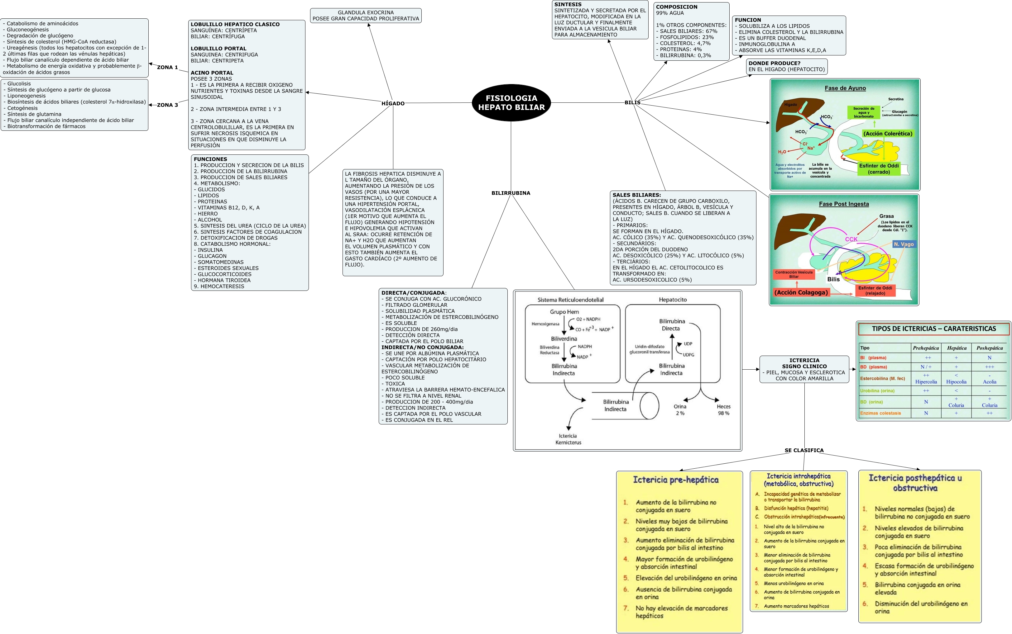 Esse mapa conceitual, produzido no IHMC CmapTools, tem a informação relacionada a: D3, FISIOLOGIA HEPATO BILIAR HÍGADO LOBULILLO HEPATICO CLASICO SANGUÍNEA: CENTRÍPETA BILIAR: CENTRÍFUGA LOBULILLO PORTAL SANGUINEA: CENTRIFUGA BILIAR: CENTRIPETA ACINO PORTAL POSEE 3 ZONAS 1 - ES LA PRIMERA A RECIBIR OXIGENO NUTRIENTES Y TOXINAS DESDE LA SANGRE SINUSOIDAL 2 - ZONA INTERMEDIA ENTRE 1 Y 3 3 - ZONA CERCANA A LA VENA CENTROLOBULILLAR, ES LA PRIMERA EN SUFRIR NECROSIS ISQUEMICA EN SITUACIONES EN QUE DISMINUYE LA PERFUSIÓN, ICTERICIA SIGNO CLINICO - PIEL, MUCOSA Y ESCLEROTICA CON COLOR AMARILLA ????, FISIOLOGIA HEPATO BILIAR BILIS SALES BILIARES: (ÁCIDOS B. CARECEN DE GRUPO CARBOXILO, PRESENTES EN HÍGADO, ÁRBOL B, VESÍCULA Y CONDUCTO; SALES B. CUANDO SE LIBERAN A LA LUZ) - PRIMARIOS: SE FORMAN EN EL HÍGADO. AC. CÓLICO (35%) Y AC. QUENODESOXICÓLICO (35%) - SECUNDÁRIOS: 2DA PORCIÓN DEL DUODENO AC. DESOXICÓLICO (25%) Y AC. LITOCÓLICO (5%) - TERCIÁRIOS: EN EL HÍGADO EL AC. CETOLITOCOLICO ES TRANSFORMADO EN: AC. URSODESOXICOLICO (5%), ICTERICIA SIGNO CLINICO - PIEL, MUCOSA Y ESCLEROTICA CON COLOR AMARILLA SE CLASIFICA, ???? ICTERICIA SIGNO CLINICO - PIEL, MUCOSA Y ESCLEROTICA CON COLOR AMARILLA, FISIOLOGIA HEPATO BILIAR BILIS COMPOSICION 99% AGUA 1% OTROS COMPONENTES: - SALES BILIARES: 67% - FOSFOLIPIDOS: 23% - COLESTEROL: 4,7% - PROTEINAS: 4% - BILIRRUBINA: 0,3%, FISIOLOGIA HEPATO BILIAR BILIS FUNCION - SOLUBILIZA A LOS LIPIDOS - ELIMINA COLESTEROL Y LA BILIRRUBINA - ES UN BUFFER DUODENAL - INMUNOGLOBULINA A - ABSORVE LAS VITAMINAS K,E,D,A, FISIOLOGIA HEPATO BILIAR HÍGADO GLANDULA EXOCRINA POSEE GRAN CAPACIDAD PROLIFERATIVA, LOBULILLO HEPATICO CLASICO SANGUÍNEA: CENTRÍPETA BILIAR: CENTRÍFUGA LOBULILLO PORTAL SANGUINEA: CENTRIFUGA BILIAR: CENTRIPETA ACINO PORTAL POSEE 3 ZONAS 1 - ES LA PRIMERA A RECIBIR OXIGENO NUTRIENTES Y TOXINAS DESDE LA SANGRE SINUSOIDAL 2 - ZONA INTERMEDIA ENTRE 1 Y 3 3 - ZONA CERCANA A LA VENA CENTROLOBULILLAR, ES LA PRIMERA EN SUFRIR NECROSIS ISQUEMICA EN SITUACIONES EN QUE DISMINUYE LA PERFUSIÓN ZONA 1 - Catabolismo de aminoácidos - Gluconeogénesis - Degradación de glucógeno - Síntesis de colesterol (HMG-CoA reductasa) - Ureagénesis (todos los hepatocitos con excepción de 1- 2 últimas filas que rodean las vénulas hepáticas) - Flujo biliar canalículo dependiente de ácido biliar - Metabolismo de energía oxidativa y probablemente β- oxidación de ácidos grasos, FISIOLOGIA HEPATO BILIAR HÍGADO LA FIBROSIS HEPATICA DISMINUYE A L TAMAÑO DEL ÓRGANO, AUMENTANDO LA PRESIÓN DE LOS VASOS (POR UNA MAYOR RESISTENCIA), LO QUE CONDUCE A UNA HIPERTENSIÓN PORTAL, VASODILATACIÓN ESPLÁCNICA (1ER MOTIVO QUE AUMENTA EL FLUJO) GENERANDO HIPOTENSIÓN E HIPOVOLEMIA QUE ACTIVAN AL SRAA: OCURRE RETENCIÓN DE NA+ Y H2O QUE AUMENTAN EL VOLUMEN PLASMÁTICO Y CON ESTO TAMBIÉN AUMENTA EL GASTO CARDÍACO (2º AUMENTO DE FLUJO)., FISIOLOGIA HEPATO BILIAR HÍGADO FUNCIONES 1. PRODUCCION Y SECRECION DE LA BILIS 2. PRODUCCION DE LA BILIRRUBINA 3. PRODUCCION DE SALES BILIARES 4. METABOLISMO: - GLUCIDOS - LIPIDOS - PROTEINAS - VITAMINAS B12, D, K, A - HIERRO - ALCOHOL 5. SINTESIS DEL UREA (CICLO DE LA UREA) 6. SINTESIS FACTORES DE COAGULACION 7. DETOXIFICACION DE DROGAS 8. CATABOLISMO HORMONAL: - INSULINA - GLUCAGON - SOMATOMEDINAS - ESTEROIDES SEXUALES - GLUCOCORTICOIDES - HORMANA TIROIDEA 9. HEMOCATERESIS, LOBULILLO HEPATICO CLASICO SANGUÍNEA: CENTRÍPETA BILIAR: CENTRÍFUGA LOBULILLO PORTAL SANGUINEA: CENTRIFUGA BILIAR: CENTRIPETA ACINO PORTAL POSEE 3 ZONAS 1 - ES LA PRIMERA A RECIBIR OXIGENO NUTRIENTES Y TOXINAS DESDE LA SANGRE SINUSOIDAL 2 - ZONA INTERMEDIA ENTRE 1 Y 3 3 - ZONA CERCANA A LA VENA CENTROLOBULILLAR, ES LA PRIMERA EN SUFRIR NECROSIS ISQUEMICA EN SITUACIONES EN QUE DISMINUYE LA PERFUSIÓN ZONA 3 - Glucolisis - Síntesis de glucógeno a partir de glucosa - Liponeogenesis - Biosíntesis de ácidos biliares (colesterol 7α-hidroxilasa) - Cetogénesis - Síntesis de glutamina - Flujo biliar canalículo independiente de ácido biliar - Biotransformación de fármacos, FISIOLOGIA HEPATO BILIAR BILIS SINTESIS SINTETIZADA Y SECRETADA POR EL HEPATOCITO, MODIFICADA EN LA LUZ DUCTULAR Y FINALMENTE ENVIADA A LA VESICULA BILIAR PARA ALMACENAMIENTO, ICTERICIA SIGNO CLINICO - PIEL, MUCOSA Y ESCLEROTICA CON COLOR AMARILLA SE CLASIFICA, FISIOLOGIA HEPATO BILIAR BILIS DONDE PRODUCE? EN EL HIGADO (HEPATOCITO), ICTERICIA SIGNO CLINICO - PIEL, MUCOSA Y ESCLEROTICA CON COLOR AMARILLA SE CLASIFICA, FISIOLOGIA HEPATO BILIAR BILIS, FISIOLOGIA HEPATO BILIAR BILIRRUBINA DIRECTA/CONJUGADA: - SE CONJUGA CON AC. GLUCORÓNICO - FILTRADO GLOMERULAR - SOLUBILIDAD PLASMÁTICA - METABOLIZACIÓN DE ESTERCOBILINÓGENO - ES SOLUBLE - PRODUCCION DE 260mg/dia - DETECCIÓN DIRECTA - CAPTADA POR EL POLO BILIAR INDIRECTA/NO CONJUGADA: - SE UNE POR ALBÚMINA PLASMÁTICA - CAPTACIÓN POR POLO HEPATOCITÁRIO - VASCULAR METABOLIZACIÓN DE ESTERCOBILINÓGENO - POCO SOLUBLE - TOXICA - ATRAVIESA LA BARRERA HEMATO-ENCEFALICA - NO SE FILTRA A NIVEL RENAL - PRODUCCION DE 200 - 400mg/dia - DETECCION INDIRECTA - ES CAPTADA POR EL POLO VASCULAR - ES CONJUGADA EN EL REL, FISIOLOGIA HEPATO BILIAR BILIRRUBINA, FISIOLOGIA HEPATO BILIAR BILIS
