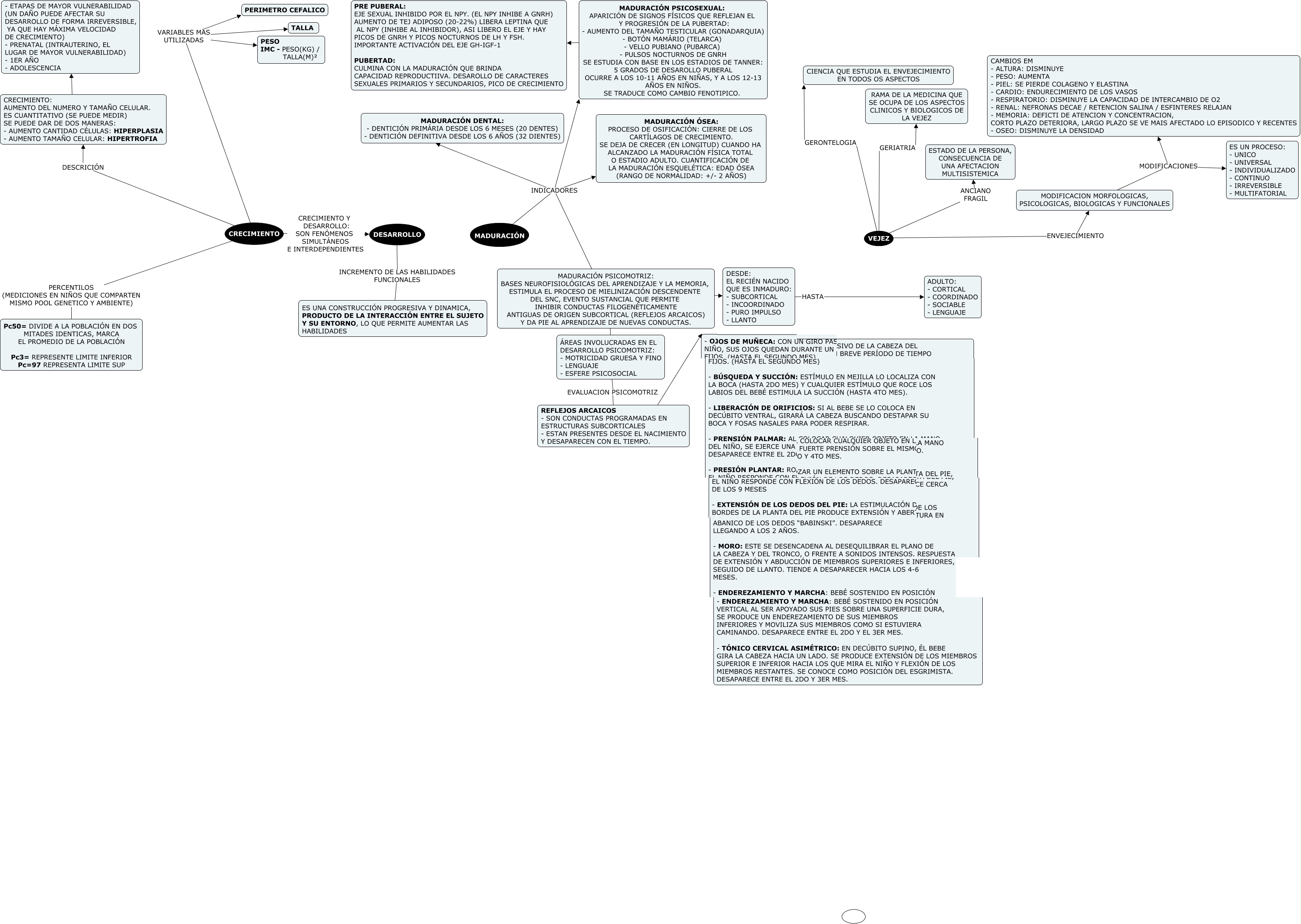 Este Cmap, tiene información relacionada con: N 9, MADURACIÓN PSICOSEXUAL: APARICIÓN DE SIGNOS FÍSICOS QUE REFLEJAN EL Y PROGRESIÓN DE LA PUBERTAD: - AUMENTO DEL TAMAÑO TESTICULAR (GONADARQUIA) - BOTÓN MAMÁRIO (TELARCA) - VELLO PUBIANO (PUBARCA) - PULSOS NOCTURNOS DE GNRH SE ESTUDIA CON BASE EN LOS ESTADIOS DE TANNER: 5 GRADOS DE DESAROLLO PUBERAL OCURRE A LOS 10-11 AÑOS EN NIÑAS, Y A LOS 12-13 AÑOS EN NIÑOS. SE TRADUCE COMO CAMBIO FENOTIPICO. ???? PRE PUBERAL: EJE SEXUAL INHIBIDO POR EL NPY. (EL NPY INHIBE A GNRH) AUMENTO DE TEJ ADIPOSO (20-22%) LIBERA LEPTINA QUE AL NPY (INHIBE AL INHIBIDOR), ASI LIBERO EL EJE Y HAY PICOS DE GNRH Y PICOS NOCTURNOS DE LH Y FSH. IMPORTANTE ACTIVACIÓN DEL EJE GH-IGF-1 PUBERTAD: CULMINA CON LA MADURACIÓN QUE BRINDA CAPACIDAD REPRODUCTIIVA. DESAROLLO DE CARACTERES SEXUALES PRIMARIOS Y SECUNDARIOS, PICO DE CRECIMIENTO, MADURACIÓN INDICADORES MADURACIÓN DENTAL: - DENTICIÓN PRIMÁRIA DESDE LOS 6 MESES (20 DENTES) - DENTICIÓN DEFINITIVA DESDE LOS 6 AÑOS (32 DIENTES), MADURACIÓN INDICADORES MADURACIÓN PSICOSEXUAL: APARICIÓN DE SIGNOS FÍSICOS QUE REFLEJAN EL Y PROGRESIÓN DE LA PUBERTAD: - AUMENTO DEL TAMAÑO TESTICULAR (GONADARQUIA) - BOTÓN MAMÁRIO (TELARCA) - VELLO PUBIANO (PUBARCA) - PULSOS NOCTURNOS DE GNRH SE ESTUDIA CON BASE EN LOS ESTADIOS DE TANNER: 5 GRADOS DE DESAROLLO PUBERAL OCURRE A LOS 10-11 AÑOS EN NIÑAS, Y A LOS 12-13 AÑOS EN NIÑOS. SE TRADUCE COMO CAMBIO FENOTIPICO., MODIFICACION MORFOLOGICAS, PSICOLOGICAS, BIOLOGICAS Y FUNCIONALES MODIFICACIONES CAMBIOS EM - ALTURA: DISMINUYE - PESO: AUMENTA - PIEL: SE PIERDE COLAGENO Y ELASTINA - CARDIO: ENDURECIMIENTO DE LOS VASOS - RESPIRATORIO: DISMINUYE LA CAPACIDAD DE INTERCAMBIO DE O2 - RENAL: NEFRONAS DECAE / RETENCION SALINA / ESFINTERES RELAJAN - MEMORIA: DEFICTI DE ATENCION Y CONCENTRACION, CORTO PLAZO DETERIORA, LARGO PLAZO SE VE MAIS AFECTADO LO EPISODICO Y RECENTES - OSEO: DISMINUYE LA DENSIDAD, VEJEZ ANCIANO FRAGIL ESTADO DE LA PERSONA, CONSECUENCIA DE UNA AFECTACION MULTISISTEMICA, CRECIMIENTO CRECIMIENTO Y DESARROLLO: SON FENÓMENOS SIMULTÁNEOS E INTERDEPENDIENTES DESARROLLO, REFLEJOS ARCAICOS - SON CONDUCTAS PROGRAMADAS EN ESTRUCTURAS SUBCORTICALES - ESTAN PRESENTES DESDE EL NACIMIENTO Y DESAPARECEN CON EL TIEMPO. ???? - OJOS DE MUÑECA: CON UN GIRO PASIVO DE LA CABEZA DEL NIÑO, SUS OJOS QUEDAN DURANTE UN BREVE PERÍODO DE TIEMPO FIJOS. (HASTA EL SEGUNDO MES) - BÚSQUEDA Y SUCCIÓN: ESTÍMULO EN MEJILLA LO LOCALIZA CON LA BOCA (HASTA 2DO MES) Y CUALQUIER ESTÍMULO QUE ROCE LOS LABIOS DEL BEBÉ ESTIMULA LA SUCCIÓN (HASTA 4TO MES). - LIBERACIÓN DE ORIFICIOS: SI AL BEBE SE LO COLOCA EN DECÚBITO VENTRAL, GIRARÁ LA CABEZA BUSCANDO DESTAPAR SU BOCA Y FOSAS NASALES PARA PODER RESPIRAR. - PRENSIÓN PALMAR: AL COLOCAR CUALQUIER OBJETO EN LA MANO DEL NIÑO, SE EJERCE UNA FUERTE PRENSIÓN SOBRE EL MISMO. DESAPARECE ENTRE EL 2DO Y 4TO MES. - PRESIÓN PLANTAR: ROZAR UN ELEMENTO SOBRE LA PLANTA DEL PIE, EL NIÑO RESPONDE CON FLEXIÓN DE LOS DEDOS. DESAPARECE CERCA DE LOS 9 MESES - EXTENSIÓN DE LOS DEDOS DEL PIE: LA ESTIMULACIÓN DE LOS BORDES DE LA PLANTA DEL PIE PRODUCE EXTENSIÓN Y ABERTURA EN ABANICO DE LOS DEDOS “BABINSKI”. DESAPARECE LLEGANDO A LOS 2 AÑOS. - MORO: ESTE SE DESENCADENA AL DESEQUILIBRAR EL PLANO DE LA CABEZA Y DEL TRONCO, O FRENTE A SONIDOS INTENSOS. RESPUESTA DE EXTENSIÓN Y ABDUCCIÓN DE MIEMBROS SUPERIORES E INFERIORES, SEGUIDO DE LLANTO. TIENDE A DESAPARECER HACIA LOS 4-6 MESES. - ENDEREZAMIENTO Y MARCHA: BEBÉ SOSTENIDO EN POSICIÓN VERTICAL AL SER APOYADO SUS PIES SOBRE UNA SUPERFICIE DURA, SE PRODUCE UN ENDEREZAMIENTO DE SUS MIEMBROS INFERIORES Y MOVILIZA SUS MIEMBROS COMO SI ESTUVIERA CAMINANDO. DESAPARECE ENTRE EL 2DO Y EL 3ER MES. - TÓNICO CERVICAL ASIMÉTRICO: EN DECÚBITO SUPINO, ÉL BEBE GIRA LA CABEZA HACIA UN LADO. SE PRODUCE EXTENSIÓN DE LOS MIEMBROS SUPERIOR E INFERIOR HACIA LOS QUE MIRA EL NIÑO Y FLEXIÓN DE LOS MIEMBROS RESTANTES. SE CONOCE COMO POSICIÓN DEL ESGRIMISTA. DESAPARECE ENTRE EL 2DO Y 3ER MES., CRECIMIENTO VARIABLES MAS UTILIZADAS PERIMETRO CEFALICO, MODIFICACION MORFOLOGICAS, PSICOLOGICAS, BIOLOGICAS Y FUNCIONALES MODIFICACIONES ES UN PROCESO: - UNICO - UNIVERSAL - INDIVIDUALIZADO - CONTINUO - IRREVERSIBLE - MULTIFATORIAL, VEJEZ ENVEJECIMIENTO MODIFICACION MORFOLOGICAS, PSICOLOGICAS, BIOLOGICAS Y FUNCIONALES, CRECIMIENTO PERCENTILOS (MEDICIONES EN NIÑOS QUE COMPARTEN MISMO POOL GENETICO Y AMBIENTE) Pc50= DIVIDE A LA POBLACIÓN EN DOS MITADES IDENTICAS, MARCA EL PROMEDIO DE LA POBLACIÓN Pc3= REPRESENTE LIMITE INFERIOR Pc=97 REPRESENTA LIMITE SUP, VEJEZ GERIATRIA RAMA DE LA MEDICINA QUE SE OCUPA DE LOS ASPECTOS CLINICOS Y BIOLOGICOS DE LA VEJEZ, CRECIMIENTO: AUMENTO DEL NUMERO Y TAMAÑO CELULAR. ES CUANTITATIVO (SE PUEDE MEDIR) SE PUEDE DAR DE DOS MANERAS: - AUMENTO CANTIDAD CÉLULAS: HIPERPLASIA - AUMENTO TAMAÑO CELULAR: HIPERTROFIA ???? - ETAPAS DE MAYOR VULNERABILIDAD (UN DAÑO PUEDE AFECTAR SU DESARROLLO DE FORMA IRREVERSIBLE, YA QUE HAY MÁXIMA VELOCIDAD DE CRECIMIENTO) - PRENATAL (INTRAUTERINO, EL LUGAR DE MAYOR VULNERABILIDAD) - 1ER AÑO - ADOLESCENCIA, DESDE: EL RECIÉN NACIDO QUE ES INMADURO: - SUBCORTICAL - INCOORDINADO - PURO IMPULSO - LLANTO HASTA ADULTO: - CORTICAL - COORDINADO - SOCIABLE - LENGUAJE, MADURACIÓN PSICOMOTRIZ: BASES NEUROFISIOLÓGICAS DEL APRENDIZAJE Y LA MEMORIA, ESTIMULA EL PROCESO DE MIELINIZACIÓN DESCENDENTE DEL SNC, EVENTO SUSTANCIAL QUE PERMITE INHIBIR CONDUCTAS FILOGENÉTICAMENTE ANTIGUAS DE ORIGEN SUBCORTICAL (REFLEJOS ARCAICOS) Y DA PIE AL APRENDIZAJE DE NUEVAS CONDUCTAS. ???? ÁREAS INVOLUCRADAS EN EL DESARROLLO PSICOMOTRIZ: - MOTRICIDAD GRUESA Y FINO - LENGUAJE - ESFERE PSICOSOCIAL, MADURACIÓN INDICADORES MADURACIÓN ÓSEA: PROCESO DE OSIFICACIÓN: CIERRE DE LOS CARTÍLAGOS DE CRECIMIENTO. SE DEJA DE CRECER (EN LONGITUD) CUANDO HA ALCANZADO LA MADURACIÓN FÍSICA TOTAL O ESTADIO ADULTO. CUANTIFICACIÓN DE LA MADURACIÓN ESQUELÉTICA: EDAD ÓSEA (RANGO DE NORMALIDAD: +/- 2 A