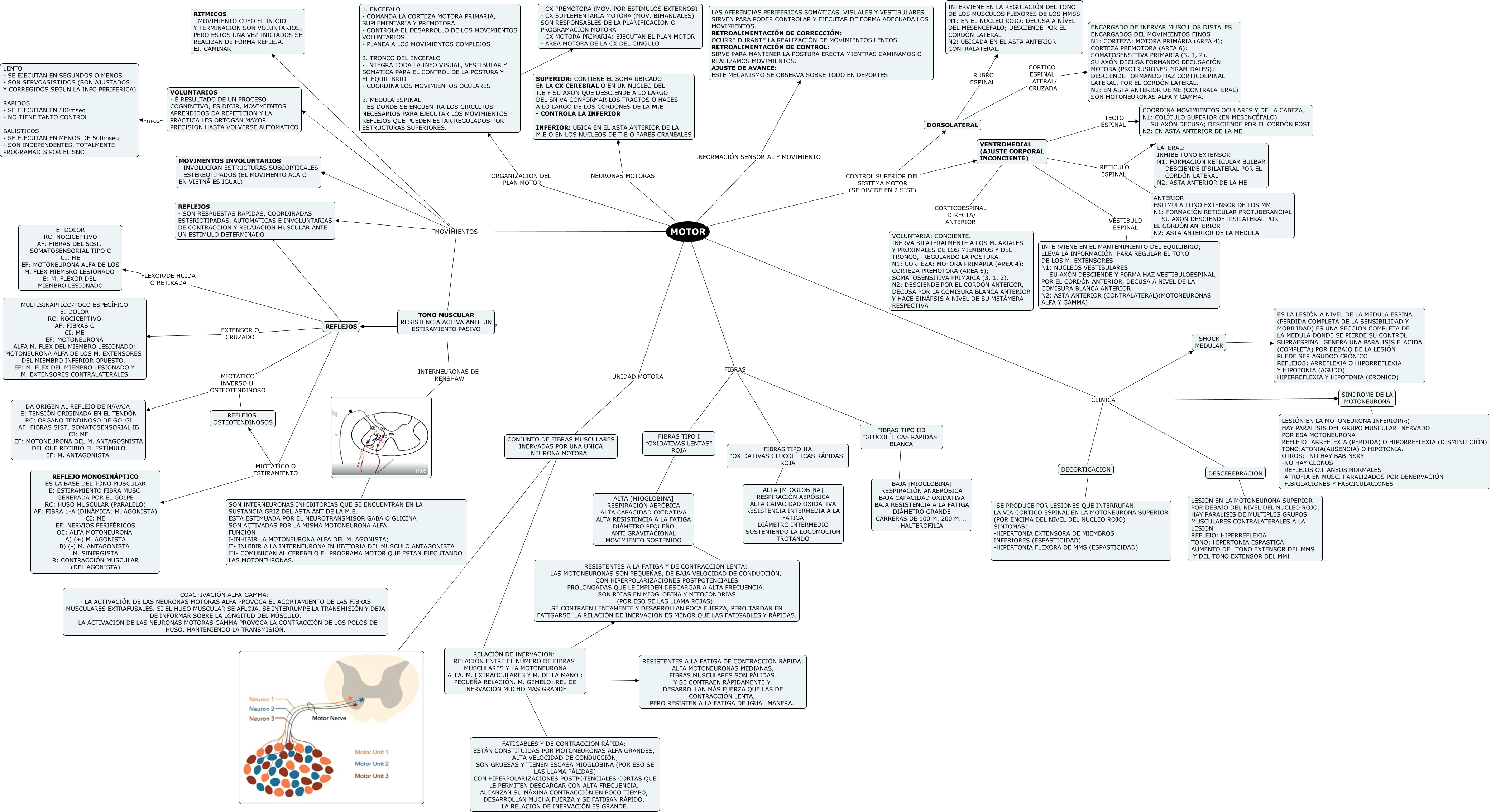 Este Cmap, tiene información relacionada con: N5, CONJUNTO DE FIBRAS MUSCULARES INERVADAS POR UNA UNICA NEURONA MOTORA. ???? RELACIÓN DE INERVACIÓN: RELACIÓN ENTRE EL NÚMERO DE FIBRAS MUSCULARES Y LA MOTONEURONA ALFA. M. EXTRAOCULARES Y M. DE LA MANO : PEQUEÑA RELACIÓN. M. GEMELO: REL DE INERVACIÓN MUCHO MAS GRANDE, SINDROME DE LA MOTONEURONA ???? LESIÓN EN LA MOTONEURONA INFERIOR(α) HAY PARALISIS DEL GRUPO MUSCULAR INERVADO POR ESA MOTONEURONA REFLEJO: ARREFLEXIA (PERDIDA) O HIPORREFLEXIA (DISMINUICIÓN) TONO:ATONIA(AUSENCIA) O HIPOTONIA. OTROS:- NO HAY BABINSKY -NO HAY CLONUS -REFLEJOS CUTANEOS NORMALES -ATROFIA EN MUSC. PARALIZADOS POR DENERVACIÓN -FIBRILACIONES Y FASCICULACIONES, 1. ENCEFALO - COMANDA LA CORTEZA MOTORA PRIMARIA, SUPLEMENTARIA Y PREMOTORA - CONTROLA EL DESARROLLO DE LOS MOVIMIENTOS VOLUNTARIOS - PLANEA A LOS MOVIMIENTOS COMPLEJOS 2. TRONCO DEL ENCEFALO - INTEGRA TODA LA INFO VISUAL, VESTIBULAR Y SOMATICA PARA EL CONTROL DE LA POSTURA Y EL EQUILIBRIO - COORDINA LOS MOVIMIENTOS OCULARES 3. MEDULA ESPINAL - ES DONDE SE ENCUENTRA LOS CIRCUITOS NECESARIOS PARA EJECUTAR LOS MOVIMIENTOS REFLEJOS QUE PUEDEN ESTAR REGULADOS POR ESTRUCTURAS SUPERIORES. COR - CX PREMOTORA (MOV. POR ESTIMULOS EXTERNOS) - CX SUPLEMENTARIA MOTORA (MOV. BIMANUALES) SON RESPONSABLES DE LA PLANIFICACION O PROGRAMACION MOTORA - CX MOTORA PRIMARIA: EJECUTAN EL PLAN MOTOR - AREA MOTORA DE LA CX DEL CINGULO, REFLEJOS MIOTATICO INVERSO U OSTEOTENDINOSO DÁ ORIGEN AL REFLEJO DE NAVAJA E: TENSIÓN ORIGINADA EN EL TENDÓN RC: ORGANO TENDINOSO DE GOLGI AF: FIBRAS SIST. SOMATOSENSORIAL IB CI: ME EF: MOTONEURONA DEL M. ANTAGOSNISTA DEL QUE RECIBIÓ EL ESTÍMULO EF: M. ANTAGONISTA, MOTOR UNIDAD MOTORA CONJUNTO DE FIBRAS MUSCULARES INERVADAS POR UNA UNICA NEURONA MOTORA., FIBRAS TIPO IIB “GLUCOLÍTICAS RÁPIDAS” BLANCA ???? BAJA [MIOGLOBINA] RESPIRACIÓN ANAERÓBICA BAJA CAPACIDAD OXIDATIVA BAJA RESISTENCIA A LA FATIGA DIÁMETRO GRANDE CARRERAS DE 100 M, 200 M. … HALTEROFILIA, MOTOR CONTROL SUPERIOR DEL SISTEMA MOTOR (SE DIVIDE EN 2 SIST) DORSOLATERAL, MOTOR CONTROL SUPERIOR DEL SISTEMA MOTOR (SE DIVIDE EN 2 SIST) VENTROMEDIAL (AJUSTE CORPORAL INCONCIENTE), MOTOR INFORMACIÓN SENSORIAL Y MOVIMIENTO LAS AFERENCIAS PERIFÉRICAS SOMÁTICAS, VISUALES Y VESTIBULARES, SIRVEN PARA PODER CONTROLAR Y EJECUTAR DE FORMA ADECUADA LOS MOVIMIENTOS. RETROALIMENTACIÓN DE CORRECCIÓN: OCURRE DURANTE LA REALIZACIÓN DE MOVIMIENTOS LENTOS. RETROALIMENTACIÓN DE CONTROL: SIRVE PARA MANTENER LA POSTURA ERECTA MIENTRAS CAMINAMOS O REALIZAMOS MOVIMIENTOS. AJUSTE DE AVANCE: ESTE MECANISMO SE OBSERVA SOBRE TODO EN DEPORTES, REFLEJOS - SON RESPUESTAS RAPIDAS, COORDINADAS ESTERIOTIPADAS, AUTOMATICAS E INVOLUNTARIAS DE CONTRACCIÓN Y RELAJACIÓN MUSCULAR ANTE UN ESTIMULO DETERMINADO ???? REFLEJOS, RELACIÓN DE INERVACIÓN: RELACIÓN ENTRE EL NÚMERO DE FIBRAS MUSCULARES Y LA MOTONEURONA ALFA. M. EXTRAOCULARES Y M. DE LA MANO : PEQUEÑA RELACIÓN. M. GEMELO: REL DE INERVACIÓN MUCHO MAS GRANDE ???? RESISTENTES A LA FATIGA DE CONTRACCIÓN RÁPIDA: ALFA MOTONEURONAS MEDIANAS, FIBRAS MUSCULARES SON PÁLIDAS Y SE CONTRAEN RÁPIDAMENTE Y DESARROLLAN MÁS FUERZA QUE LAS DE CONTRACCIÓN LENTA, PERO RESISTEN A LA FATIGA DE IGUAL MANERA., TONO MUSCULAR RESISTENCIA ACTIVA ANTE UN ESTIRAMIENTO PASIVO INTERNEURONAS DE RENSHAW ????, MOTOR CLINICA DECORTICACION, VENTROMEDIAL (AJUSTE CORPORAL INCONCIENTE) VESTIBULO ESPINAL INTERVIENE EN EL MANTENIMIENTO DEL EQUILIBRIO; LLEVA LA INFORMACIÓN PARA REGULAR EL TONO DE LOS M. EXTENSORES N1: NUCLEOS VESTIBULARES SU AXÓN DESCIENDE Y FORMA HAZ VESTIBULOESPINAL, POR EL CORDÓN ANTERIOR, DECUSA A NIVEL DE LA COMISURA BLANCA ANTERIOR N2: ASTA ANTERIOR (CONTRALATERAL)(MOTONEURONAS ALFA Y GAMMA), SHOCK MEDULAR ???? ES LA LESIÓN A NIVEL DE LA MEDULA ESPINAL (PERDIDA COMPLETA DE LA SENSIBILIDAD Y MOBILIDAD) ES UNA SECCIÓN COMPLETA DE LA MEDULA DONDE SE PIERDE SU CONTROL SUPRAESPINAL GENERA UNA PARALISIS FLACIDA (COMPLETA) POR DEBAJO DE LA LESIÓN PUEDE SER AGUDOO CRÓNICO REFLEJOS: ARREFLEXIA O HIPORREFLEXIA Y HIPOTONIA (AGUDO) HIPERREFLEXIA Y HIPOTONIA (CRONICO), FIBRAS TIPO IIA “OXIDATIVAS GLUCOLÍTICAS RÁPIDAS” ROJA ???? ALTA [MIOGLOBINA] RESPIRACIÓN AERÓBICA ALTA CAPACIDAD OXIDATIVA RESISTENCIA INTERMEDIA A LA FATIGA DIÁMETRO INTERMEDIO SOSTENIENDO LA LOCOMOCIÓN TROTANDO, MOTOR FIBRAS FIBRAS TIPO IIA “OXIDATIVAS GLUCOLÍTICAS RÁPIDAS” ROJA, DORSOLATERAL CORTICO ESPINAL LATERAL/ CRUZADA ENCARGADO DE INERVAR MUSCULOS DISTALES ENCARGADOS DEL MOVIMIENTOS FINOS N1: CORTEZA: MOTORA PRIMÁRIA (AREA 4); CORTEZA PREMOTORA (AREA 6); SOMATOSENSITIVA PRIMARIA (3, 1, 2). SU AXÓN DECUSA FORMANDO DECUSACIÓN MOTORA (PROTRUSIONES PIRAMIDALES); DESCIENDE FORMANDO HAZ CORTICOEPINAL LATERAL, POR EL CORDÓN LATERAL. N2: EN ASTA ANTERIOR DE ME (CONTRALATERAL) SON MOTONEURONAS ALFA Y GAMMA., VENTROMEDIAL (AJUSTE CORPORAL INCONCIENTE) TECTO ESPINAL COORDINA MOVIMIENTOS OCULARES Y DE LA CABEZA; N1: COLÍCULO SUPERIOR (EN MESENCÉFALO) SU AXÓN DECUSA; DESCIENDE POR EL CORDÓN POST N2: EN ASTA ANTERIOR DE LA ME, MOTOR MOVIMIENTOS TONO MUSCULAR RESISTENCIA ACTIVA ANTE UN ESTIRAMIENTO PASIVO