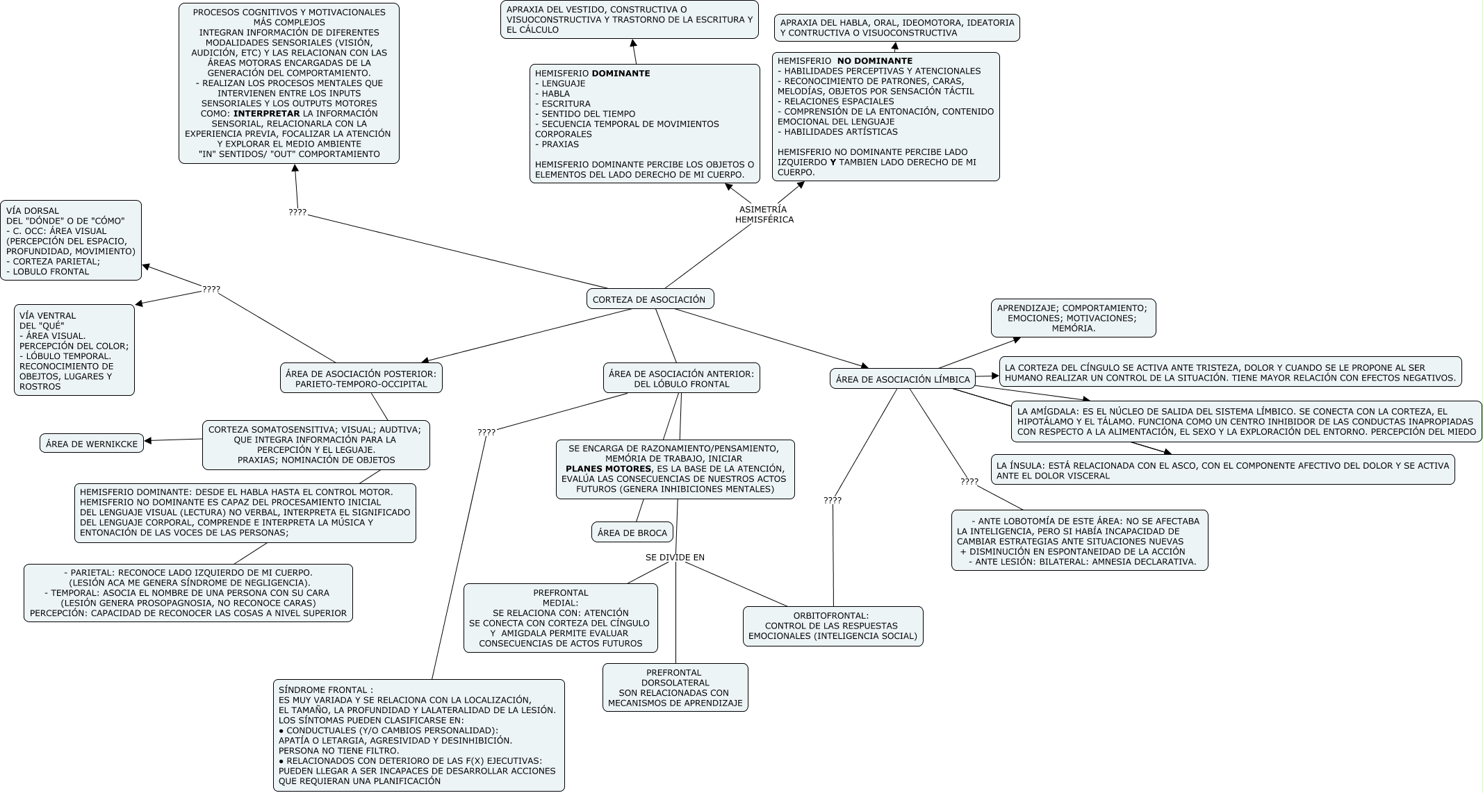 Este Cmap, tiene información relacionada con: N8. 2, ÁREA DE ASOCIACIÓN LÍMBICA ???? APRENDIZAJE; COMPORTAMIENTO; EMOCIONES; MOTIVACIONES; MEMÓRIA., ÁREA DE ASOCIACIÓN POSTERIOR: PARIETO-TEMPORO-OCCIPITAL ???? CORTEZA SOMATOSENSITIVA; VISUAL; AUDTIVA; QUE INTEGRA INFORMACIÓN PARA LA PERCEPCIÓN Y EL LEGUAJE. PRAXIAS; NOMINACIÓN DE OBJETOS, ÁREA DE ASOCIACIÓN LÍMBICA ???? LA ÍNSULA: ESTÁ RELACIONADA CON EL ASCO, CON EL COMPONENTE AFECTIVO DEL DOLOR Y SE ACTIVA ANTE EL DOLOR VISCERAL, ÁREA DE ASOCIACIÓN LÍMBICA ???? ORBITOFRONTAL: CONTROL DE LAS RESPUESTAS EMOCIONALES (INTELIGENCIA SOCIAL), ÁREA DE ASOCIACIÓN POSTERIOR: PARIETO-TEMPORO-OCCIPITAL ???? VÍA DORSAL DEL "DÓNDE" O DE "CÓMO" - C. OCC: ÁREA VISUAL (PERCEPCIÓN DEL ESPACIO, PROFUNDIDAD, MOVIMIENTO) - CORTEZA PARIETAL; - LOBULO FRONTAL, CORTEZA DE ASOCIACIÓN ???? ÁREA DE ASOCIACIÓN POSTERIOR: PARIETO-TEMPORO-OCCIPITAL, ÁREA DE ASOCIACIÓN LÍMBICA ???? - ANTE LOBOTOMÍA DE ESTE ÁREA: NO SE AFECTABA LA INTELIGENCIA, PERO SI HABÍA INCAPACIDAD DE CAMBIAR ESTRATEGIAS ANTE SITUACIONES NUEVAS + DISMINUCIÓN EN ESPONTANEIDAD DE LA ACCIÓN - ANTE LESIÓN: BILATERAL: AMNESIA DECLARATIVA., HEMISFERIO NO DOMINANTE - HABILIDADES PERCEPTIVAS Y ATENCIONALES - RECONOCIMIENTO DE PATRONES, CARAS, MELODÍAS, OBJETOS POR SENSACIÓN TÁCTIL - RELACIONES ESPACIALES - COMPRENSIÓN DE LA ENTONACIÓN, CONTENIDO EMOCIONAL DEL LENGUAJE - HABILIDADES ARTÍSTICAS HEMISFERIO NO DOMINANTE PERCIBE LADO IZQUIERDO Y TAMBIEN LADO DERECHO DE MI CUERPO. ???? APRAXIA DEL HABLA, ORAL, IDEOMOTORA, IDEATORIA Y CONTRUCTIVA O VISUOCONSTRUCTIVA, ÁREA DE ASOCIACIÓN POSTERIOR: PARIETO-TEMPORO-OCCIPITAL ???? - PARIETAL: RECONOCE LADO IZQUIERDO DE MI CUERPO. (LESIÓN ACA ME GENERA SÍNDROME DE NEGLIGENCIA). - TEMPORAL: ASOCIA EL NOMBRE DE UNA PERSONA CON SU CARA (LESIÓN GENERA PROSOPAGNOSIA, NO RECONOCE CARAS) PERCEPCIÓN: CAPACIDAD DE RECONOCER LAS COSAS A NIVEL SUPERIOR, CORTEZA DE ASOCIACIÓN ASIMETRÍA HEMISFÉRICA HEMISFERIO DOMINANTE - LENGUAJE - HABLA - ESCRITURA - SENTIDO DEL TIEMPO - SECUENCIA TEMPORAL DE MOVIMIENTOS CORPORALES - PRAXIAS HEMISFERIO DOMINANTE PERCIBE LOS OBJETOS O ELEMENTOS DEL LADO DERECHO DE MI CUERPO., ÁREA DE ASOCIACIÓN ANTERIOR: DEL LÓBULO FRONTAL SE DIVIDE EN PREFRONTAL MEDIAL: SE RELACIONA CON: ATENCIÓN SE CONECTA CON CORTEZA DEL CÍNGULO Y AMIGDALA PERMITE EVALUAR CONSECUENCIAS DE ACTOS FUTUROS, CORTEZA DE ASOCIACIÓN ???? ÁREA DE ASOCIACIÓN ANTERIOR: DEL LÓBULO FRONTAL, CORTEZA DE ASOCIACIÓN ???? ÁREA DE ASOCIACIÓN LÍMBICA, ÁREA DE ASOCIACIÓN LÍMBICA ???? LA AMÍGDALA: ES EL NÚCLEO DE SALIDA DEL SISTEMA LÍMBICO. SE CONECTA CON LA CORTEZA, EL HIPOTÁLAMO Y EL TÁLAMO. FUNCIONA COMO UN CENTRO INHIBIDOR DE LAS CONDUCTAS INAPROPIADAS CON RESPECTO A LA ALIMENTACIÓN, EL SEXO Y LA EXPLORACIÓN DEL ENTORNO. PERCEPCIÓN DEL MIEDO, ÁREA DE ASOCIACIÓN LÍMBICA ???? LA CORTEZA DEL CÍNGULO SE ACTIVA ANTE TRISTEZA, DOLOR Y CUANDO SE LE PROPONE AL SER HUMANO REALIZAR UN CONTROL DE LA SITUACIÓN. TIENE MAYOR RELACIÓN CON EFECTOS NEGATIVOS., ÁREA DE ASOCIACIÓN ANTERIOR: DEL LÓBULO FRONTAL ???? SÍNDROME FRONTAL : ES MUY VARIADA Y SE RELACIONA CON LA LOCALIZACIÓN, EL TAMAÑO, LA PROFUNDIDAD Y LALATERALIDAD DE LA LESIÓN. LOS SÍNTOMAS PUEDEN CLASIFICARSE EN: ● CONDUCTUALES (Y/O CAMBIOS PERSONALIDAD): APATÍA O LETARGIA, AGRESIVIDAD Y DESINHIBICIÓN. PERSONA NO TIENE FILTRO. ● RELACIONADOS CON DETERIORO DE LAS F(X) EJECUTIVAS: PUEDEN LLEGAR A SER INCAPACES DE DESARROLLAR ACCIONES QUE REQUIERAN UNA PLANIFICACIÓN, CORTEZA SOMATOSENSITIVA; VISUAL; AUDTIVA; QUE INTEGRA INFORMACIÓN PARA LA PERCEPCIÓN Y EL LEGUAJE. PRAXIAS; NOMINACIÓN DE OBJETOS ???? ÁREA DE WERNIKCKE, ÁREA DE ASOCIACIÓN ANTERIOR: DEL LÓBULO FRONTAL SE DIVIDE EN PREFRONTAL DORSOLATERAL SON RELACIONADAS CON MECANISMOS DE APRENDIZAJE, ÁREA DE ASOCIACIÓN ANTERIOR: DEL LÓBULO FRONTAL SE DIVIDE EN ORBITOFRONTAL: CONTROL DE LAS RESPUESTAS EMOCIONALES (INTELIGENCIA SOCIAL), CORTEZA DE ASOCIACIÓN ???? PROCESOS COGNITIVOS Y MOTIVACIONALES MÁS COMPLEJOS INTEGRAN INFORMACIÓN DE DIFERENTES MODALIDADES SENSORIALES (VISIÓN, AUDICIÓN, ETC) Y LAS RELACIONAN CON LAS ÁREAS MOTORAS ENCARGADAS DE LA GENERACIÓN DEL COMPORTAMIENTO. - REALIZAN LOS PROCESOS MENTALES QUE INTERVIENEN ENTRE LOS INPUTS SENSORIALES Y LOS OUTPUTS MOTORES COMO: INTERPRETAR LA INFORMACIÓN SENSORIAL, RELACIONARLA CON LA EXPERIENCIA PREVIA, FOCALIZAR LA ATENCIÓN Y EXPLORAR EL MEDIO AMBIENTE "IN" SENTIDOS/ "OUT" COMPORTAMIENTO