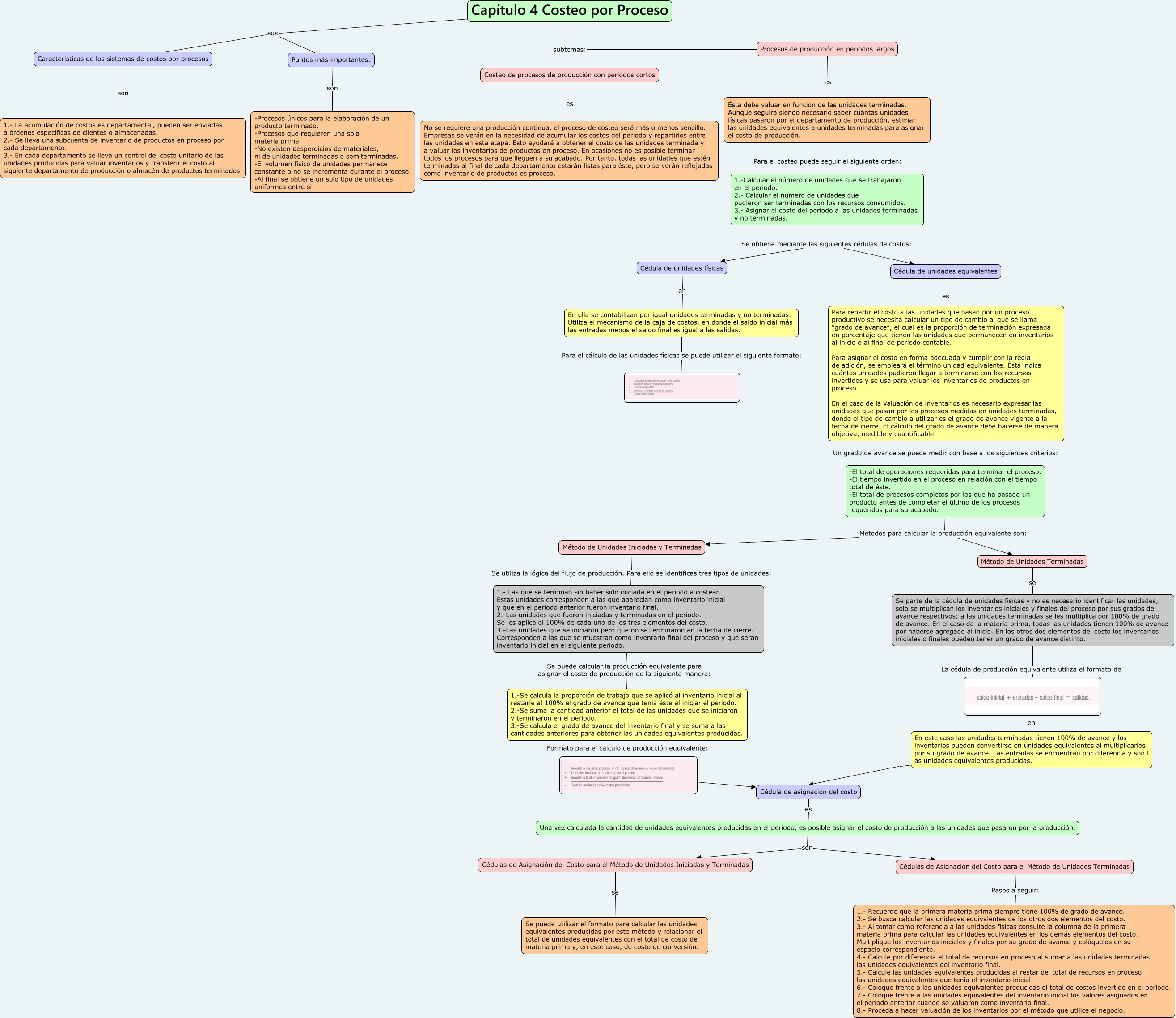 Este Cmap, tiene información relacionada con: MAPA CONCEPTUAL, Una vez calculada la cantidad de unidades equivalentes producidas en el periodo, es posible asignar el costo de producción a las unidades que pasaron por la producción. son Cédulas de Asignación del Costo para el Método de Unidades Iniciadas y Terminadas, Cédula de asignación del costo es Una vez calculada la cantidad de unidades equivalentes producidas en el periodo, es posible asignar el costo de producción a las unidades que pasaron por la producción., Cédulas de Asignación del Costo para el Método de Unidades Iniciadas y Terminadas se Se puede utilizar el formato para calcular las unidades equivalentes producidas por este método y relacionar el total de unidades equivalentes con el total de costo de materia prima y, en este caso, de costo de conversión., Método de Unidades Iniciadas y Terminadas Se utiliza la lógica del flujo de producción. Para ello se identificas tres tipos de unidades: 1.- Las que se terminan sin haber sido iniciada en el periodo a costear. Estas unidades corresponden a las que aparecían como inventario inicial y que en el periodo anterior fueron inventario final. 2.-Las unidades que fueron iniciadas y terminadas en el periodo. Se les aplica el 100% de cada uno de los tres elementos del costo. 3.-Las unidades que se iniciaron pero que no se terminaron en la fecha de cierre. Corresponden a las que se muestran como inventario final del proceso y que serán inventario inicial en el siguiente periodo., Costeo de procesos de producción con periodos cortos es No se requiere una producción continua, el proceso de costeo será más o menos sencillo. Empresas se verán en la necesidad de acumular los costos del periodo y repartirlos entre las unidades en esta etapa. Esto ayudará a obtener el costo de las unidades terminada y a valuar los inventarios de productos en proceso. En ocasiones no es posible terminar todos los procesos para que lleguen a su acabado. Por tanto, todas las unidades que estén terminadas al final de cada departamento estarán listas para éste, pero se verán reflejadas como inventario de productos es proceso., Ésta debe valuar en función de las unidades terminadas. Aunque seguirá siendo necesario saber cuántas unidades físicas pasaron por el departamento de producción, estimar las unidades equivalentes a unidades terminadas para asignar el costo de producción. Para el costeo puede seguir el siguiente orden: 1.-Calcular el número de unidades que se trabajaron en el periodo. 2.- Calcular el número de unidades que pudieron ser terminadas con los recursos consumidos. 3.- Asignar el costo del periodo a las unidades terminadas y no terminadas., Puntos más importantes: son -Procesos únicos para la elaboración de un producto terminado. -Procesos que requieren una sola materia prima. -No existen desperdicios de materiales, ni de unidades terminadas o semiterminadas. -El volumen físico de unidades permanece constante o no se incrementa durante el proceso. -Al final se obtiene un solo tipo de unidades uniformes entre sí., 1.-Calcular el número de unidades que se trabajaron en el periodo. 2.- Calcular el número de unidades que pudieron ser terminadas con los recursos consumidos. 3.- Asignar el costo del periodo a las unidades terminadas y no terminadas. Se obtiene mediante las siguientes cédulas de costos: Cédula de unidades equivalentes, En este caso las unidades terminadas tienen 100% de avance y los inventarios pueden convertirse en unidades equivalentes al multiplicarlos por su grado de avance. Las entradas se encuentran por diferencia y son l as unidades equivalentes producidas. Cédula de asignación del costo, Cédula de unidades físicas en En ella se contabilizan por igual unidades terminadas y no terminadas. Utiliza el mecanismo de la caja de costos, en donde el saldo inicial más las entradas menos el saldo final es igual a las salidas., Método de Unidades Terminadas se Se parte de la cédula de unidades físicas y no es necesario identificar las unidades, sólo se multiplican los inventarios iniciales y finales del proceso por sus grados de avance respectivos; a las unidades terminadas se les multiplica por 100% de grado de avance. En el caso de la materia prima, todas las unidades tienen 100% de avance por haberse agregado al inicio. En los otros dos elementos del costo los inventarios iniciales o finales pueden tener un grado de avance distinto., Cédula de unidades equivalentes es Para repartir el costo a las unidades que pasan por un proceso productivo se necesita calcular un tipo de cambio al que se llama “grado de avance”, el cual es la proporción de terminación expresada en porcentaje que tienen las unidades que permanecen en inventarios al inicio o al final de periodo contable. Para asignar el costo en forma adecuada y cumplir con la regla de adición, se empleará el término unidad equivalente. Ésta indica cuántas unidades pudieron llegar a terminarse con los recursos invertidos y se usa para valuar los inventarios de productos en proceso. En el caso de la valuación de inventarios es necesario expresar las unidades que pasan por los procesos medidas en unidades terminadas, donde el tipo de cambio a utilizar es el grado de avance vigente a la fecha de cierre. El cálculo del grado de avance debe hacerse de manera objetiva, medible y cuantificable, Procesos de producción en periodos largos subtemas: Costeo de procesos de producción con periodos cortos, 1.- Las que se terminan sin haber sido iniciada en el periodo a costear. Estas unidades corresponden a las que aparecían como inventario inicial y que en el periodo anterior fueron inventario final. 2.-Las unidades que fueron iniciadas y terminadas en el periodo. Se les aplica el 100% de cada uno de los tres elementos del costo. 3.-Las unidades que se iniciaron pero que no se terminaron en la fecha de cierre. Corresponden a las que se muestran como inventario final del proceso y q