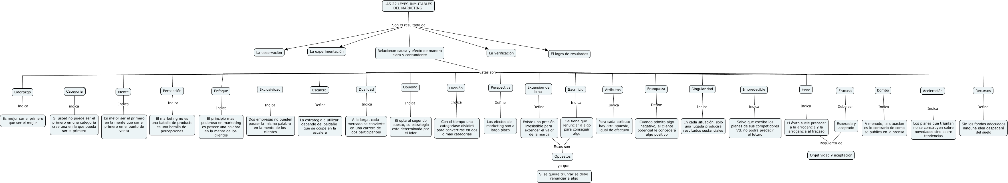 Este Cmap, tiene información relacionada con: Las 22 leyes del marketing, Esperado y aceptado Requieren de Onjetividad y aceptación, Percepción Indica El marketing no es una batalla de producto es una batalla de percepciones, Relacionan causa y efecto de manera clara y contundente Estas son Extensión de línea, Relacionan causa y efecto de manera clara y contundente Estas son Enfoque, Mente Indica Es mejor ser el primero en la mente que ser el primero en el punto de venta, Se tiene que renunciar a algo para conseguir algo Estos son Opuestos, Extensión de línea Define Existe una presión irresistible para extender el valor de la marca, Recursos Define Sin los fondos adecuados ninguna idea despegará del suelo, Relacionan causa y efecto de manera clara y contundente Estas son Exclusividad, Existe una presión irresistible para extender el valor de la marca Estos son Opuestos, Relacionan causa y efecto de manera clara y contundente Estas son Liderazgo, LAS 22 LEYES INMUTABLES DEL MARKETING Son el resultado de Relacionan causa y efecto de manera clara y contundente, Dualidad Indica A la larga, cada mercado se convierte en una carrera de dos participantes, Relacionan causa y efecto de manera clara y contundente Estas son Sacrificio, Relacionan causa y efecto de manera clara y contundente Estas son División, Perspectiva Define Los efectos del marketing son a largo plazo, Relacionan causa y efecto de manera clara y contundente Estas son Dualidad, Aceleración Indica Los planes que triunfan no se construyen sobre novedades sino sobre tendencias, Impredecible indica Salvo que escriba los planes de sus competidores Vd. no podrá predecir el futuro, Relacionan causa y efecto de manera clara y contundente Estas son Recursos