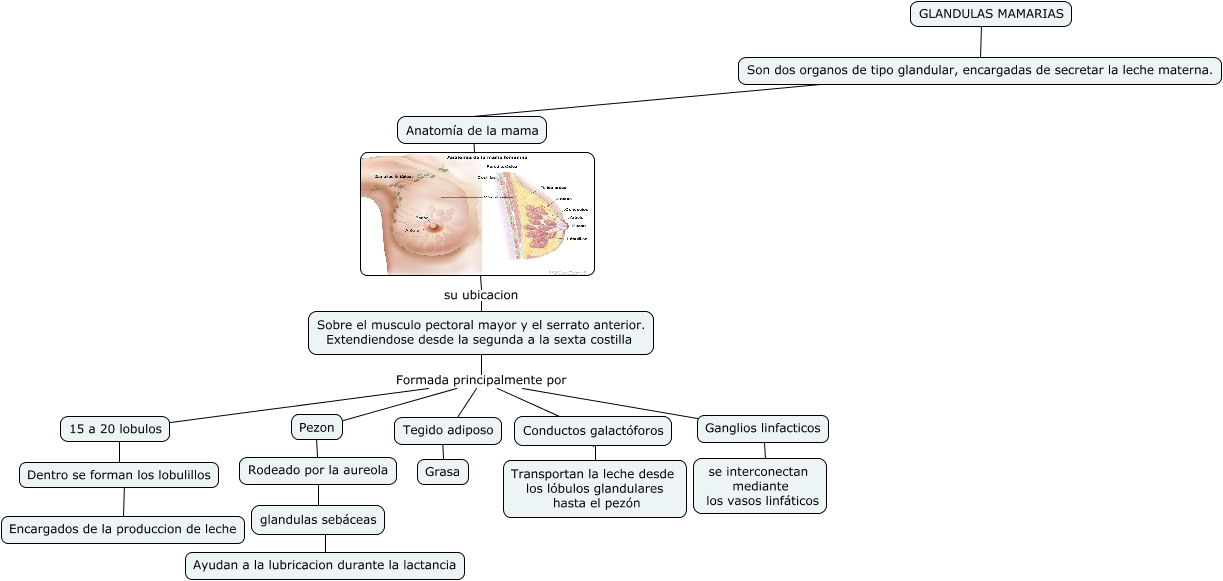 Este Cmap, tiene información relacionada con: mama, Sobre el musculo pectoral mayor y el serrato anterior. Extendiendose desde la segunda a la sexta costilla Formada principalmente por Ganglios linfacticos, Sobre el musculo pectoral mayor y el serrato anterior. Extendiendose desde la segunda a la sexta costilla Formada principalmente por 15 a 20 lobulos, Rodeado por la aureola ???? glandulas sebáceas, 15 a 20 lobulos ???? Dentro se forman los lobulillos, Pezon ???? Rodeado por la aureola, GLANDULAS MAMARIAS ???? Son dos organos de tipo glandular, encargadas de secretar la leche materna., Tegido adiposo ???? Grasa, Dentro se forman los lobulillos ???? Encargados de la produccion de leche, Sobre el musculo pectoral mayor y el serrato anterior. Extendiendose desde la segunda a la sexta costilla Formada principalmente por Pezon, Sobre el musculo pectoral mayor y el serrato anterior. Extendiendose desde la segunda a la sexta costilla Formada principalmente por Tegido adiposo, Ganglios linfacticos ???? se interconectan mediante los vasos linfáticos, glandulas sebáceas ???? Ayudan a la lubricacion durante la lactancia, Conductos galactóforos ???? Transportan la leche desde los lóbulos glandulares hasta el pezón, Son dos organos de tipo glandular, encargadas de secretar la leche materna. ???? Anatomía de la mama, ???? Anatomía de la mama, Sobre el musculo pectoral mayor y el serrato anterior. Extendiendose desde la segunda a la sexta costilla Formada principalmente por Conductos galactóforos, Sobre el musculo pectoral mayor y el serrato anterior. Extendiendose desde la segunda a la sexta costilla su ubicacion