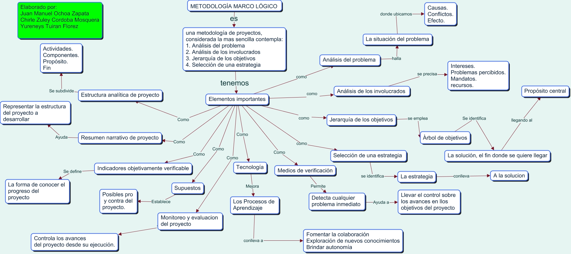 Este Cmap, tiene información relacionada con: Marco logico, Elementos importantes Como Estructura analítica de proyecto, Elementos importantes como Selección de una estrategia, Árbol de objetivos Se identifica La solución, el fin donde se quiere llegar, La solución, el fin donde se quiere llegar llegando al Propósito central, Elementos importantes Como Indicadores objetivamente verificable, La estrategia conlleva A la solucion, Resumen narrativo de proyecto Ayuda Representar la estructura del proyecto a desarrollar, una metodología de proyectos, considerada la mas sencilla contempla: 1. Análisis del problema 2. Análisis de los involucrados 3. Jerarquía de los objetivos 4. Selección de una estrategia tenemos Elementos importantes, Elementos importantes Como Tecnología, Indicadores objetivamente verificable Se define La forma de conocer el progreso del proyecto, METODOLOGÍA MARCO LÓGICO es una metodología de proyectos, considerada la mas sencilla contempla: 1. Análisis del problema 2. Análisis de los involucrados 3. Jerarquía de los objetivos 4. Selección de una estrategia, Jerarquía de los objetivos se emplea Árbol de objetivos, Elementos importantes como Análisis de los involucrados, Monitoreo y evaluacion del proyecto ???? Controla los avances del proyecto desde su ejecución., Elementos importantes Como Monitoreo y evaluacion del proyecto, Los Procesos de Aprendizaje conlleva a Fomentar la colaboración Exploración de nuevos conocimientos Brindar autonomía, Selección de una estrategia se identifica La estrategia, Estructura analítica de proyecto Se subdivide Actividades. Componentes. Propósito. Fin, Elementos importantes como Jerarquía de los objetivos, La situación del problema donde ubicamos Causas. Conflictos. Efecto.