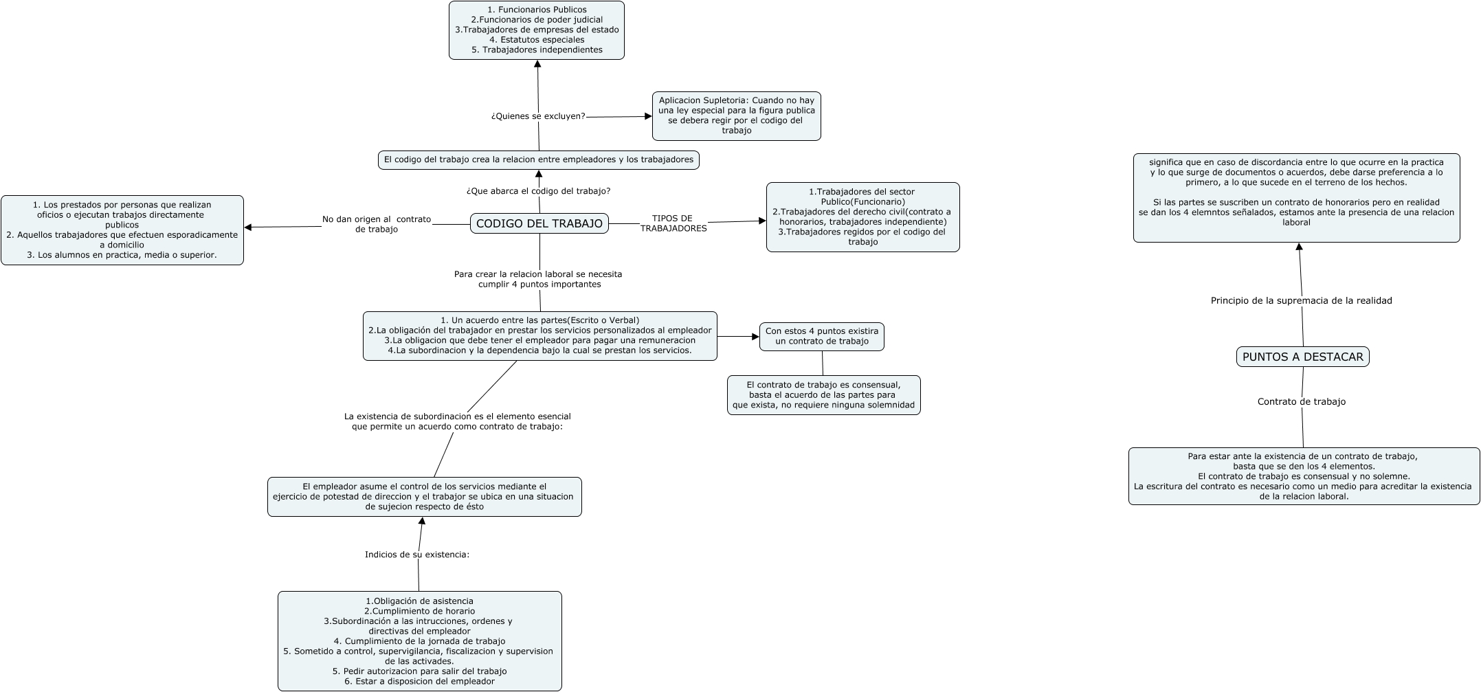 Este Cmap, tiene información relacionada con: Codigo del trabajo(lo basico), CODIGO DEL TRABAJO No dan origen al contrato de trabajo 1. Los prestados por personas que realizan oficios o ejecutan trabajos directamente publicos 2. Aquellos trabajadores que efectuen esporadicamente a domicilio 3. Los alumnos en practica, media o superior., CODIGO DEL TRABAJO Para crear la relacion laboral se necesita cumplir 4 puntos importantes 1. Un acuerdo entre las partes(Escrito o Verbal) 2.La obligación del trabajador en prestar los servicios personalizados al empleador 3.La obligacion que debe tener el empleador para pagar una remuneracion 4.La subordinacion y la dependencia bajo la cual se prestan los servicios., 1.Obligación de asistencia 2.Cumplimiento de horario 3.Subordinación a las intrucciones, ordenes y directivas del empleador 4. Cumplimiento de la jornada de trabajo 5. Sometido a control, supervigilancia, fiscalizacion y supervision de las activades. 5. Pedir autorizacion para salir del trabajo 6. Estar a disposicion del empleador Indicios de su existencia: El empleador asume el control de los servicios mediante el ejercicio de potestad de direccion y el trabajor se ubica en una situacion de sujecion respecto de ésto, 1. Un acuerdo entre las partes(Escrito o Verbal) 2.La obligación del trabajador en prestar los servicios personalizados al empleador 3.La obligacion que debe tener el empleador para pagar una remuneracion 4.La subordinacion y la dependencia bajo la cual se prestan los servicios. La existencia de subordinacion es el elemento esencial que permite un acuerdo como contrato de trabajo: El empleador asume el control de los servicios mediante el ejercicio de potestad de direccion y el trabajor se ubica en una situacion de sujecion respecto de ésto, CODIGO DEL TRABAJO TIPOS DE TRABAJADORES 1.Trabajadores del sector Publico(Funcionario) 2.Trabajadores del derecho civil(contrato a honorarios, trabajadores independiente) 3.Trabajadores regidos por el codigo del trabajo, PUNTOS A DESTACAR Principio de la supremacia de la realidad significa que en caso de discordancia entre lo que ocurre en la practica y lo que surge de documentos o acuerdos, debe darse preferencia a lo primero, a lo que sucede en el terreno de los hechos. Si las partes se suscriben un contrato de honorarios pero en realidad se dan los 4 elemntos señalados, estamos ante la presencia de una relacion laboral, Con estos 4 puntos existira un contrato de trabajo El contrato de trabajo es consensual, basta el acuerdo de las partes para que exista, no requiere ninguna solemnidad, El codigo del trabajo crea la relacion entre empleadores y los trabajadores ¿Quienes se excluyen? 1. Funcionarios Publicos 2.Funcionarios de poder judicial 3.Trabajadores de empresas del estado 4. Estatutos especiales 5. Trabajadores independientes, El codigo del trabajo crea la relacion entre empleadores y los trabajadores ¿Quienes se excluyen? Aplicacion Supletoria: Cuando no hay una ley especial para la figura publica se debera regir por el codigo del trabajo, 1. Un acuerdo entre las partes(Escrito o Verbal) 2.La obligación del trabajador en prestar los servicios personalizados al empleador 3.La obligacion que debe tener el empleador para pagar una remuneracion 4.La subordinacion y la dependencia bajo la cual se prestan los servicios. ???? Con estos 4 puntos existira un contrato de trabajo, PUNTOS A DESTACAR Contrato de trabajo Para estar ante la existencia de un contrato de trabajo, basta que se den los 4 elementos. El contrato de trabajo es consensual y no solemne. La escritura del contrato es necesario como un medio para acreditar la existencia de la relacion laboral., CODIGO DEL TRABAJO ¿Que abarca el codigo del trabajo? El codigo del trabajo crea la relacion entre empleadores y los trabajadores