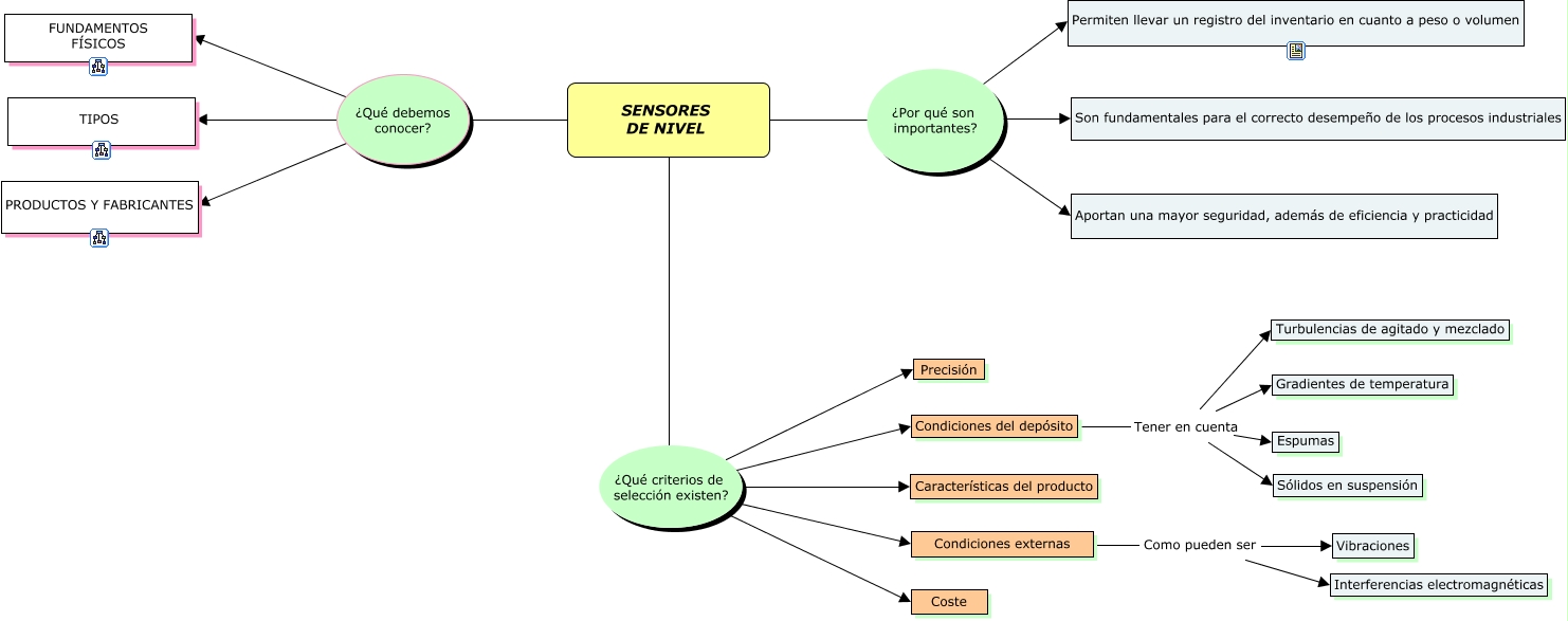 Este Cmap, tiene información relacionada con: 0.Sensores de Nivel, SENSORES DE NIVEL ¿Por qué son importantes? Permiten llevar un registro del inventario en cuanto a peso o volumen, Condiciones del depósito Tener en cuenta Espumas, Condiciones externas Como pueden ser Interferencias electromagnéticas, SENSORES DE NIVEL ¿Qué debemos conocer? PRODUCTOS Y FABRICANTES, Condiciones externas Como pueden ser Vibraciones, SENSORES DE NIVEL ¿Por qué son importantes? Son fundamentales para el correcto desempeño de los procesos industriales, SENSORES DE NIVEL ¿Qué debemos conocer? TIPOS, Condiciones del depósito Tener en cuenta Turbulencias de agitado y mezclado, SENSORES DE NIVEL ¿Qué criterios de selección existen? Condiciones externas, Condiciones del depósito Tener en cuenta Gradientes de temperatura, Condiciones del depósito Tener en cuenta Sólidos en suspensión, SENSORES DE NIVEL ¿Qué criterios de selección existen? Características del producto, SENSORES DE NIVEL ¿Por qué son importantes? Aportan una mayor seguridad, además de eficiencia y practicidad, SENSORES DE NIVEL ¿Qué criterios de selección existen? Coste, SENSORES DE NIVEL ¿Qué debemos conocer? FUNDAMENTOS FÍSICOS, SENSORES DE NIVEL ¿Qué criterios de selección existen? Precisión, SENSORES DE NIVEL ¿Qué criterios de selección existen? Condiciones del depósito