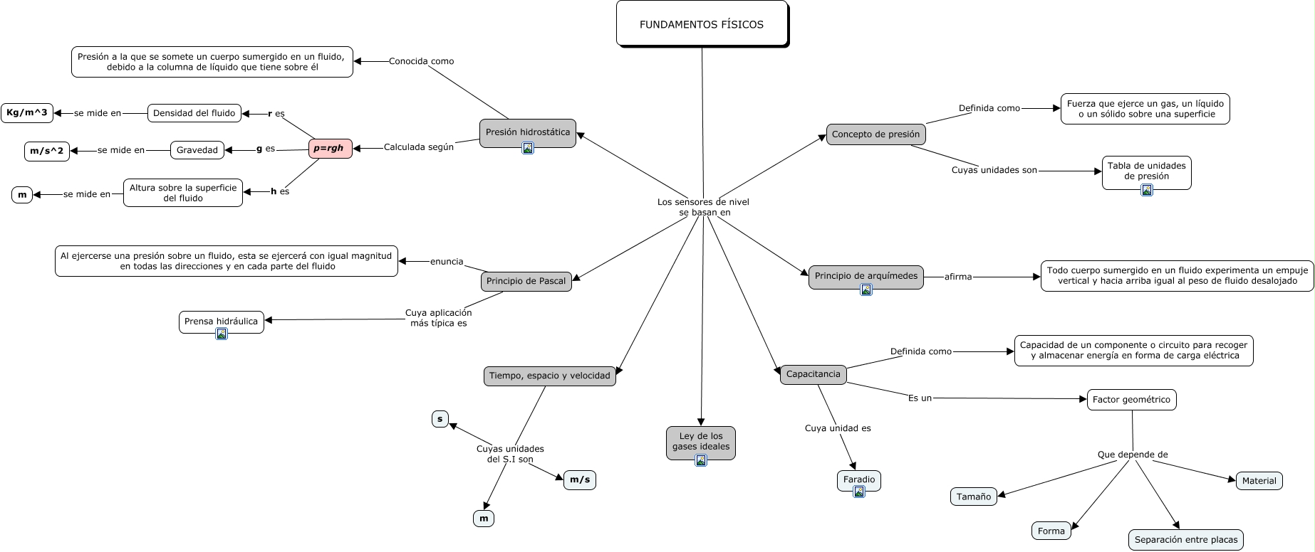 Este Cmap, tiene información relacionada con: 1.Fundamentos físicos, Factor geométrico Que depende de Tamaño, FUNDAMENTOS FÍSICOS Los sensores de nivel se basan en Principio de Pascal, Presión hidrostática Conocida como Presión a la que se somete un cuerpo sumergido en un fluido, debido a la columna de líquido que tiene sobre él, Factor geométrico Que depende de Separación entre placas, p=rgh h es Altura sobre la superficie del fluido, p=rgh r es Densidad del fluido, Principio de Pascal enuncia Al ejercerse una presión sobre un fluido, esta se ejercerá con igual magnitud en todas las direcciones y en cada parte del fluido, Tiempo, espacio y velocidad Cuyas unidades del S.I son m, Capacitancia Es un Factor geométrico, FUNDAMENTOS FÍSICOS Los sensores de nivel se basan en Capacitancia, Densidad del fluido se mide en Kg/m^3, Factor geométrico Que depende de Material, Principio de Pascal Cuya aplicación más típica es Prensa hidráulica, FUNDAMENTOS FÍSICOS Los sensores de nivel se basan en Concepto de presión, Concepto de presión Definida como Fuerza que ejerce un gas, un líquido o un sólido sobre una superficie, p=rgh g es Gravedad, Tiempo, espacio y velocidad Cuyas unidades del S.I son m/s, FUNDAMENTOS FÍSICOS Los sensores de nivel se basan en Ley de los gases ideales, Presión hidrostática Calculada según p=rgh, Factor geométrico Que depende de Forma