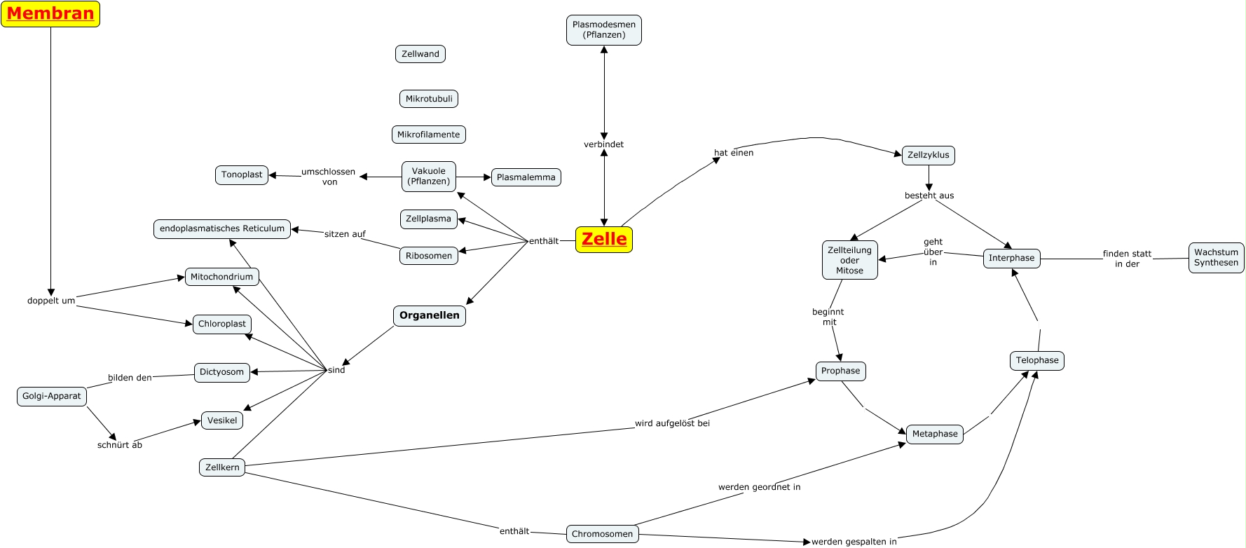 Dieses mit IHMC CmapTools erstellte CMap hat Informationen bezüglich: Cmap Zelle EF1 Boese Dst.cmap, Vakuole (Pflanzen) umschlossen von Tonoplast, Zelle enthält Vakuole (Pflanzen), Zellkern wird aufgelöst bei Prophase, Zelle enthält Ribosomen, Dictyosom bilden den Golgi-Apparat, Prophase Metaphase, Vakuole (Pflanzen) umschlossen von Plasmalemma, Chromosomen werden geordnet in Metaphase, Metaphase Telophase, Zellkern enthält Chromosomen, Zellzyklus besteht aus Zellteilung oder Mitose, Golgi-Apparat schnürt ab Vesikel, Chromosomen werden gespalten in Telophase, Zellteilung oder Mitose beginnt mit Prophase, Ribosomen sitzen auf endoplasmatisches Reticulum, Zellzyklus besteht aus Interphase, Zelle enthält Organellen, Organellen sind Mitochondrium, Telophase Interphase, Organellen sind endoplasmatisches Reticulum