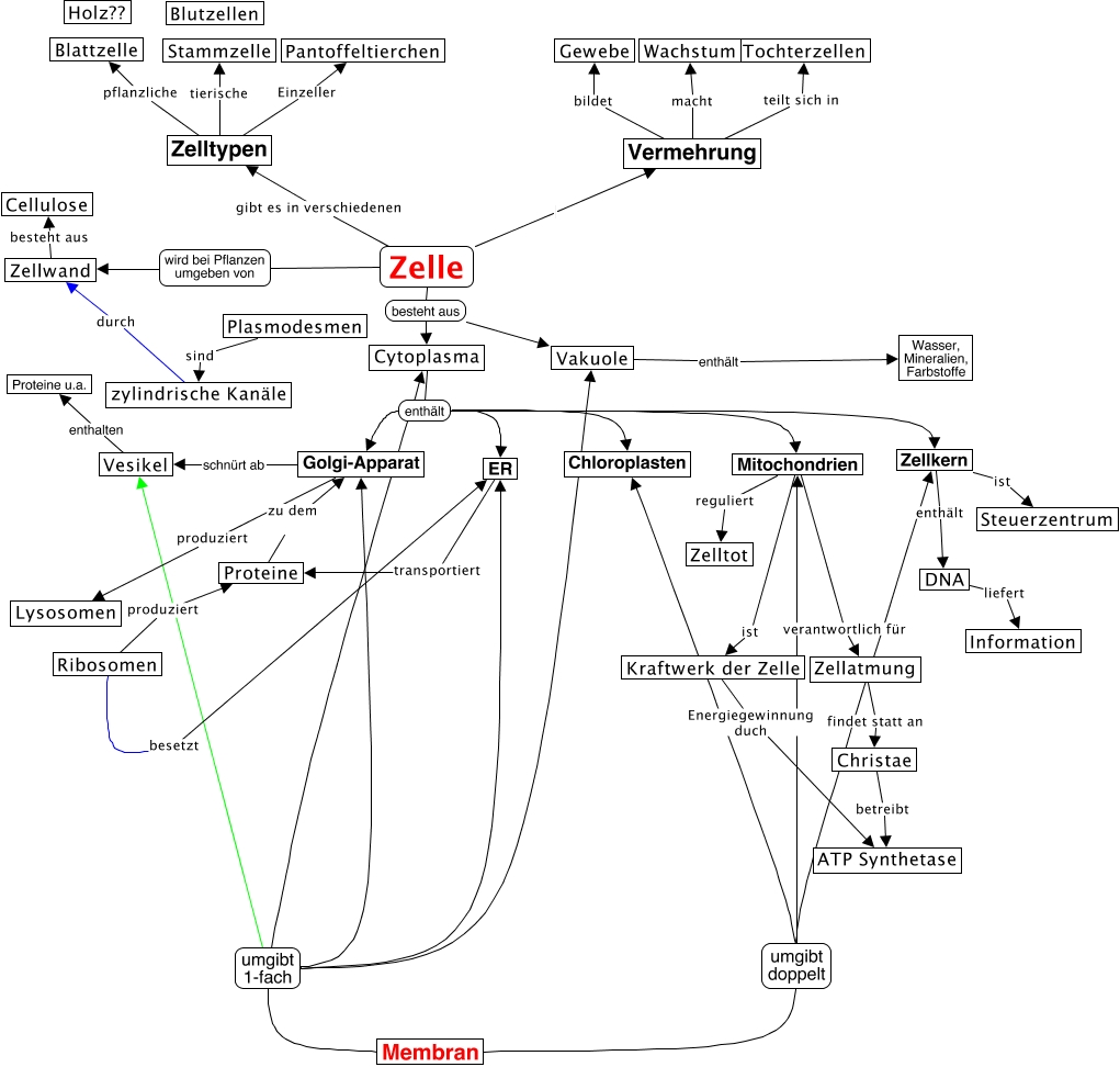 Dieses mit IHMC CmapTools erstellte CMap hat Informationen bezüglich: Zelle 3, Cytoplasma enthält Chloroplasten, Membran umgibt doppelt Zellkern, Ribosomen produziert Proteine, Zelltypen Einzeller Pantoffeltierchen, Membran umgibt 1-fach ER, Vesikel enthalten Proteine u.a., Christae betreibt ATP Synthetase, Zelle besteht aus Vakuole, DNA liefert Information, Vakuole enthält Wasser, Mineralien, Farbstoffe, Zelle Vermehrung, Mitochondrien verantwortlich für Zellatmung, Cytoplasma enthält ER, Zelltypen pflanzliche Blattzelle, Zellkern enthält DNA, Zelle gibt es in verschiedenen Zelltypen, Cytoplasma enthält Mitochondrien, Vermehrung bildet Gewebe, Zelle besteht aus Cytoplasma, Zelle wird bei Pflanzen umgeben von Zellwand