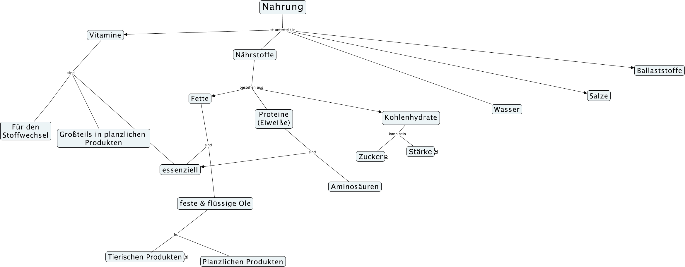 Dieses mit IHMC CmapTools erstellte CMap hat Informationen bezüglich: Nahrung 8d Gervalla Heinrichs2.cmap, Nahrung ist unterteilt in Ballaststoffe, Nährstoffe bestehen aus Fette, Fette sind essenziell, Kohlenhydrate kann sein Zucker, Milchprodukte z.B. Sahne, Disaccharide ist z.B. Traubenzucker, Milchprodukte z.B. Milch, Tierische Produkte können sein Fisch, Nährstoffe bestehen aus Proteine (Eiweiße), Polysacceride ist z.B. Rohrzucker, Vitamine sind Großteils in planzlichen Produkten, Tierische Produkte können sein Milchprodukte, Polysacceride ist z.B. Zucker in Zuckerrüben, Fette sind feste & flüssige Öle, Kohlenhydrate kann sein Stärke, Nahrung ist unterteilt in Vitamine, Nahrung ist unterteilt in Wasser, feste & flüssige Öle in Planzlichen Produkten, Proteine (Eiweiße) sind Aminosäuren, Tierische Produkte können sein Butter