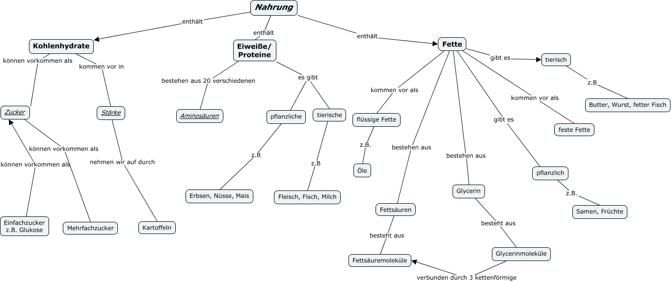 Dieses mit IHMC CmapTools erstellte CMap hat Informationen bezüglich: Nahrung8c_Fischer&Stieber, Fette bestehen aus Glycerin, flüssige Fette z.B. Öle, Kohlenhydrate kommen vor in Stärke, Nahrung enthält Fette, pflanzlich z.B. Samen, Früchte, Kohlenhydrate können vorkommen als Zucker, Glycerinmoleküle verbunden durch 3 kettenförmige Fettsäuremoleküle, Fette gibt es pflanzlich, Glycerin besteht aus Glycerinmoleküle, Nahrung enthält Kohlenhydrate, Eiweiße/ Proteine es gibt tierische, Fette kommen vor als feste Fette, Stärke nehmen wir auf durch Kartoffeln, Fette bestehen aus Fettsäuren, Einfachzucker z.B. Glukose können vorkommen als Zucker, tierische z.B Fleisch, Fisch, Milch, Fette kommen vor als flüssige Fette, Nahrung enthält Eiweiße/ Proteine, tierisch z.B Butter, Wurst, fetter Fisch, Fette gibt es tierisch
