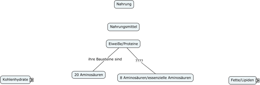 Dieses mit IHMC CmapTools erstellte CMap hat Informationen bezüglich: Nährstoffe,Comerford und Franz, Eiweiße/Proteine ???? 8 Aminosäuren/essenzielle Aminosäuren, Einfachzucker zb. Glucose wird zerlegt in Mehrfachzucker, Kohlenhydrate können vorkommen als Stärke, flüssige Öle können vorkommen als pflanzliche Fette, Zucker können vorkommen als Einfachzucker zb. Glucose, tierische Fette unterscheidt man in ungesättigte Fettsäuren, pflanzliche Fette unterscheidet man in ungesättigte Fettsäuren, Mehrfachzucker können vorkommen als Zucker, Kohlenhydrate können vorkommen als Zucker, Eiweiße/Proteine ihre Bausteine sind 20 Aminosäuren, feste Fette können vorkommen als pflanzliche Fette, pflanzliche Fette unterscheidet man in gesättigte Fettsäuren, Fette/Lipiden unterscheidet man in feste Fette, Fette/Lipiden unterscheidet man in flüssige Öle, feste Fette können vorkommen als tierische Fette, flüssige Öle können vorkommen als tierische Fette, tierische Fette unterscheidet man in gesättigte Fettsäuren