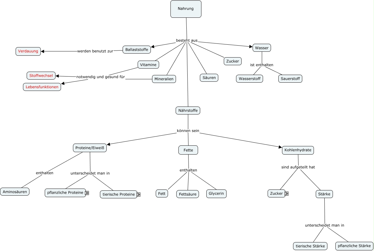 Dieses mit IHMC CmapTools erstellte CMap hat Informationen bezüglich: Nahrung 8d Färber Larbig, Nahrung besteht aus Vitamine, Fette enthalten Fett, Nährstoffe können sein Kohlenhydrate, Mineralien notwendig und gesund für Stoffwechsel, Wasser ist enthalten Wasserstoff, Nahrung besteht aus Nährstoffe, Nahrung besteht aus Säuren, Nahrung besteht aus Ballaststoffe, Ballaststoffe werden benutzt zur Verdauung, Proteine/Eiweiß enthalten Aminosäuren, Vitamine notwendig und gesund für Lebensfunktionen, Proteine/Eiweiß unterscheidet man in pflanzliche Proteine, Stärke unterscheidet man in pflanzliche Stärke, Nahrung besteht aus Mineralien, Wasser ist enthalten Sauerstoff, Proteine/Eiweiß unterscheidet man in tierische Proteine, Stärke unterscheidet man in tierische Stärke, Nährstoffe können sein Proteine/Eiweiß, Vitamine notwendig und gesund für Stoffwechsel, Kohlenhydrate sind aufgeteilt hat Stärke