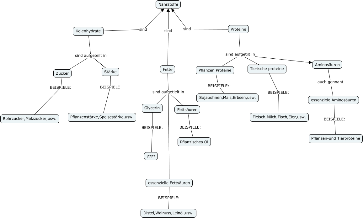 Dieses mit IHMC CmapTools erstellte CMap hat Informationen bezüglich: darius 8c nahrung, Zucker BEISPIELE: Rohrzucker,Malzzucker,usw., Proteine sind aufgetilt in Tierische proteine, Stärke sind aufgeteilt in Zucker, Stärke BEISPIELE Pflanzenstärke,Speisestärke,usw., Aminosäuren auch gennant essenziele Aminosäuren, Fette sind Nährstoffe, Pflanzen Proteine BEISPIELE: Sojabohnen,Mais,Erbsen,usw., Glycerin BEISPIELE: ????, essenziele Aminosäuren BEISPIELE: Pflanzen-und Tierproteine, Fette sind aufgetielt in Glycerin, Fettsäuren BEISPIELE: Pflanzisches Öl, Fette sind aufgetielt in essenzielle Fettsäuren, Kolenhydrate sind aufgeteilt in Stärke, Kolenhydrate sind Nährstoffe, essenzielle Fettsäuren BEISPIELE: Distel,Walnuss,Leinöl,usw., Fette sind aufgetielt in Fettsäuren, Proteine sind aufgetilt in Pflanzen Proteine, Proteine sind aufgetilt in Aminosäuren, Proteine sind Nährstoffe, Tierische proteine BEISPIELE: Fleisch,Milch,Fisch,Eier,usw.