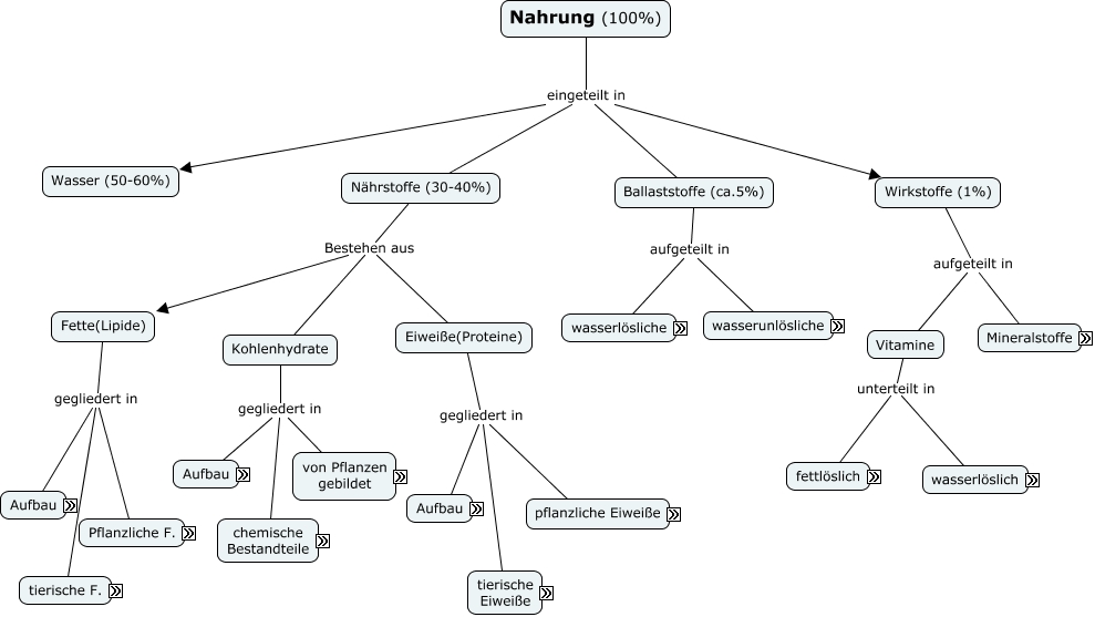 Dieses mit IHMC CmapTools erstellte CMap hat Informationen bezüglich: Nahrung 8d Bauer, Neff.cmap, Wirkstoffe (1%) aufgeteilt in Vitamine, Nahrung (100%) eingeteilt in Wasser (50-60%), Wirkstoffe (1%) aufgeteilt in Mineralstoffe, Eiweiße(Proteine) gegliedert in pflanzliche Eiweiße, Fette(Lipide) gegliedert in Pflanzliche F., z.B. ???? Arginin, Vitamine unterteilt in fettlöslich, z.B. ???? Phenylalanin, Fette(Lipide) gegliedert in tierische F., Nahrung (100%) eingeteilt in Ballaststoffe (ca.5%), Kohlenhydrate gegliedert in von Pflanzen gebildet, Fette(Lipide) gegliedert in Aufbau, Nahrung (100%) eingeteilt in Wirkstoffe (1%), Nahrung (100%) eingeteilt in Nährstoffe (30-40%), Ballaststoffe (ca.5%) aufgeteilt in wasserlösliche, Eiweiße(Proteine) gegliedert in Aufbau, Nährstoffe (30-40%) Bestehen aus Kohlenhydrate, Kohlenhydrate gegliedert in Aufbau, Vitamine unterteilt in wasserlöslich, z.B. ???? Leucin