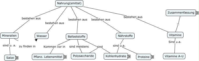 Dieses mit IHMC CmapTools erstellte CMap hat Informationen bezüglich: Nahrung 8d Junge Lamatsch.cmap, Ballaststoffe sind meistens Polysaccharide, Zusammenfassung ^ Vitamine, Nahrung(smittel) bestehen aus Wasser, Nährstoffe sind u.a. Proteine, Nahrung(smittel) bestehen aus Mineralien, Fette sind u.a. pflanzl. Fette, Mineralien zu finden in Wasser, Ballaststoffe Kommen vor in Pflanz. Lebensmittel, Polysaccharide sind Kohlenhydrate, Nährstoffe sind u.a. Kohlenhydrate, Ballaststoffe sind Kohlenhydrate, Fette sind u.a. tier. Fette, Vitamine Sind u.a. Vitamine A-U, Mineralien sind u. a. Salze, Nahrung(smittel) bestehen aus Vitamine, Nahrung(smittel) bestehen aus Ballaststoffe, Nahrung(smittel) bestehen aus Nährstoffe