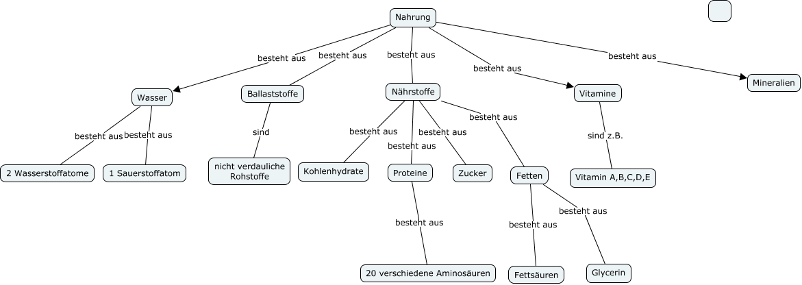 Dieses mit IHMC CmapTools erstellte CMap hat Informationen bezüglich: Nahrung 8d Nagel,Schulz, Wasser besteht aus 1 Sauerstoffatom, Nahrung besteht aus Mineralien, Vitamine sind z.B. Vitamin A,B,C,D,E, Nahrung besteht aus Vitamine, Nährstoffe besteht aus Kohlenhydrate, Nahrung besteht aus Wasser, Proteine besteht aus 20 verschiedene Aminosäuren, Fetten besteht aus Glycerin, Nährstoffe besteht aus Fetten, Ballaststoffe sind nicht verdauliche Rohstoffe, Nahrung besteht aus Ballaststoffe, Nahrung besteht aus Nährstoffe, Wasser besteht aus 2 Wasserstoffatome, Fetten besteht aus Fettsäuren, Nährstoffe besteht aus Proteine, Nährstoffe besteht aus Zucker