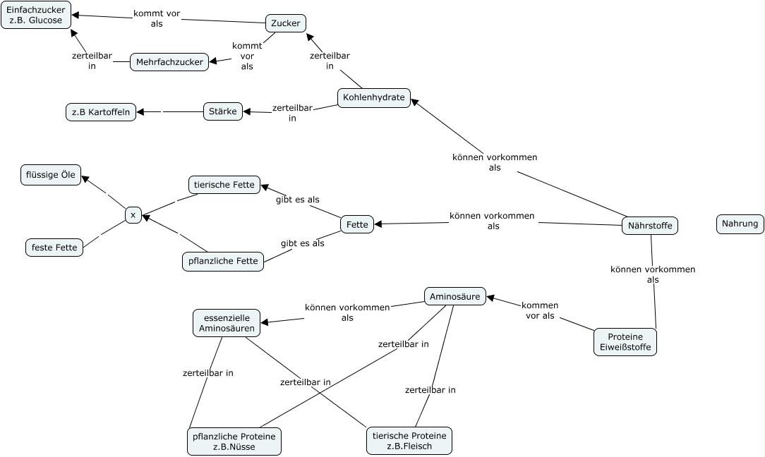 Dieses mit IHMC CmapTools erstellte CMap hat Informationen bezüglich: Ernährung-8c,Furchert & Schnor, Nährstoffe können vorkommen als Proteine Eiweißstoffe, Stärke z.B Kartoffeln, Nährstoffe können vorkommen als Fette, Fette gibt es als pflanzliche Fette, Aminosäure zerteilbar in pflanzliche Proteine z.B.Nüsse, Aminosäure können vorkommen als essenzielle Aminosäuren, Zucker kommt vor als Mehrfachzucker, essenzielle Aminosäuren zerteilbar in pflanzliche Proteine z.B.Nüsse, Proteine Eiweißstoffe kommen vor als Aminosäure, x flüssige Öle, Aminosäure zerteilbar in tierische Proteine z.B.Fleisch, Kohlenhydrate zerteilbar in Zucker, Fette gibt es als tierische Fette, Mehrfachzucker zerteilbar in Einfachzucker z.B. Glucose, Nährstoffe können vorkommen als Kohlenhydrate, Kohlenhydrate zerteilbar in Stärke, x feste Fette, pflanzliche Fette x, Zucker kommt vor als Einfachzucker z.B. Glucose, tierische Fette x