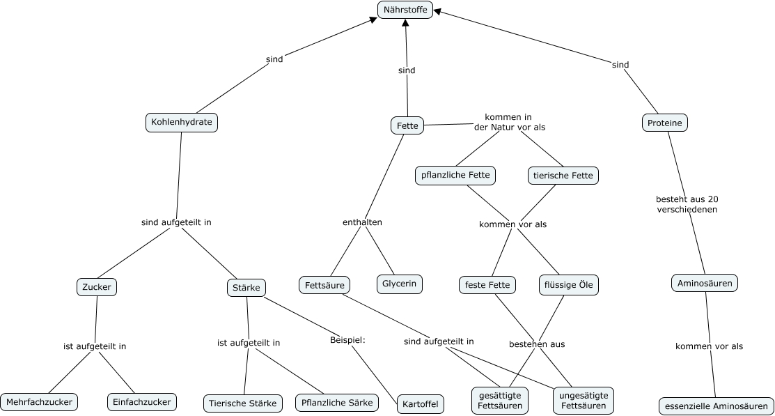 Dieses mit IHMC CmapTools erstellte CMap hat Informationen bezüglich: Nahrung 8c lokotsch scholtes, Kohlenhydrate sind aufgeteilt in Stärke, Kohlenhydrate sind Nährstoffe, Fette kommen in der Natur vor als pflanzliche Fette, Kohlenhydrate sind aufgeteilt in Zucker, Aminosäuren kommen vor als essenzielle Aminosäuren, Fettsäure sind aufgeteilt in ungesätigte Fettsäuren, pflanzliche Fette kommen vor als flüssige Öle, Zucker ist aufgeteilt in Einfachzucker, Fette enthalten Glycerin, Fette kommen in der Natur vor als tierische Fette, Stärke ist aufgeteilt in Tierische Stärke, Zucker ist aufgeteilt in Mehrfachzucker, feste Fette bestehen aus ungesätigte Fettsäuren, flüssige Öle bestehen aus gesättigte Fettsäuren, tierische Fette kommen vor als flüssige Öle, flüssige Öle bestehen aus ungesätigte Fettsäuren, Proteine sind Nährstoffe, Stärke Beispiel: Kartoffel, Proteine besteht aus 20 verschiedenen Aminosäuren, Stärke ist aufgeteilt in Pflanzliche Särke