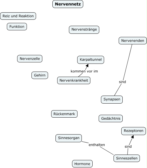 Dieses mit IHMC CmapTools erstellte CMap hat Informationen bezüglich: Nervennetz, Nervenenden sind Synapsen, Nervenkrankheit kommen vor im Karpaltunnel, Sinneszellen sind Rezeptoren, Sinnesorgan enthalten Sinneszellen