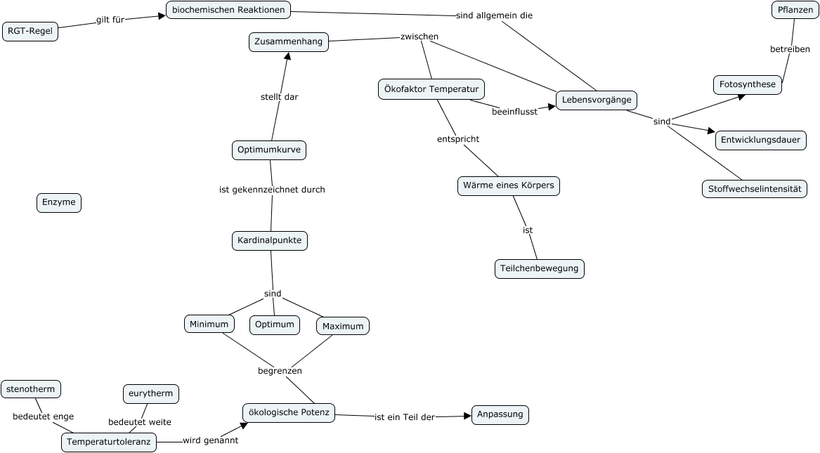 Dieses mit IHMC CmapTools erstellte CMap hat Informationen bezüglich: CMap Temperatur V1 GK 13_Q2, Kardinalpunkte sind Maximum, Zusammenhang zwischen Lebensvorgänge, Lebensvorgänge sind Fotosynthese, Temperaturtoleranz wird genannt ökologische Potenz, Ökofaktor Temperatur entspricht Wärme eines Körpers, Lebensvorgänge sind Entwicklungsdauer, stenotherm bedeutet enge Temperaturtoleranz, Wärme eines Körpers ist Teilchenbewegung, ökologische Potenz ist ein Teil der Anpassung, Kardinalpunkte sind Minimum, Optimumkurve ist gekennzeichnet durch Kardinalpunkte, RGT-Regel gilt für biochemischen Reaktionen, Lebensvorgänge sind Stoffwechselintensität, Kardinalpunkte sind Optimum, eurytherm bedeutet weite Temperaturtoleranz, Minimum begrenzen ökologische Potenz, biochemischen Reaktionen sind allgemein die Lebensvorgänge, Optimumkurve stellt dar Zusammenhang, Pflanzen betreiben Fotosynthese, Maximum begrenzen ökologische Potenz