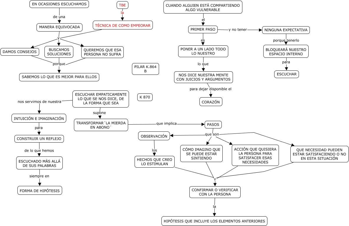 Este Cmap, tiene información relacionada con: Escuchar empáticamente, PASOS que son QUE NECESIDAD PUEDEN ESTAR SATISFACIENDO O NO EN ESTA SITUACIÓN, PASOS que son CÓMO IMAGINO QUE SE PUEDE ESTAR SINTIENDO, MANERA EQUIVOCADA y QUEREMOS QUE ESA PERSONA NO SUFRA, INTUICIÓN E IMAGINACIÓN para CONSTRUIR UN REFLEJO, BUSCAMOS SOLUCIONES porque SABEMOS LO QUE ES MEJOR PARA ELLOS, NOS DICE NUESTRA MENTE CON JUICIOS Y ARGUMENTOS para dejar disponible el CORAZÓN, MANERA EQUIVOCADA y BUSCAMOS SOLUCIONES, TÉCNICA DE COMO EMPEORAR y BUSCAMOS SOLUCIONES, NINGUNA EXPECTATIVA porque tenerlo BLOQUEARÁ NUESTRO ESPACIO INTERNO, QUEREMOS QUE ESA PERSONA NO SUFRA porque SABEMOS LO QUE ES MEJOR PARA ELLOS, CÓMO IMAGINO QUE SE PUEDE ESTAR SINTIENDO Y CONFIRMAR O VERIFICAR CON LA PERSONA, EN OCASIONES ESCUCHAMOS de una MANERA EQUIVOCADA, ACCIÓN QUE QUISIERA LA PERSONA PARA SATISFACER ESAS NECESIDADES Y CONFIRMAR O VERIFICAR CON LA PERSONA, BLOQUEARÁ NUESTRO ESPACIO INTERNO para ESCUCHAR, HECHOS QUE CREO LO ESTIMULAN Y CONFIRMAR O VERIFICAR CON LA PERSONA, TBE la TÉCNICA DE COMO EMPEORAR, TÉCNICA DE COMO EMPEORAR y QUEREMOS QUE ESA PERSONA NO SUFRA, MANERA EQUIVOCADA y DAMOS CONSEJOS, DAMOS CONSEJOS porque SABEMOS LO QUE ES MEJOR PARA ELLOS, OBSERVACIÓN los HECHOS QUE CREO LO ESTIMULAN