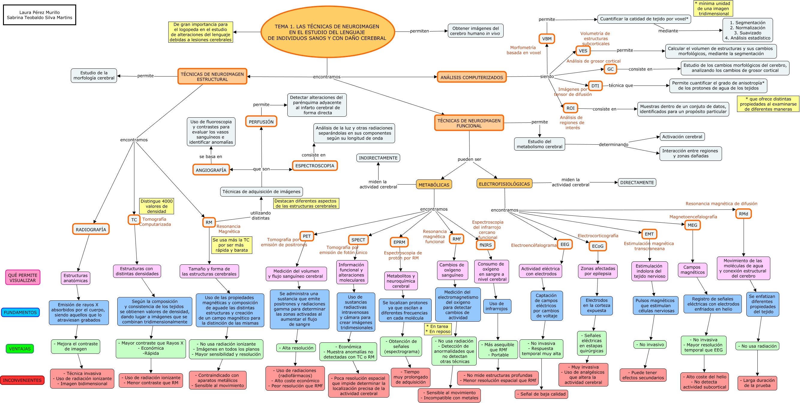 Este Cmap, tiene información relacionada con: Tema 1. Neuroimagen (sL), Emisión de rayos X absorbidos por el cuerpo, siendo aquellos que lo atraviesan grabados - Mejora el contraste de imagen, Se enfatizan diferentes propiedades del tejido - No usa radiación, - Económica - Muestra anomalías no detectadas con TC o RM - Poca resolución espacial que impide determinar la localización precisa de la actividad cerebral, ANÁLISIS COMPUTERIZADOS siendo VES, - No usa radiación ionizante - Imágenes en todos los planos - Mayor sensibilidad y resolución - Contraindicado con aparatos metálicos - Sensible al movimiento, Se administra una sustancia que emite positrones y radiaciones gamma para determinar las zonas activadas al aumentar el flujo de sangre - Alta resolución, ANÁLISIS COMPUTERIZADOS siendo GC, PET Medición del volumen y flujo sanguíneo cerebral, Uso de infrarrojos - Más asequible que RMf - Portable, - No usa radiación - Larga duración de la prueba, ESPECTROSCOPIA consiste en Análisis de la luz y otras radiaciones separándolas en sus componentes según su longitud de onda, VBM permite Cuantificar la catidad de tejido por voxel*, TÉCNICAS DE NEUROIMAGEN FUNCIONAL pueden ser ELECTROFISIOLÓGICAS, Estimulación indolora del tejido nervioso Pulsos magnéticos que estimulan células nerviosas, ELECTROFISIOLÓGICAS encontramos EEG, Estructuras anatómicas Emisión de rayos X absorbidos por el cuerpo, siendo aquellos que lo atraviesan grabados, METABÓLICAS encontramos RMf, ROI consiste en Muestras dentro de un conjuto de datos, identificados para un propósito particular, Tamaño y forma de las estructuras cerebrales Uso de las propiedades magnéticas y composición de aguade las distintas estructuras y creación de un campo magnético para la distinción de las mismas, - Obtención de señales (espectrograma) - Tiempo muy prolongado de adquisición
