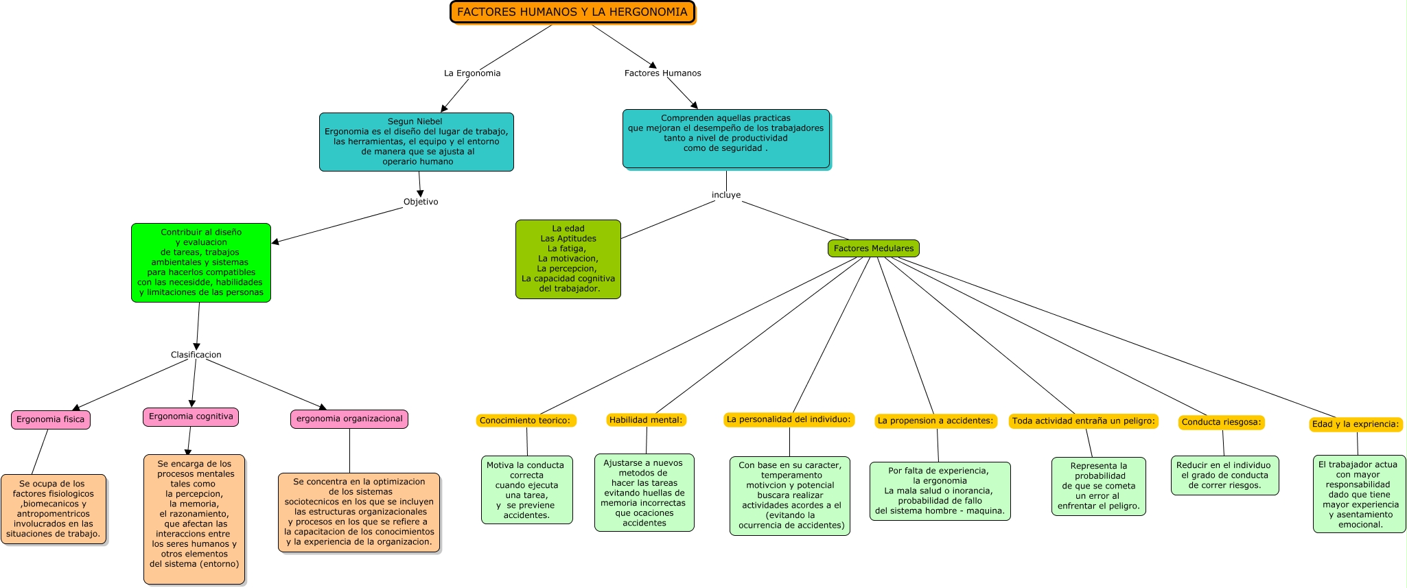 Este Cmap, tiene información relacionada con: Factores Humanos y Ergonomia, Factores Medulares Toda actividad entraña un peligro: Representa la probabilidad de que se cometa un error al enfrentar el peligro., FACTORES HUMANOS Y LA HERGONOMIA Factores Humanos Comprenden aquellas practicas que mejoran el desempeño de los trabajadores tanto a nivel de productividad como de seguridad ., Contribuir al diseño y evaluacion de tareas, trabajos ambientales y sistemas para hacerlos compatibles con las necesidde, habilidades y limitaciones de las personas Clasificacion Ergonomia fisica, Factores Medulares Habilidad mental: Ajustarse a nuevos metodos de hacer las tareas evitando huellas de memoria incorrectas que ocaciones accidentes, Comprenden aquellas practicas que mejoran el desempeño de los trabajadores tanto a nivel de productividad como de seguridad . incluye Factores Medulares, Ergonomia cognitiva ???? Se encarga de los procesos mentales tales como la percepcion, la memoria, el razonamiento, que afectan las interaccions entre los seres humanos y otros elementos del sistema (entorno), Factores Medulares Conducta riesgosa: Reducir en el individuo el grado de conducta de correr riesgos., Factores Medulares La personalidad del individuo: Con base en su caracter, temperamento motivcion y potencial buscara realizar actividades acordes a el (evitando la ocurrencia de accidentes), Factores Medulares La propension a accidentes: Por falta de experiencia, la ergonomia La mala salud o inorancia, probabilidad de fallo del sistema hombre - maquina., FACTORES HUMANOS Y LA HERGONOMIA La Ergonomia Segun Niebel Ergonomia es el diseño del lugar de trabajo, las herramientas, el equipo y el entorno de manera que se ajusta al operario humano, ergonomia organizacional ???? Se concentra en la optimizacion de los sistemas sociotecnicos en los que se incluyen las estructuras organizacionales y procesos en los que se refiere a la capacitacion de los conocimientos y la experiencia de la organizacion., Factores Medulares Edad y la expriencia: El trabajador actua con mayor responsabilidad dado que tiene mayor experiencia y asentamiento emocional., Contribuir al diseño y evaluacion de tareas, trabajos ambientales y sistemas para hacerlos compatibles con las necesidde, habilidades y limitaciones de las personas Clasificacion ergonomia organizacional, Contribuir al diseño y evaluacion de tareas, trabajos ambientales y sistemas para hacerlos compatibles con las necesidde, habilidades y limitaciones de las personas Clasificacion Ergonomia cognitiva, Comprenden aquellas practicas que mejoran el desempeño de los trabajadores tanto a nivel de productividad como de seguridad . incluye La edad Las Aptitudes La fatiga, La motivacion, La percepcion, La capacidad cognitiva del trabajador., Segun Niebel Ergonomia es el diseño del lugar de trabajo, las herramientas, el equipo y el entorno de manera que se ajusta al operario humano Objetivo Contribuir al diseño y evaluacion de tareas, trabajos ambientales y sistemas para hacerlos compatibles con las necesidde, habilidades y limitaciones de las personas, Factores Medulares Conocimiento teorico: Motiva la conducta correcta cuando ejecuta una tarea, y se previene accidentes., Ergonomia fisica ???? Se ocupa de los factores fisiologicos ,biomecanicos y antropomentricos involucrados en las situaciones de trabajo.