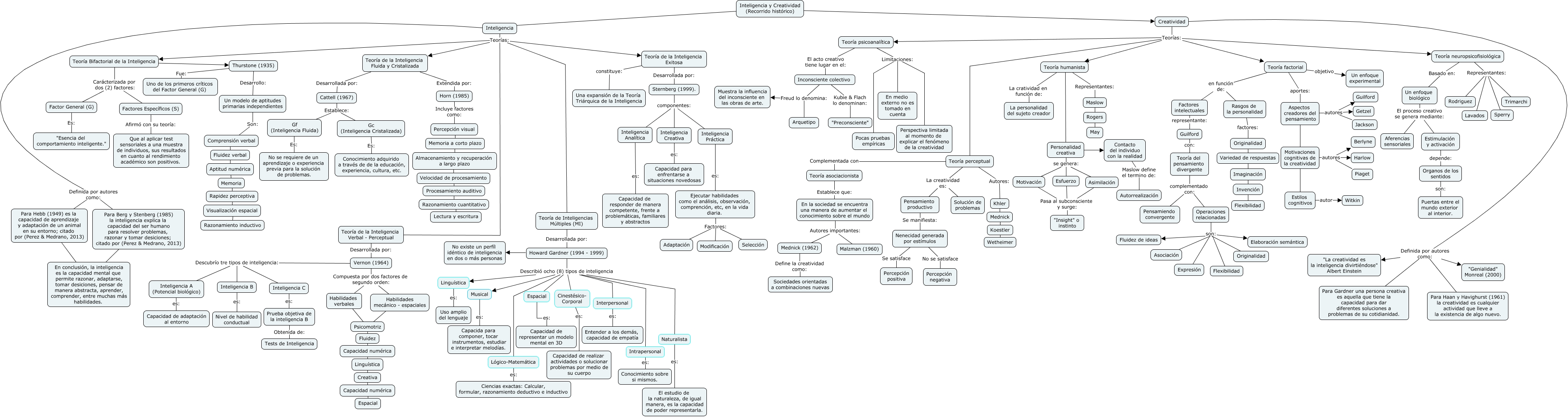 Este Cmap, tiene información relacionada con: Inteligencia y Creatividad, Guilford con: Teoría del pensamiento divergente, Factores Específicos (S) Afirmó con su teoría: Que al aplicar test sensoriales a una muestra de individuos, sus resultados en cuanto al rendimiento académico son positivos., Aspectos creadores del pensamiento autores Guilford, Teoría humanista La cratividad en función de: La personalidad del sujeto creador, Thurstone (1935) Fue: Uno de los primeros críticos del Factor General (G), Un modelo de aptitudes primarias independientes Son: Comprensión verbal, Para Hebb (1949) es la capacidad de aprendizaje y adaptación de un animal en su entorno; citado por (Perez & Medrano, 2013) ???? En conclusión, la inteligencia es la capacidad mental que permite razonar, adaptarse, tomar desiciones, pensar de manera abstracta, aprender, comprender, entre muchas más habilidades., Teoría factorial objetivo Un enfoque experimental, Teoría neuropsicofisiológica Representantes: Trimarchi, Rapidez perceptiva ???? Visualización espacial, Procesamiento auditivo ???? Razonamiento cuantitativo, Naturalista es: El estudio de la naturaleza, de igual manera, es la capacidad de poder representarla., Personalidad creativa se genera: Asimilación, Para Berg y Stenberg (1985) la inteligencia explica la capacidad del ser humano para resolver problemas, razonar y tomar desiciones; citado por (Perez & Medrano, 2013) Definida por autores como: Para Hebb (1949) es la capacidad de aprendizaje y adaptación de un animal en su entorno; citado por (Perez & Medrano, 2013), Teoría humanista Representantes: Maslow, Creatividad Teorías: Teoría humanista, Horn (1985) Incluye factores como: Percepción visual, Aspectos creadores del pensamiento autores Getzel, Maslow ???? Rogers, Teoría perceptual La creatividad es: Pensamiento productivo