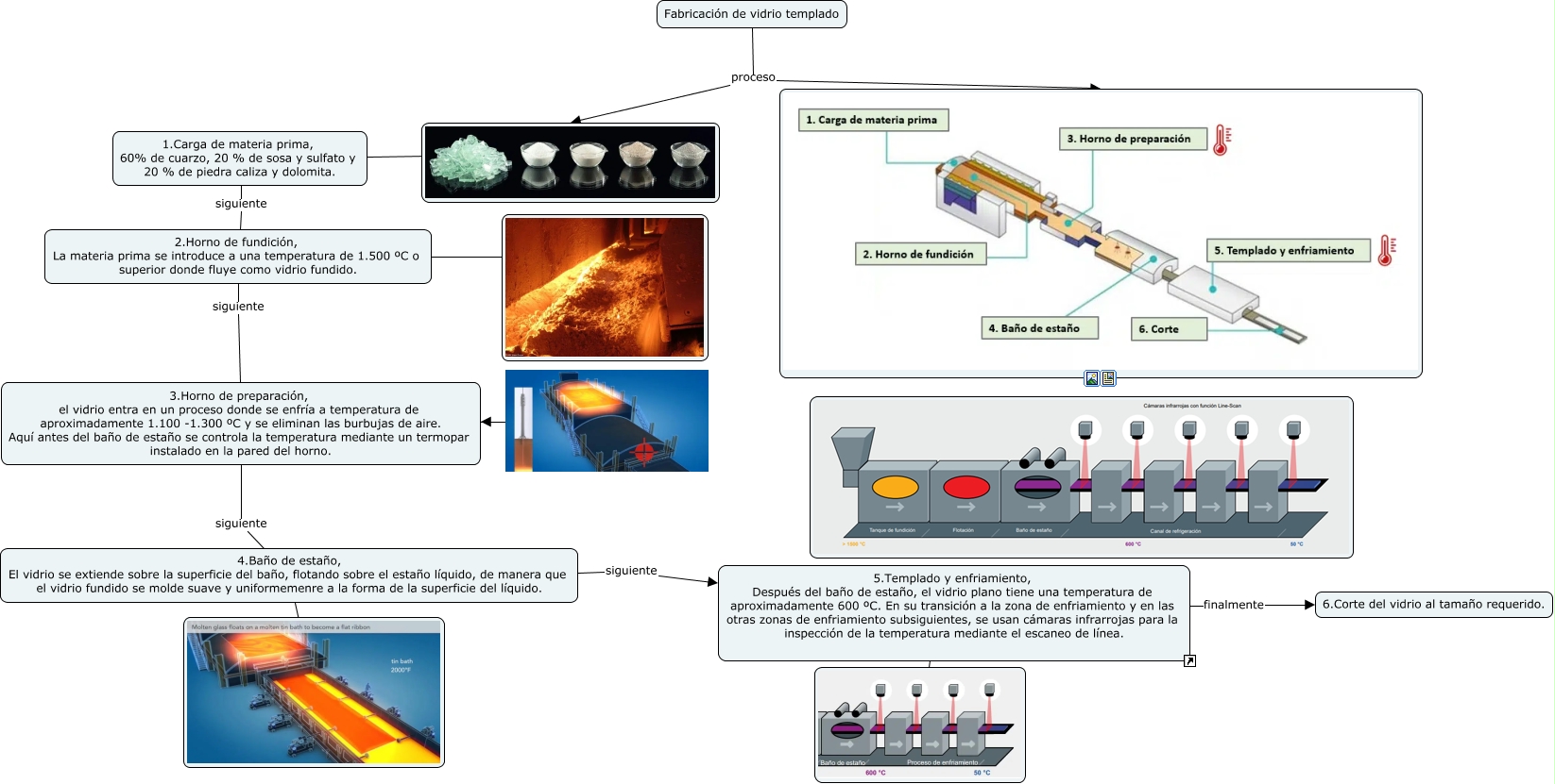 Este Cmap, tiene información relacionada con: Fabricación de vidrio flotado, 5.Templado y enfriamiento, Después del baño de estaño, el vidrio plano tiene una temperatura de aproximadamente 600 ºC. En su transición a la zona de enfriamiento y en las otras zonas de enfriamiento subsiguientes, se usan cámaras infrarrojas para la inspección de la temperatura mediante el escaneo de línea. finalmente 6.Corte del vidrio al tamaño requerido., 3.Horno de preparación, el vidrio entra en un proceso donde se enfría a temperatura de aproximadamente 1.100 -1.300 ºC y se eliminan las burbujas de aire. Aquí antes del baño de estaño se controla la temperatura mediante un termopar instalado en la pared del horno. siguiente 4.Baño de estaño, El vidrio se extiende sobre la superficie del baño, flotando sobre el estaño líquido, de manera que el vidrio fundido se molde suave y uniformemenre a la forma de la superficie del líquido., 1.Carga de materia prima, 60% de cuarzo, 20 % de sosa y sulfato y 20 % de piedra caliza y dolomita. siguiente 2.Horno de fundición, La materia prima se introduce a una temperatura de 1.500 ºC o superior donde fluye como vidrio fundido., Fabricación de vidrio templado proceso, 1.Carga de materia prima, 60% de cuarzo, 20 % de sosa y sulfato y 20 % de piedra caliza y dolomita. ????, 2.Horno de fundición, La materia prima se introduce a una temperatura de 1.500 ºC o superior donde fluye como vidrio fundido. ????, 4.Baño de estaño, El vidrio se extiende sobre la superficie del baño, flotando sobre el estaño líquido, de manera que el vidrio fundido se molde suave y uniformemenre a la forma de la superficie del líquido. siguiente 5.Templado y enfriamiento, Después del baño de estaño, el vidrio plano tiene una temperatura de aproximadamente 600 ºC. En su transición a la zona de enfriamiento y en las otras zonas de enfriamiento subsiguientes, se usan cámaras infrarrojas para la inspección de la temperatura mediante el escaneo de línea., 2.Horno de fundición, La materia prima se introduce a una temperatura de 1.500 ºC o superior donde fluye como vidrio fundido. siguiente 3.Horno de preparación, el vidrio entra en un proceso donde se enfría a temperatura de aproximadamente 1.100 -1.300 ºC y se eliminan las burbujas de aire. Aquí antes del baño de estaño se controla la temperatura mediante un termopar instalado en la pared del horno., Fabricación de vidrio templado proceso, 5.Templado y enfriamiento, Después del baño de estaño, el vidrio plano tiene una temperatura de aproximadamente 600 ºC. En su transición a la zona de enfriamiento y en las otras zonas de enfriamiento subsiguientes, se usan cámaras infrarrojas para la inspección de la temperatura mediante el escaneo de línea. ????, 4.Baño de estaño, El vidrio se extiende sobre la superficie del baño, flotando sobre el estaño líquido, de manera que el vidrio fundido se molde suave y uniformemenre a la forma de la superficie del líquido. ????