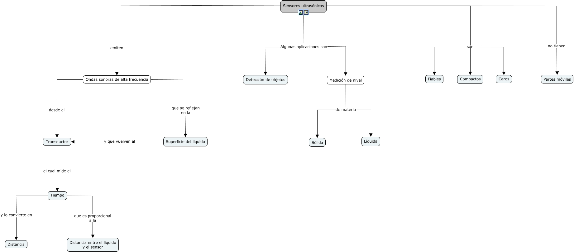 Este Cmap, tiene información relacionada con: 2.2.2 Sensores ultrasónicos, Ondas sonoras de alta frecuencia desde el Transductor, Superficie del líquido y que vuelven al Transductor, Sensores ultrasónicos Algunas aplicaciones son Detección de objetos, Sensores ultrasónicos Algunas aplicaciones son Medición de nivel, Medición de nivel de materia Sólida, Sensores ultrasónicos son Caros, Sensores ultrasónicos son Compactos, Sensores ultrasónicos emiten Ondas sonoras de alta frecuencia, Transductor el cual mide el Tiempo, Sensores ultrasónicos son Fiables, Tiempo que es proporcional a la Distancia entre el líquido y el sensor, Sensores ultrasónicos no tienen Partes móviles, Ondas sonoras de alta frecuencia que se reflejan en la Superficie del líquido, Tiempo y lo convierte en Distancia, Medición de nivel de materia Líquida