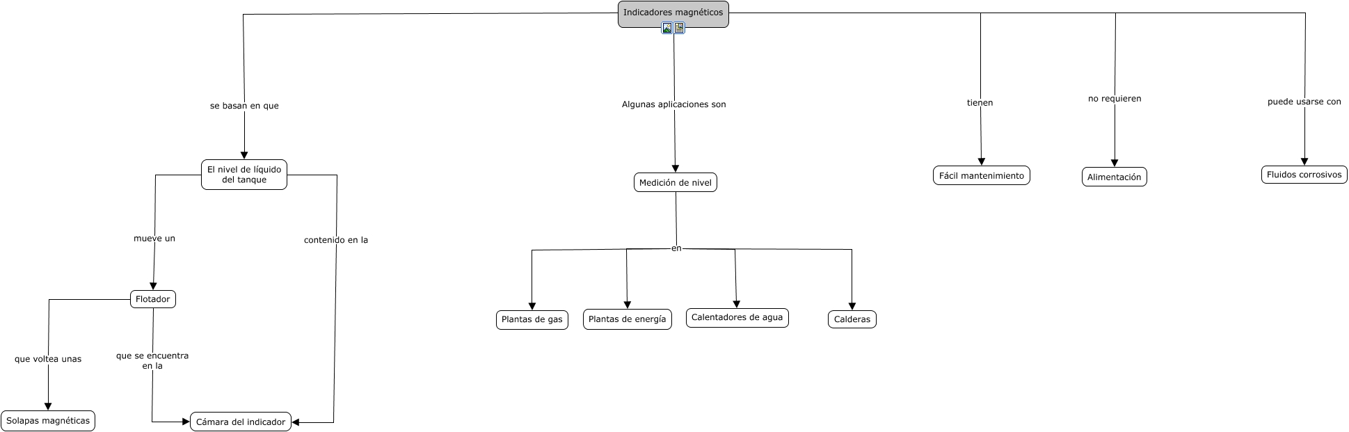 Este Cmap, tiene información relacionada con: 2.2.5 Indicadores magnéticos, El nivel de líquido del tanque mueve un Flotador, Indicadores magnéticos no requieren Alimentación, Medición de nivel en Calentadores de agua, Indicadores magnéticos se basan en que El nivel de líquido del tanque, Indicadores magnéticos Algunas aplicaciones son Medición de nivel, Flotador que voltea unas Solapas magnéticas, Indicadores magnéticos puede usarse con Fluidos corrosivos, Flotador que se encuentra en la Cámara del indicador, Medición de nivel en Plantas de energía, Medición de nivel en Calderas, Indicadores magnéticos tienen Fácil mantenimiento, Medición de nivel en Plantas de gas, El nivel de líquido del tanque contenido en la Cámara del indicador