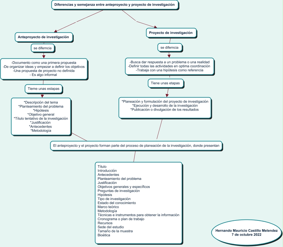 Este Cmap, tiene información relacionada con: Semejanzas y diferencias entre anteproyecto y el proyecto de investigación, -Documento como una primera propuesta -De organizar ideas y empezar a definir los objetivos -Una propuesta de proyecto no definida - Es algo informal Tieme unas estapas, -Busca dar respuesta a un problema o una realidad -Definir todas las actividades en optima coordinación -Trabaja con una hipótesis como referencia *Planeación y formulación del proyecto de investigación *Ejecución y desarrollo de la investigación *Publicación o divulgación de los resultados, Anteproyecto de investigación -Documento como una primera propuesta -De organizar ideas y empezar a definir los objetivos -Una propuesta de proyecto no definida - Es algo informal, Diferencias y semejanza entre anteproyecto y proyecto de investigación Proyecto de investigación, *Descripción del tema *Planteamiento del problema *Hipótesis *Objetivo general *Título tentativo de la investigación *Justificación *Antecedentes *Metodología El anteproyecto y el proyecto forman parte del proceso de planeación de la investigación, donde presentan, -Documento como una primera propuesta -De organizar ideas y empezar a definir los objetivos -Una propuesta de proyecto no definida - Es algo informal *Descripción del tema *Planteamiento del problema *Hipótesis *Objetivo general *Título tentativo de la investigación *Justificación *Antecedentes *Metodología, Proyecto de investigación se diferncia, Proyecto de investigación -Busca dar respuesta a un problema o una realidad -Definir todas las actividades en optima coordinación -Trabaja con una hipótesis como referencia, *Planeación y formulación del proyecto de investigación *Ejecución y desarrollo de la investigación *Publicación o divulgación de los resultados El anteproyecto y el proyecto forman parte del proceso de planeación de la investigación, donde presentan, El anteproyecto y el proyecto forman parte del proceso de planeación de la investigación, donde presentan Título Introducción Antecedentes Planteamiento del problema Justificación Objetivos generales y específicos Preguntas de investigación Hipótesis Tipo de investigación Estado del conocimiento Marco teórico Metodología Técnicas e instrumentos para obtener la información Cronograma o plan de trabajo Recursos Sede del estudio Tamaño de la muestra Bioética, Diferencias y semejanza entre anteproyecto y proyecto de investigación Anteproyecto de investigación