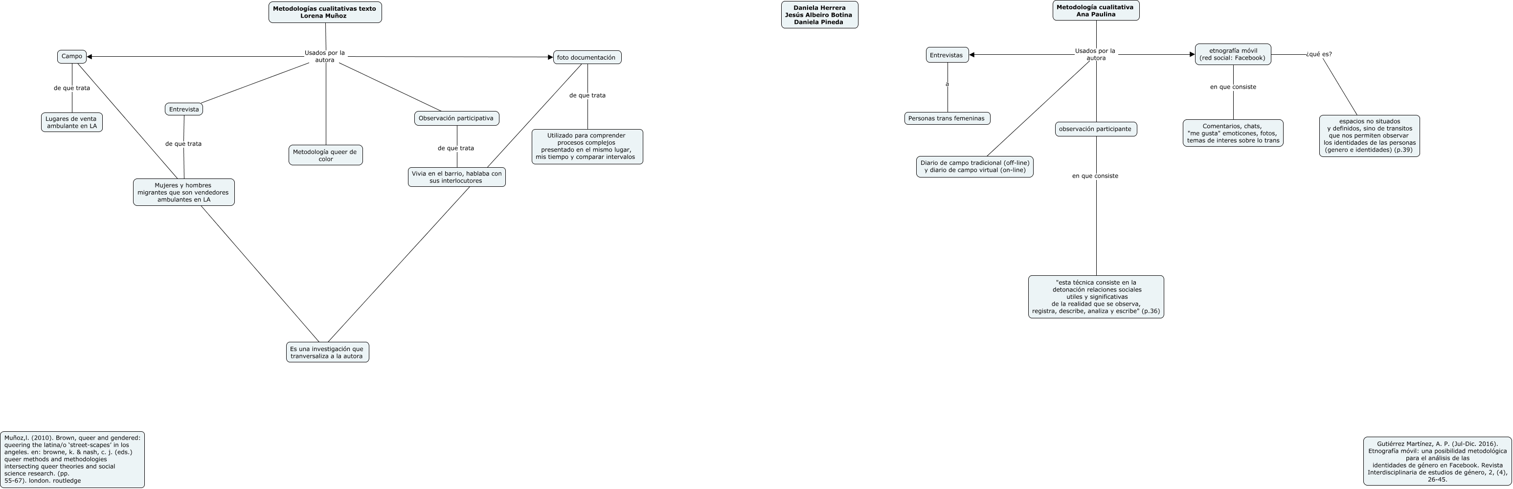 Este Cmap, tiene información relacionada con: Antropología del Cuerpo, Metodología cualitativa Ana Paulina Usados por la autora observación participante, Metodologías cualitativas texto Lorena Muñoz Usados por la autora Campo, Metodologías cualitativas texto Lorena Muñoz Usados por la autora Entrevista, Metodologías cualitativas texto Lorena Muñoz Usados por la autora foto documentación, Metodología cualitativa Ana Paulina Usados por la autora Diario de campo tradicional (off-line) y diario de campo virtual (on-line), Campo de que trata Lugares de venta ambulante en LA, etnografía móvil (red social: Facebook) en que consiste Comentarios, chats, "me gusta" emoticones, fotos, temas de interes sobre lo trans, etnografía móvil (red social: Facebook) ¿qué es? espacios no situados y definidos, sino de transitos que nos permiten observar los identidades de las personas (genero e identidades) (p.39), foto documentación de que trata Utilizado para comprender procesos complejos presentado en el mismo lugar, mis tiempo y comparar intervalos, observación participante en que consiste "esta técnica consiste en la detonación relaciones sociales utiles y significativas de la realidad que se observa, registra, describe, analiza y escribe" (p.36), Metodologías cualitativas texto Lorena Muñoz Usados por la autora Observación participativa, Entrevistas a Personas trans femeninas, Campo Es una investigación que tranversaliza a la autora, Metodología cualitativa Ana Paulina Usados por la autora etnografía móvil (red social: Facebook), Entrevista de que trata Mujeres y hombres migrantes que son vendedores ambulantes en LA, Observación participativa de que trata Vivia en el barrio, hablaba con sus interlocutores, Metodologías cualitativas texto Lorena Muñoz Usados por la autora Metodología queer de color, Metodología cualitativa Ana Paulina Usados por la autora Entrevistas, foto documentación Es una investigación que tranversaliza a la autora