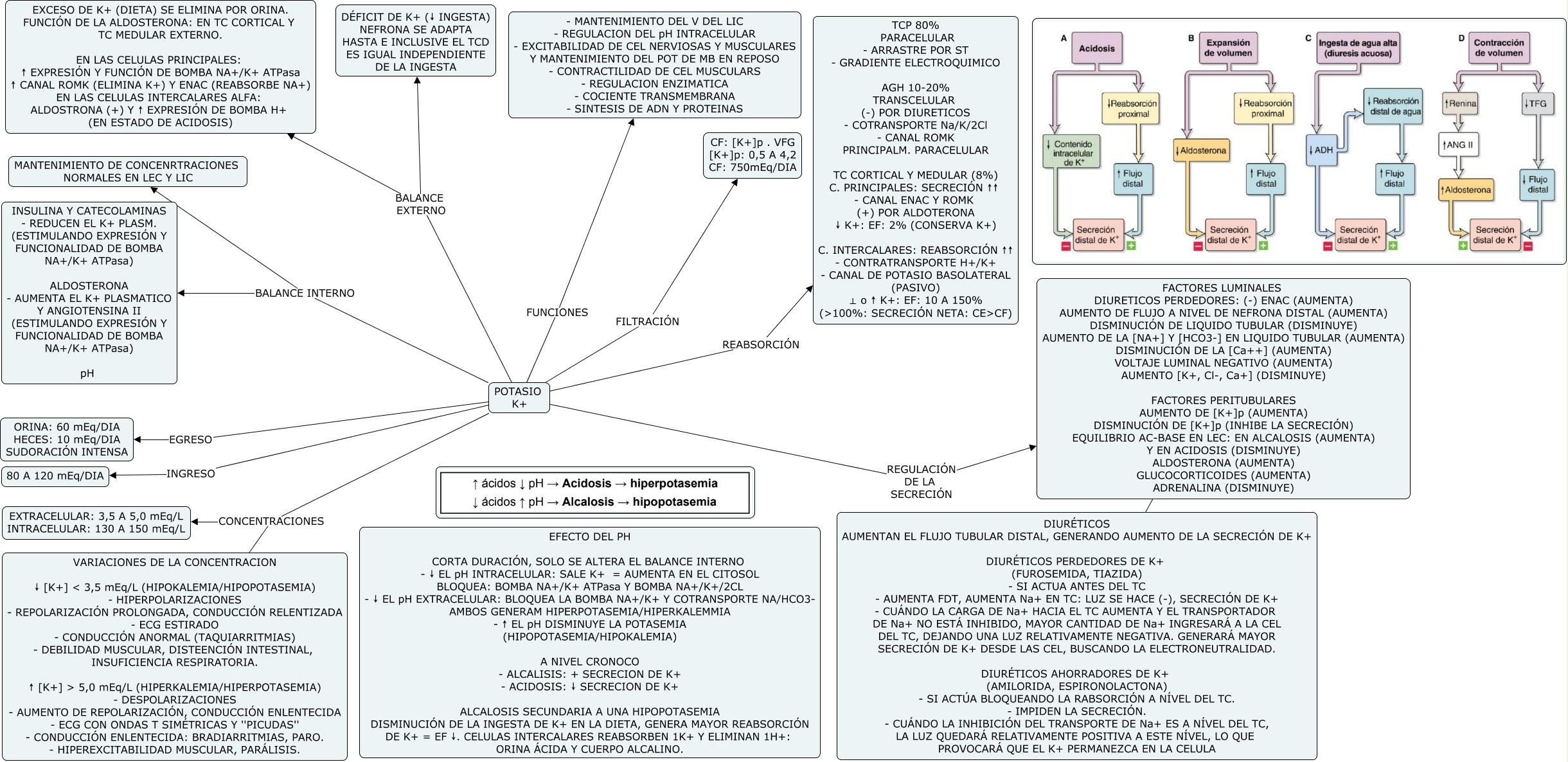 Esse mapa conceitual, produzido no IHMC CmapTools, tem a informação relacionada a: R2 K+, POTASIO K+ EGRESO ORINA: 60 mEq/DIA HECES: 10 mEq/DIA SUDORACIÓN INTENSA, POTASIO K+ REGULACIÓN DE LA SECRECIÓN FACTORES LUMINALES DIURETICOS PERDEDORES: (-) ENAC (AUMENTA) AUMENTO DE FLUJO A NIVEL DE NEFRONA DISTAL (AUMENTA) DISMINUCIÓN DE LIQUIDO TUBULAR (DISMINUYE) AUMENTO DE LA [NA+] Y [HCO3-] EN LIQUIDO TUBULAR (AUMENTA) DISMINUCIÓN DE LA [Ca++] (AUMENTA) VOLTAJE LUMINAL NEGATIVO (AUMENTA) AUMENTO [K+, Cl-, Ca+] (DISMINUYE) FACTORES PERITUBULARES AUMENTO DE [K+]p (AUMENTA) DISMINUCIÓN DE [K+]p (INHIBE LA SECRECIÓN) EQUILIBRIO AC-BASE EN LEC: EN ALCALOSIS (AUMENTA) Y EN ACIDOSIS (DISMINUYE) ALDOSTERONA (AUMENTA) GLUCOCORTICOIDES (AUMENTA) ADRENALINA (DISMINUYE), POTASIO K+ INGRESO 80 A 120 mEq/DIA, POTASIO K+ BALANCE INTERNO INSULINA Y CATECOLAMINAS - REDUCEN EL K+ PLASM. (ESTIMULANDO EXPRESIÓN Y FUNCIONALIDAD DE BOMBA NA+/K+ ATPasa) ALDOSTERONA - AUMENTA EL K+ PLASMATICO Y ANGIOTENSINA II (ESTIMULANDO EXPRESIÓN Y FUNCIONALIDAD DE BOMBA NA+/K+ ATPasa) pH, POTASIO K+ REABSORCIÓN TCP 80% PARACELULAR - ARRASTRE POR ST - GRADIENTE ELECTROQUIMICO AGH 10-20% TRANSCELULAR (-) POR DIURETICOS - COTRANSPORTE Na/K/2Cl - CANAL ROMK PRINCIPALM. PARACELULAR TC CORTICAL Y MEDULAR (8%) C. PRINCIPALES: SECRECIÓN ↑↑ - CANAL ENAC Y ROMK (+) POR ALDOTERONA ↓ K+: EF: 2% (CONSERVA K+) C. INTERCALARES: REABSORCIÓN ↑↑ - CONTRATRANSPORTE H+/K+ - CANAL DE POTASIO BASOLATERAL (PASIVO) ⊥ o ↑ K+: EF: 10 A 150% (%: SECRECIÓN NETA: CE>CF), POTASIO K+ BALANCE INTERNO MANTENIMIENTO DE CONCENRTRACIONES NORMALES EN LEC Y LIC, POTASIO K+ FILTRACIÓN CF: [K+]p . VFG [K+]p: 0,5 A 4,2 CF: 750mEq/DIA, POTASIO K+ CONCENTRACIONES VARIACIONES DE LA CONCENTRACION ↓ [K+] < 3,5 mEq/L (HIPOKALEMIA/HIPOPOTASEMIA) - HIPERPOLARIZACIONES - REPOLARIZACIÓN PROLONGADA, CONDUCCIÓN RELENTIZADA - ECG ESTIRADO - CONDUCCIÓN ANORMAL (TAQUIARRITMIAS) - DEBILIDAD MUSCULAR, DISTEENCIÓN INTESTINAL, INSUFICIENCIA RESPIRATORIA. ↑ [K+] > 5,0 mEq/L (HIPERKALEMIA/HIPERPOTASEMIA) - DESPOLARIZACIONES - AUMENTO DE REPOLARIZACIÓN, CONDUCCIÓN ENLENTECIDA - ECG CON ONDAS T SIMÉTRICAS Y ''PICUDAS'' - CONDUCCIÓN ENLENTECIDA: BRADIARRITMIAS, PARO. - HIPEREXCITABILIDAD MUSCULAR, PARÁLISIS., POTASIO K+ BALANCE EXTERNO EXCESO DE K+ (DIETA) SE ELIMINA POR ORINA. FUNCIÓN DE LA ALDOSTERONA: EN TC CORTICAL Y TC MEDULAR EXTERNO. EN LAS CELULAS PRINCIPALES: ↑ EXPRESIÓN Y FUNCIÓN DE BOMBA NA+/K+ ATPasa ↑ CANAL ROMK (ELIMINA K+) Y ENAC (REABSORBE NA+) EN LAS CELULAS INTERCALARES ALFA: ALDOSTRONA (+) Y ↑ EXPRESIÓN DE BOMBA H+ (EN ESTADO DE ACIDOSIS), POTASIO K+ CONCENTRACIONES EXTRACELULAR: 3,5 A 5,0 mEq/L INTRACELULAR: 130 A 150 mEq/L, POTASIO K+ BALANCE EXTERNO DÉFICIT DE K+ (↓ INGESTA) NEFRONA SE ADAPTA HASTA E INCLUSIVE EL TCD ES IGUAL INDEPENDIENTE DE LA INGESTA, FACTORES LUMINALES DIURETICOS PERDEDORES: (-) ENAC (AUMENTA) AUMENTO DE FLUJO A NIVEL DE NEFRONA DISTAL (AUMENTA) DISMINUCIÓN DE LIQUIDO TUBULAR (DISMINUYE) AUMENTO DE LA [NA+] Y [HCO3-] EN LIQUIDO TUBULAR (AUMENTA) DISMINUCIÓN DE LA [Ca++] (AUMENTA) VOLTAJE LUMINAL NEGATIVO (AUMENTA) AUMENTO [K+, Cl-, Ca+] (DISMINUYE) FACTORES PERITUBULARES AUMENTO DE [K+]p (AUMENTA) DISMINUCIÓN DE [K+]p (INHIBE LA SECRECIÓN) EQUILIBRIO AC-BASE EN LEC: EN ALCALOSIS (AUMENTA) Y EN ACIDOSIS (DISMINUYE) ALDOSTERONA (AUMENTA) GLUCOCORTICOIDES (AUMENTA) ADRENALINA (DISMINUYE) ???? DIURÉTICOS AUMENTAN EL FLUJO TUBULAR DISTAL, GENERANDO AUMENTO DE LA SECRECIÓN DE K+ DIURÉTICOS PERDEDORES DE K+ (FUROSEMIDA, TIAZIDA) - SI ACTUA ANTES DEL TC - AUMENTA FDT, AUMENTA Na+ EN TC: LUZ SE HACE (-), SECRECIÓN DE K+ - CUÁNDO LA CARGA DE Na+ HACIA EL TC AUMENTA Y EL TRANSPORTADOR DE Na+ NO ESTÁ INHIBIDO, MAYOR CANTIDAD DE Na+ INGRESARÁ A LA CEL DEL TC, DEJANDO UNA LUZ RELATIVAMENTE NEGATIVA. GENERARÁ MAYOR SECRECIÓN DE K+ DESDE LAS CEL, BUSCANDO LA ELECTRONEUTRALIDAD. DIURÉTICOS AHORRADORES DE K+ (AMILORIDA, ESPIRONOLACTONA) - SI ACTÚA BLOQUEANDO LA RABSORCIÓN A NÍVEL DEL TC. - IMPIDEN LA SECRECIÓN. - CUÁNDO LA INHIBICIÓN DEL TRANSPORTE DE Na+ ES A NÍVEL DEL TC, LA LUZ QUEDARÁ RELATIVAMENTE POSITIVA A ESTE NÍVEL, LO QUE PROVOCARÁ QUE EL K+ PERMANEZCA EN LA CELULA, POTASIO K+ FUNCIONES - MANTENIMIENTO DEL V DEL LIC - REGULACION DEL pH INTRACELULAR - EXCITABILIDAD DE CEL NERVIOSAS Y MUSCULARES Y MANTENIMIENTO DEL POT DE MB EN REPOSO - CONTRACTILIDAD DE CEL MUSCULARS - REGULACION ENZIMATICA - COCIENTE TRANSMEMBRANA - SINTESIS DE ADN Y PROTEINAS