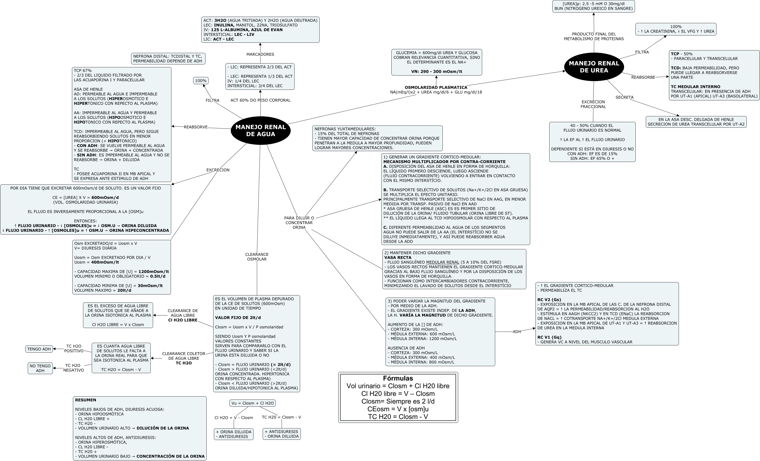 Esse mapa conceitual, produzido no IHMC CmapTools, tem a informação relacionada a: R3 - UREA Y H2O, - LIC: REPRESENTA 2/3 DEL ACT - LEC: REPRESENTA 1/3 DEL ACT IV: 1/4 DEL LEC INTERSTICIAL: 3/4 DEL LEC MARCADORES ACT: 3H2O (AGUA TRITIADA) Y 2H2O (AGUA DEUTRADA) LEC: INULINA, MANITOL, 22NA, TRIOSULFATO IV: 125 L-ALBUMINA, AZUL DE EVAN INTERSTICIAL: LEC - LIV LIC: ACT - LEC, MANEJO RENAL DE AGUA OSMOLARIDAD PLASMATICA NA(mEq/l)x2 + UREA mg/dl/6 + GLU mg/dl/18 MANEJO RENAL DE UREA, MANEJO RENAL DE AGUA PARA DILUIR O CONCENTRAR ORINA NEFRONAS YUXTAMEDULARES: - 15% DEL TOTAL DE NEFRONAS - TIENEN MAYOR CAPACIDAD DE CONCENTRAR ORINA PORQUE PENETRAN A LA MEDULA A MAYOR PROFUNDIDAD, PUEDEN LOGRAR MAYORES CONCENTRACIONES., MANEJO RENAL DE UREA SECRETA EN LA ASA DESC. DELGADA DE HENLE SECRECION DE UREA TRANSCELULAR POR UT-A2, ES EL VOLUMEN DE PLASMA DEPURADO DE LA CE DE SOLUTOS (600mOsm) EN UNIDAD DE TIEMPO VALOR FIJO DE 2lt/d Closm = Uosm x V / P osmolaridad SIENDO Uosm Y P osmolaridad VALORES CONSTANTES SIRVEN PARA COMPARARLO CON EL FLUJO URINARIO Y SABER SI LA URINA ESTA DILUIDA O NO - Closm = FLUJO URINARIO (= 2lt/d) - Closm > FLUJO URINARIO (ɚlt/d) ORINA CONCENTRADA. HIPERTONICA CON RESPECTO AL PLASMA) - Closm < FLUJO URINARIO (ɮlt/d) ORINA DILUIDA/HIPOTONICA AL PLASMA) CLEARANCE DE AGUA LIBRE Cl H2O LIBRE ES EL EXCESO DE AGUA LIBRE DE SOLUTOS QUE SE AÑADE A LA ORINA ISOTONICA AL PLASMA Cl H2O LIBRE = V x Closm, Vu = Closm + Cl H2O TC H20 = Closm - V + ANTIDIURESIS - ORINA DILUIDA, MANEJO RENAL DE UREA REABSORBE TCP - 50% - PARACELULAR Y TRANSCELULAR TCD: BAJA PERMEABILIDAD, PERO PUEDE LLEGAR A REABSORVERSE UNA PARTE TC MEDULAR INTERNO TRANSCELULAR: EN PRESENCIA DE ADH POR UT-A1 (APICAL) UT-A3 (BASOLATERAL), MANEJO RENAL DE AGUA ACT 60% DO PESO CORPORAL - LIC: REPRESENTA 2/3 DEL ACT - LEC: REPRESENTA 1/3 DEL ACT IV: 1/4 DEL LEC INTERSTICIAL: 3/4 DEL LEC, MANEJO RENAL DE AGUA EXCRECION Osm EXCRETADO/d = Uosm x V V= DIURESIS DIÁRIA Uosm = Osm EXCRETADO POR DIA / V Uosm = 400mOsm/lt - CAPACIDAD MAXIMA DE [U] = 1200mOsm/lt VOLUMEN MINIMO O OBLIGATORIO = 0.5lt/d - CAPACIDAD MINIMA DE [U] = 30mOsm/lt VOLUMEN MAXIMO = 20lt/d, MANEJO RENAL DE AGUA CLEARANCE OSMOLAR ES EL VOLUMEN DE PLASMA DEPURADO DE LA CE DE SOLUTOS (600mOsm) EN UNIDAD DE TIEMPO VALOR FIJO DE 2lt/d Closm = Uosm x V / P osmolaridad SIENDO Uosm Y P osmolaridad VALORES CONSTANTES SIRVEN PARA COMPARARLO CON EL FLUJO URINARIO Y SABER SI LA URINA ESTA DILUIDA O NO - Closm = FLUJO URINARIO (= 2lt/d) - Closm > FLUJO URINARIO (ɚlt/d) ORINA CONCENTRADA. HIPERTONICA CON RESPECTO AL PLASMA) - Closm < FLUJO URINARIO (ɮlt/d) ORINA DILUIDA/HIPOTONICA AL PLASMA), ES CUANTA AGUA LIBRE DE SOLUTOS LE FALTA A LA ORINA REAL PARA QUE SEA ISOTONICA AL PLASMA TC H2O = Closm - V TC H2O NEGATIVO NO TENGO ADH, MANEJO RENAL DE AGUA EXCRECION POR DIA TIENE QUE EXCRETAR 600mOsm/d DE SOLUTO. ES UN VALOR FIJO CE = [UREA] X V = 600mOsm/d (VOL. OSMOLARIDAD URINARIA) EL FLUJO ES INVERSAMENTE PROPORCIONAL A LA [OSM]u ENTONCES: ↑ FLUJO URINARIO - ↓ [OSMOLES]u = ↓ OSM.U → ORINA DILUIDA ↓ FLUJO URINARIO - ↑ [OSMOLES]u = ↑ OSM.U → ORINA HIPECONCENTRADA, MANEJO RENAL DE UREA FILTRA 100% - ↑ LA CREATININA, ↓ EL VFG Y ↑ UREA, ES CUANTA AGUA LIBRE DE SOLUTOS LE FALTA A LA ORINA REAL PARA QUE SEA ISOTONICA AL PLASMA TC H2O = Closm - V TC H2O POSITIVO TENGO ADH, MANEJO RENAL DE AGUA REABSORVE TCP 67% - 2/3 DEL LIQUIDO FILTRADO POR LAS ACUAPORINA I Y PARACELULAR ASA DE HENLE AD: PERMEABLE AL AGUA E IMPERMEABLE A LOS SOLUTOS (HIPEROSMOTICO E HIPERTONICO CON REPECTO AL PLASMA) AA: IMPERMEABLE AL AGUA Y PERMEABLE A LOS SOLUTOS (HIPOOSMOTICO E HIPOTONICO CON REPECTO AL PLASMA) TCD: IMPERMEABLE AL AGUA, PERO SIGUE REABSORBIENDO SOLUTOS EN MENOR PROPORCION (+ HIPOTONICO) - CON ADH: SE VUELVE PERMEABLE AL AGUA Y SE REABSORBE → ORINA + CONCENTRADA - SIN ADH: ES IMPERMEABLE AL AGUA Y NO SE REABSORBE → ORINA + DILUIDA TC - POSEE ACUAPORINA II EN MB APICAL Y SE EXPRESA ANTE ESTIMULO DE ADH, MANEJO RENAL DE UREA PRODUCTO FINAL DEL METABOLISMO DE PROTEINAS [UREA]p: 2.5 -5 mM O 30mg/dl BUN (NITROGENO UREICO EN SANGRE), MANEJO RENAL DE AGUA FILTRA 100%, 3) PODER VARIAR LA MAGNITUD DEL GRADIENTE - POR MEDIO DE LA ADH. - EL GRADIENTE EXISTE INDEP. DE LA ADH, LA H. VARÍA LA MAGNITUD DE DICHO GRADIENTE. AUMENTO DE LA [] DE ADH: - CORTEZA: 300 mOsm/L - MÉDULA EXTERNA: 600 mOsm/L - MÉDULA INTERNA: 1200 mOsm/L AUSENCIA DE ADH - CORTEZA: 300 mOsm/L - MÉDULA EXTERNA: 400 mOsm/L - MÉDULA INTERNA: 800 mOsm/L ADH - ↑ EL GRADIENTE CORTICO-MEDULAR - PERMEABILIZA EL TC RC V2 (Gs) - EXPOSICION EN LA MB APICAL DE LAS C. DE LA NEFRONA DISTAL DE AQP2 = ↑ LA PERMEABILIDAD/REABSORCION AL H2O - ESTIMULA EN AAGH (NKCC2) Y EN TCD (ENaC) LA REABSORCION DE NACL = ↑ COTRANSPORTE NA+/K+/2Cl MEDULA EXTERNA - EXPOSICION EN LA MB APICAL DE UT-A1 Y UT-A3 = ↑ REABSORCION DE UREA EN LA MEDULA INTERNA RC V1 (Gq) - GENERA VC A NIVEL DEL MUSCULO VASCULAR, Vu = Closm + Cl H2O Cl H2O = V - Closm + ORINA DILUIDA - ANTIDIURESIS, ES EL VOLUMEN DE PLASMA DEPURADO DE LA CE DE SOLUTOS (600mOsm) EN UNIDAD DE TIEMPO VALOR FIJO DE 2lt/d Closm = Uosm x V / P osmolaridad SIENDO Uosm Y P osmolaridad VALORES CONSTANTES SIRVEN PARA COMPARARLO CON EL FLUJO URINARIO Y SABER SI LA URINA ESTA DILUIDA O NO - Closm = FLUJO URINARIO (= 2lt/d) - Closm > FLUJO URINARIO (ɚlt/d) ORINA CONCENTRADA. HIPERTONICA CON RESPECTO AL PLASMA) - Closm < FLUJO URINARIO (ɮlt/d) ORINA DILUIDA/HIPOTONICA AL PLASMA) CLEARANCE COLETOR DE AGUA LIBRE TC H2O ES CUANTA AGUA LIBRE DE SOLUTOS LE FALTA A LA ORINA REAL PARA QUE SEA ISOTONICA AL PLASMA TC H2O = Closm - V