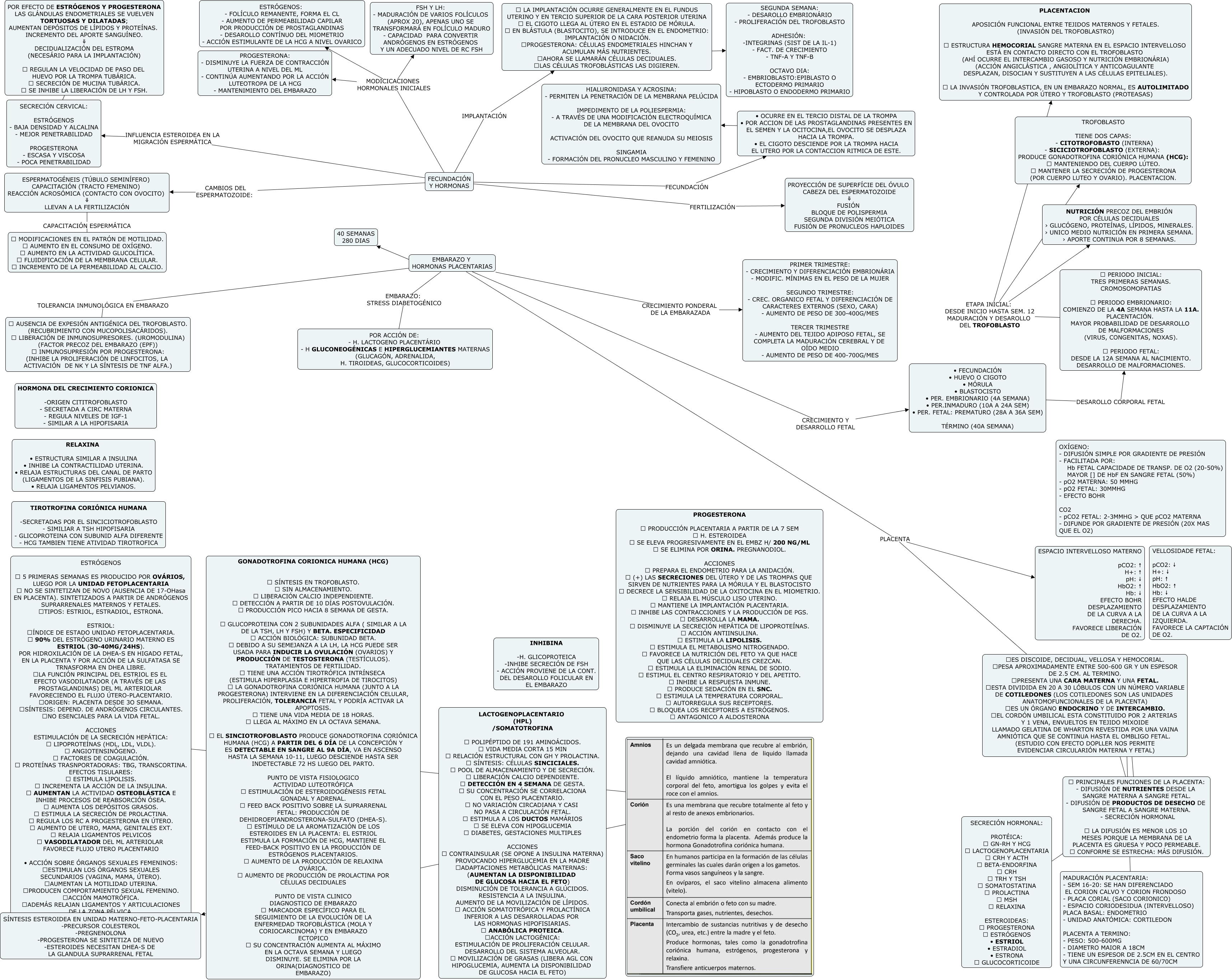 Este Cmap, tiene información relacionada con: PARTO Y LACTANCIA (FECUNDACIÓN Y H. PLACENTARIAS), PRINCIPALES FUNCIONES DE LA PLACENTA: - DIFUSIÓN DE NUTRIENTES DESDE LA SANGRE MATERNA A SANGRE FETAL. - DIFUSIÓN DE PRODUCTOS DE DESECHO DE SANGRE FETAL A SANGRE MATERNA. - SECRECIÓN HORMONAL LA DIFUSIÓN ES MENOR LOS 1O MESES PORQUE LA MEMBRANA DE LA PLACENTA ES GRUESA Y POCO PERMEABLE. CONFORME SE ESTRECHA: MÁS DIFUSIÓN. ???? MADURACIÓN PLACENTARIA: - SEM 16-20: SE HAN DIFERENCIADO EL CORION CALVO Y CORION FRONDOSO - PLACA CORIAL (SACO CORIONICO) - ESPACIO CORIODESIDUA (INTERVELLOSO) PLACA BASAL: ENDOMETRIO - UNIDAD ANATÓMICA: CORTILEDON PLACENTA A TERMINO: - PESO: 500-600MG - DIAMETRO MAIOR A 18CM - TIENE UN ESPESOR DE 2.5CM EN EL CENTRO Y UNA CIRCUNFERENNCIA DE 60/70CM, • OCURRE EN EL TERCIO DISTAL DE LA TROMPA • POR ACCION DE LAS PROSTAGLANDINAS PRESENTES EN EL SEMEN Y LA OCITOCINA,EL OVOCITO SE DESPLAZA HACIA LA TROMPA. • EL CIGOTO DESCIENDE POR LA TROMPA HACIA EL UTERO POR LA CONTACCION RITMICA DE ESTE. ???? HIALURONIDASA Y ACROSINA: - PERMITEN LA PENETRACIÓN DE LA MEMBRANA PELÚCIDA IMPEDIMENTO DE LA POLIESPERMIA: - A TRAVÉS DE UNA MODIFICACIÓN ELECTROQUÍMICA DE LA MEMBRANA DEL OVOCITO ACTIVACIÓN DEL OVOCITO QUE REANUDA SU MEIOSIS SINGAMIA - FORMACIÓN DEL PRONUCLEO MASCULINO Y FEMENINO, PERIODO INICIAL: TRES PRIMERAS SEMANAS. CROMOSOMOPATIAS PERIODO EMBRIONARIO: COMIENZO DE LA 4A SEMANA HASTA LA 11A. PLACENTACIÓN. MAYOR PROBABILIDAD DE DESARROLLO DE MALFORMACIONES (VIRUS, CONGENITAS, NOXAS). PERIODO FETAL: DESDE LA 12A SEMANA AL NACIMIENTO. DESARROLLO DE MALFORMACIONES. ETAPA INICIAL: DESDE INICIO HASTA SEM. 12 MADURACIÓN Y DESAROLLO DEL TROFOBLASTO NUTRICIÓN PRECOZ DEL EMBRIÓN POR CÉLULAS DECIDUALES › GLUCÓGENO, PROTEÍNAS, LÍPIDOS, MINERALES. › UNICO MEDIO NUTRICIÓN EN PRIMERA SEMANA. › APORTE CONTINUA POR 8 SEMANAS., ESPERMATOGÉNEIS (TÚBULO SEMINÍFERO) CAPACITACIÓN (TRACTO FEMENINO) REACCIÓN ACROSÓMICA (CONTACTO CON OVOCITO) ⇓ LLEVAN A LA FERTILIZACIÓN CAPACITACIÓN ESPERMÁTICA MODIFICACIONES EN EL PATRÓN DE MOTILIDAD. AUMENTO EN EL CONSUMO DE OXÍGENO. AUMENTO EN LA ACTIVIDAD GLUCOLÍTICA. FLUIDIFICACIÓN DE LA MEMBRANA CELULAR. INCREMENTO DE LA PERMEABILIDAD AL CALCIO., PRINCIPALES FUNCIONES DE LA PLACENTA: - DIFUSIÓN DE NUTRIENTES DESDE LA SANGRE MATERNA A SANGRE FETAL. - DIFUSIÓN DE PRODUCTOS DE DESECHO DE SANGRE FETAL A SANGRE MATERNA. - SECRECIÓN HORMONAL LA DIFUSIÓN ES MENOR LOS 1O MESES PORQUE LA MEMBRANA DE LA PLACENTA ES GRUESA Y POCO PERMEABLE. CONFORME SE ESTRECHA: MÁS DIFUSIÓN. ???? SECRECIÓN HORMONAL: PROTÉICA: GN-RH Y HCG LACTOGENOPLACENTARIA CRH Y ACTH BETA-ENDORFINA CRH TRH Y TSH SOMATOSTATINA PROLACTINA MSH RELAXINA ESTEROIDEAS: PROGESTERONA ESTRÓGENOS • ESTRIOL • ESTRADIOL • ESTRONA GLUCOCORTICOIDE, FECUNDACIÓN Y HORMONAS IMPLANTACIÓN LA IMPLANTACIÓN OCURRE GENERALMENTE EN EL FUNDUS UTERINO Y EN TERCIO SUPERIOR DE LA CARA POSTERIOR UTERINA EL CIGOTO LLEGA AL ÚTERO EN EL ESTADIO DE MÓRULA. EN BLÁSTULA (BLASTOCITO), SE INTRODUCE EN EL ENDOMETRIO: IMPLANTACIÓN O NIDACIÓN. PROGESTERONA: CÉLULAS ENDOMETRIALES HINCHAN Y ACUMULAN MÁS NUTRIENTES. AHORA SE LLAMARÁN CÉLULAS DECIDUALES. LAS CÉLULAS TROFOBLÁSTICAS LAS DIGIEREN., LA IMPLANTACIÓN OCURRE GENERALMENTE EN EL FUNDUS UTERINO Y EN TERCIO SUPERIOR DE LA CARA POSTERIOR UTERINA EL CIGOTO LLEGA AL ÚTERO EN EL ESTADIO DE MÓRULA. EN BLÁSTULA (BLASTOCITO), SE INTRODUCE EN EL ENDOMETRIO: IMPLANTACIÓN O NIDACIÓN. PROGESTERONA: CÉLULAS ENDOMETRIALES HINCHAN Y ACUMULAN MÁS NUTRIENTES. AHORA SE LLAMARÁN CÉLULAS DECIDUALES. LAS CÉLULAS TROFOBLÁSTICAS LAS DIGIEREN. ???? SEGUNDA SEMANA: - DESAROLLO EMBRIONÁRIO - PROLIFERACIÓN DEL TROFOBLASTO ADHESIÓN: -INTEGRINAS (SIST DE LA IL-1) - FACT. DE CRECIMIENTO - TNF-A Y TNF-B OCTAVO DIA: - EMBRIOBLASTO:EPIBLASTO O ECTODERMO PRIMARIO - HIPOBLASTO O ENDODERMO PRIMARIO, EMBARAZO Y HORMONAS PLACENTARIAS EMBARAZO: STRESS DIABETOGÉNICO POR ACCIÓN DE: - H. LACTOGENO PLACENTÁRIO - H GLUCONEOGÉNICAS E HIPERGLUCEMIANTES MATERNAS (GLUCAGÓN, ADRENALIDA, H. TIROIDEAS, GLUCOCORTICOIDES), • FECUNDACIÓN • HUEVO O CIGOTO • MÓRULA • BLASTOCISTO • PER. EMBRIONARIO (4A SEMANA) • PER.INMADURO (10A A 24A SEM) • PER. FETAL: PREMATURO (28A A 36A SEM) TÉRMINO (40A SEMANA) DESAROLLO CORPORAL FETAL PERIODO INICIAL: TRES PRIMERAS SEMANAS. CROMOSOMOPATIAS PERIODO EMBRIONARIO: COMIENZO DE LA 4A SEMANA HASTA LA 11A. PLACENTACIÓN. MAYOR PROBABILIDAD DE DESARROLLO DE MALFORMACIONES (VIRUS, CONGENITAS, NOXAS). PERIODO FETAL: DESDE LA 12A SEMANA AL NACIMIENTO. DESARROLLO DE MALFORMACIONES., FECUNDACIÓN Y HORMONAS MODICICACIONES HORMONALES INICIALES ESTRÓGENOS: - FOLÍCULO REMANENTE, FORMA EL CL - AUMENTO DE PERMEABILIDAD CAPILAR POR PRODUCCIÓN DE PROSTAGLANDINAS - DESAROLLO CONTÍNUO DEL MIOMETRIO - ACCIÓN ESTIMULANTE DE LA HCG A NIVEL OVARICO, EMBARAZO Y HORMONAS PLACENTARIAS PLACENTA ES DISCOIDE, DECIDUAL, VELLOSA Y HEMOCORIAL. PESA APROXIMADAMENTE ENTRE 500-600 GR Y UN ESPESOR DE 2.5 CM. AL TERMINO. PRESENTA UNA CARA MATERNA Y UNA FETAL. ESTA DIVIDIDA EN 20 A 30 LÓBULOS CON UN NÚMERO VARIABLE DE COTILEDONES (LOS COTILEDONES SON LAS UNIDADES ANATOMOFUNCIONALES DE LA PLACENTA) ES UN ÓRGANO ENDOCRINO Y DE INTERCAMBIO. EL CORDÓN UMBILICAL ESTA CONSTITUIDO POR 2 ARTERIAS Y 1 VENA, ENVUELTOS EN TEJIDO MIXOIDE LLAMADO GELATINA DE WHARTON REVESTIDA POR UNA VAINA AMNIÓTICA QUE SE CONTINUA HASTA EL OMBLIGO FETAL. (ESTUDIO CON EFECTO DOPLLER NOS PERMITE EVIDENCIAR CIRCULARIÓN MATERNA Y FETAL), ESTRÓGENOS 5 PRIMERAS SEMANAS ES PRODUCIDO POR OVÁRIOS, LUEGO POR LA UNIDAD FETOPLACENTARIA NO SE SINTETIZAN DE NOVO (AUSENCIA DE 17-OHasa EN PLACENTA). SINTETIZADOS A PARTIR DE ANDRÓGENOS SUPRARRENALES MATERNOS Y FETALES. TIPOS: ESTRIOL, ESTRADIOL, ESTRONA. ESTRIOL: ÍNDICE DE ESTADO UNIDAD FETOPLACENTARIA. 90% DEL ESTRÓGENO URINARIO MATERNO ES ESTRIOL (30-40MG/24HS). POR HIDROXILACIÓN DE LA DHEA-S EN HIGADO FETA